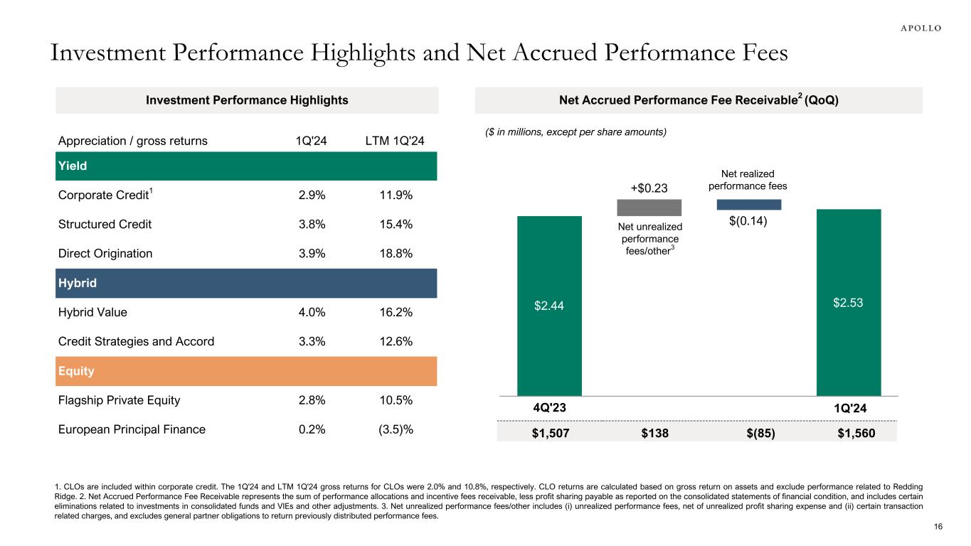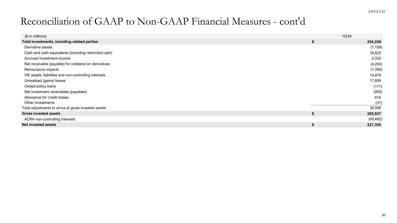 • "Net IRR" of accord series and the European principal finance funds represents the annualized return of a fund after management fees, performance fees allocated to the general partner and certain other expenses, calculated on investors that pay such fees. The terminal value is the net asset value as of the reporting date. Non-USD fund cash flows and residual values are converted to USD using the spot rate as of the reporting date. In addition, net IRR at the fund level will differ from that at the individual investor level as a result of, among other factors, timing of investor-level inflows and outflows. Net IRR does not represent the return to any fund investor. • "Net IRR" of a traditional private equity or the hybrid value funds represents the gross IRR applicable to a fund, including returns for related parties which may not pay fees or performance fees, net of management fees, certain expenses (including interest incurred or earned by the fund itself) and realized performance fees all offset to the extent of interest income, and measures returns at the fund level on amounts that, if distributed, would be paid to investors of the fund. The timing of cash flows applicable to investments, management fees and certain expenses, may be adjusted for the usage of a fund’s subscription facility. To the extent that a fund exceeds all requirements detailed within the applicable fund agreement, the estimated unrealized value is adjusted such that a percentage of up to 20.0% of the unrealized gain is allocated to the general partner of such fund, thereby reducing the balance attributable to fund investors. In addition, net IRR at the fund level will differ from that at the individual investor level as a result of, among other factors, timing of investor-level inflows and outflows. Net IRR does not represent the return to any fund investor. • "Net IRR" of infrastructure funds represents the cumulative cash flows in a fund (and not any one investor in the fund), on the basis of the actual timing of cash inflows received from and outflows paid to investors of the fund (assuming the ending net asset value as of March 31, 2024 or other date specified is paid to investors), excluding certain non-fee and non-performance fee bearing parties, and the return is annualized and compounded after management fees, performance fees, and certain other expenses (including interest incurred by the fund itself) and measures the returns to investors of the fund as a whole. Non-USD fund cash flows and residual values are converted to USD using the spot rate as of the reporting date. In addition, net IRR at the fund level will differ from that at the individual investor level as a result of, among other factors, timing of investor-level inflows and outflows. Net IRR does not represent the return to any fund investor. • “Other operating expenses” within the Principal Investing segment represents expenses incurred in the normal course of business and includes allocations of non-compensation expenses related to managing the business. • “Other operating expenses” within the Retirement Services segment represents expenses incurred in the normal course of business inclusive of compensation and non-compensation expenses, but does not include the proportionate share of the ACRA operating expenses associated with the non-controlling interests. • “Perpetual capital” refers to assets under management of certain vehicles with an indefinite duration, which assets may only be withdrawn under certain conditions or subject to certain limitations, including satisfying required hold periods or percentage limits on the amounts that may be redeemed over a particular period. The investment management, advisory or other service agreements with our perpetual capital vehicles may be terminated under certain circumstances. • “PII Compensation Ratio” is calculated as Principal investing compensation divided by the sum of realized performance fees and realized investment income. • “Principal investing compensation” within the Principal Investing segment represents realized performance compensation, distributions related to investment income and dividends, and includes allocations of certain compensation expenses related to managing the business. • “Realized Value” refers to all cash investment proceeds received by the relevant Apollo fund, including interest and dividends, but does not give effect to management fees, expenses, incentive compensation or performance fees to be paid by such Apollo fund. • “Redding Ridge” refers to Redding Ridge Asset Management, LLC and its subsidiaries, which is a standalone, self-managed asset management business established in connection with risk retention rules that manages CLOs and retains the required risk retention interests. • “Remaining Cost” represents the initial investment of the fund in a portfolio investment, reduced for any return of capital distributed to date on such portfolio investment. • “Total Invested Capital” refers to the aggregate cash invested by the relevant Apollo fund and includes capitalized costs relating to investment activities, if any, but does not give effect to cash pending investment or available for reserves and excludes amounts, if any, invested on a financed basis with leverage facilities. • “Total Value” represents the sum of the total Realized Value and Unrealized Value of investments. • “Unrealized Value” refers to the fair value consistent with valuations determined in accordance with GAAP, for investments not yet realized and may include payments in kind, accrued interest and dividends receivable, if any, and before the effect of certain taxes. In addition, amounts include committed and funded amounts for certain investments. • “Vintage Year” refers to the year in which a fund’s final capital raise occurred, or, for certain funds, the year of a fund’s effective date or the year in wh