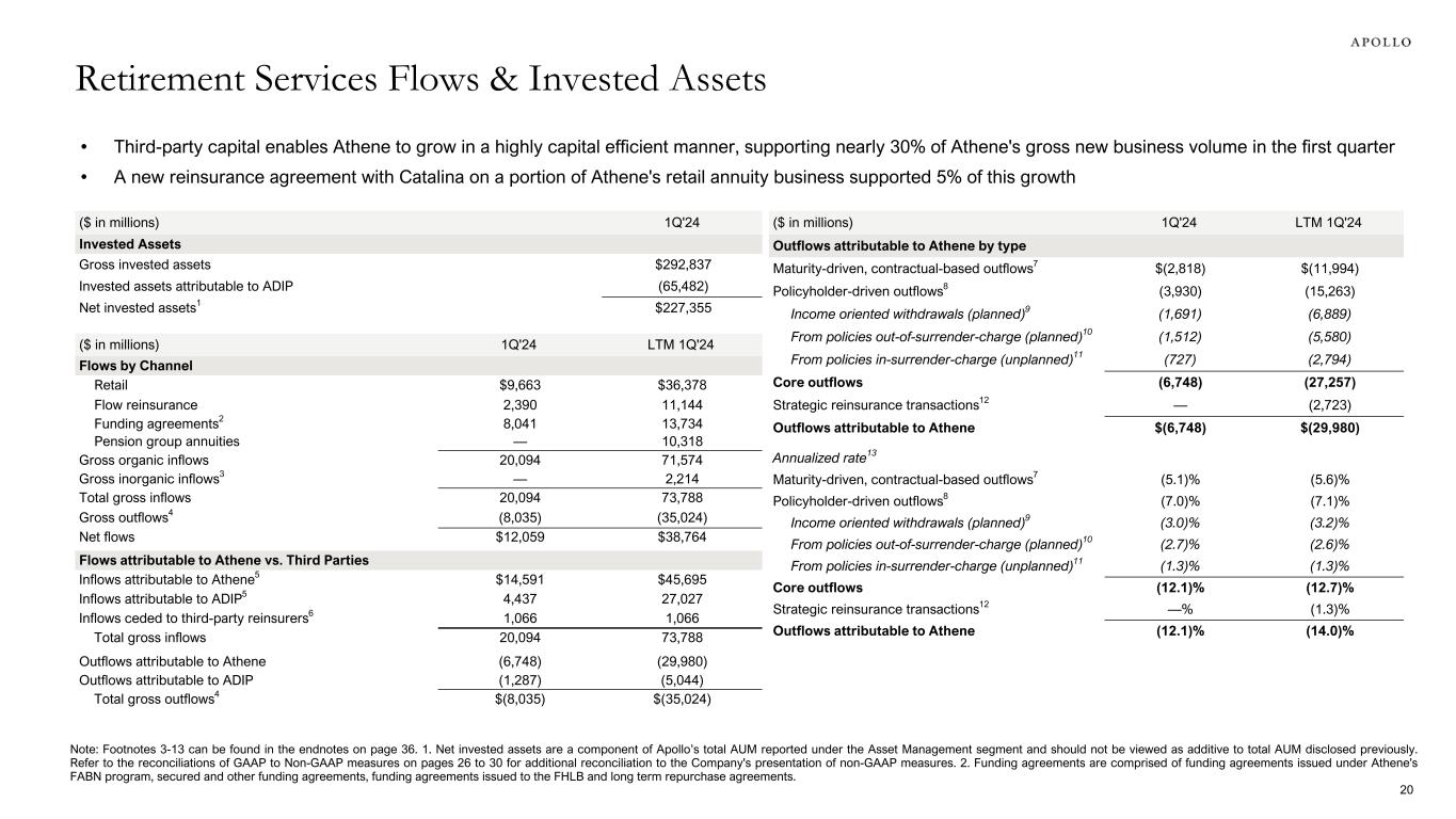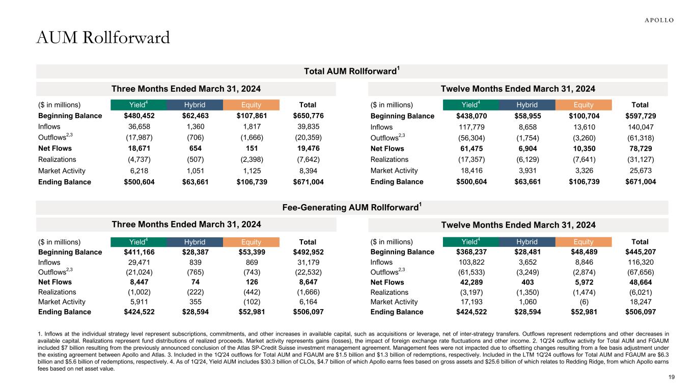 ($ in millions) Yield4 Hybrid Equity Total Beginning Balance $480,452 $62,463 $107,861 $650,776 Inflows 36,658 1,360 1,817 39,835 Outflows2,3 (17,987) (706) (1,666) (20,359) Net Flows 18,671 654 151 19,476 Realizations (4,737) (507) (2,398) (7,642) Market Activity 6,218 1,051 1,125 8,394 Ending Balance $500,604 $63,661 $106,739 $671,004 Three Months Ended March 31, 2024 ($ in millions) Yield4 Hybrid Equity Total Beginning Balance $438,070 $58,955 $100,704 $597,729 Inflows 117,779 8,658 13,610 140,047 Outflows2,3 (56,304) (1,754) (3,260) (61,318) Net Flows 61,475 6,904 10,350 78,729 Realizations (17,357) (6,129) (7,641) (31,127) Market Activity 18,416 3,931 3,326 25,673 Ending Balance $500,604 $63,661 $106,739 $671,004 Twelve Months Ended March 31, 2024 ($ in millions) Yield4 Hybrid Equity Total Beginning Balance $411,166 $28,387 $53,399 $492,952 Inflows 29,471 839 869 31,179 Outflows2,3 (21,024) (765) (743) (22,532) Net Flows 8,447 74 126 8,647 Realizations (1,002) (222) (442) (1,666) Market Activity 5,911 355 (102) 6,164 Ending Balance $424,522 $28,594 $52,981 $506,097 Three Months Ended March 31, 2024 ($ in millions) Yield4 Hybrid Equity Total Beginning Balance $368,237 $28,481 $48,489 $445,207 Inflows 103,822 3,652 8,846 116,320 Outflows2,3 (61,533) (3,249) (2,874) (67,656) Net Flows 42,289 403 5,972 48,664 Realizations (3,197) (1,350) (1,474) (6,021) Market Activity 17,193 1,060 (6) 18,247 Ending Balance $424,522 $28,594 $52,981 $506,097 Twelve Months Ended March 31, 2024 Fee-Generating AUM Rollforward1 Total AUM Rollforward1 1. Inflows at the individual strategy level represent subscriptions, commitments, and other increases in available capital, such as acquisitions or leverage, net of inter-strategy transfers. Outflows represent redemptions and other decreases in available capital. Realizations represent fund distributions of realized proceeds. Market activity represents gains (losses), the impact of foreign exchange rate fluctuations and other income. 2. 1Q'24 outflow activity for Total AUM and FGAUM included $7 billion resulting from the previously announced conclusion of the Atlas SP-Credit Suisse investment management agreement. Management fees were not impacted due to offsetting changes resulting from a fee basis adjustment under the existing agreement between Apollo and Atlas. 3. Included in the 1Q'24 outflows for Total AUM and FGAUM are $1.5 billion and $1.3 billion of redemptions, respectively. Included in the LTM 1Q'24 outflows for Total AUM and FGAUM are $6.3 billion and $5.6 billion of redemptions, respectively. 4. As of 1Q'24, Yield AUM includes $30.3 billion of CLOs, $4.7 billion of which Apollo earns fees based on gross assets and $25.6 billion of which relates to Redding Ridge, from which Apollo earns fees based on net asset value. AUM Rollforward 19