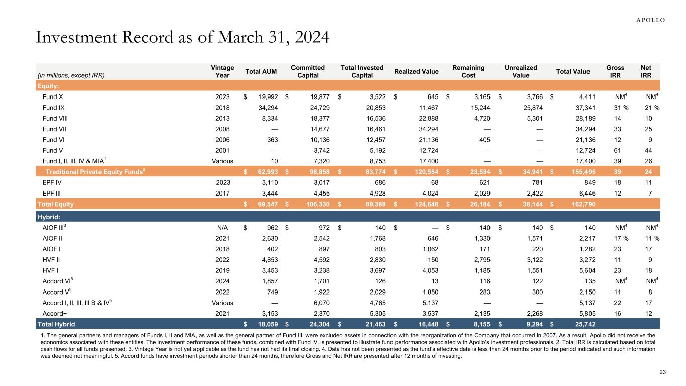 (in millions, except IRR) Vintage Year Total AUM Committed Capital Total Invested Capital Realized Value Remaining Cost Unrealized Value Total Value Gross IRR Net IRR Equity: Fund X 2023 $ 19,992 $ 19,877 $ 3,522 $ 645 $ 3,165 $ 3,766 $ 4,411 NM4 NM4 Fund IX 2018 34,294 24,729 20,853 11,467 15,244 25,874 37,341 31 % 21 % Fund VIII 2013 8,334 18,377 16,536 22,888 4,720 5,301 28,189 14 10 Fund VII 2008 — 14,677 16,461 34,294 — — 34,294 33 25 Fund VI 2006 363 10,136 12,457 21,136 405 — 21,136 12 9 Fund V 2001 — 3,742 5,192 12,724 — — 12,724 61 44 Fund I, II, III, IV & MIA1 Various 10 7,320 8,753 17,400 — — 17,400 39 26 Traditional Private Equity Funds2 $ 62,993 $ 98,858 $ 83,774 $ 120,554 $ 23,534 $ 34,941 $ 155,495 39 24 EPF IV 2023 3,110 3,017 686 68 621 781 849 18 11 EPF III 2017 3,444 4,455 4,928 4,024 2,029 2,422 6,446 12 7 Total Equity $ 69,547 $ 106,330 $ 89,388 $ 124,646 $ 26,184 $ 38,144 $ 162,790 Hybrid: AIOF III3 N/A $ 962 $ 972 $ 140 $ — $ 140 $ 140 $ 140 NM4 NM4 AIOF II 2021 2,630 2,542 1,768 646 1,330 1,571 2,217 17 % 11 % AIOF I 2018 402 897 803 1,062 171 220 1,282 23 17 HVF II 2022 4,853 4,592 2,830 150 2,795 3,122 3,272 11 9 HVF I 2019 3,453 3,238 3,697 4,053 1,185 1,551 5,604 23 18 Accord VI5 2024 1,857 1,701 126 13 116 122 135 NM4 NM4 Accord V5 2022 749 1,922 2,029 1,850 283 300 2,150 11 8 Accord I, II, III, III B & IV5 Various — 6,070 4,765 5,137 — — 5,137 22 17 Accord+ 2021 3,153 2,370 5,305 3,537 2,135 2,268 5,805 16 12 Total Hybrid $ 18,059 $ 24,304 $ 21,463 $ 16,448 $ 8,155 $ 9,294 $ 25,742 Investment Record as of March 31, 2024 23 1. The general partners and managers of Funds I, II and MIA, as well as the general partner of Fund III, were excluded assets in connection with the reorganization of the Company that occurred in 2007. As a result, Apollo did not receive the economics associated with these entities. The investment performance of these funds, combined with Fund IV, is presented to illustrate fund performance associated with Apollo’s investment professionals. 2. Total IRR is calculated based on total cash flows for all funds presented. 3. Vintage Year is not yet applicable as the fund has not had its final closing. 4. Data has not been presented as the fund’s effective date is less than 24 months prior to the period indicated and such information was deemed not meaningful. 5. Accord funds have investment periods shorter than 24 months, therefore Gross and Net IRR are presented after 12 months of investing.