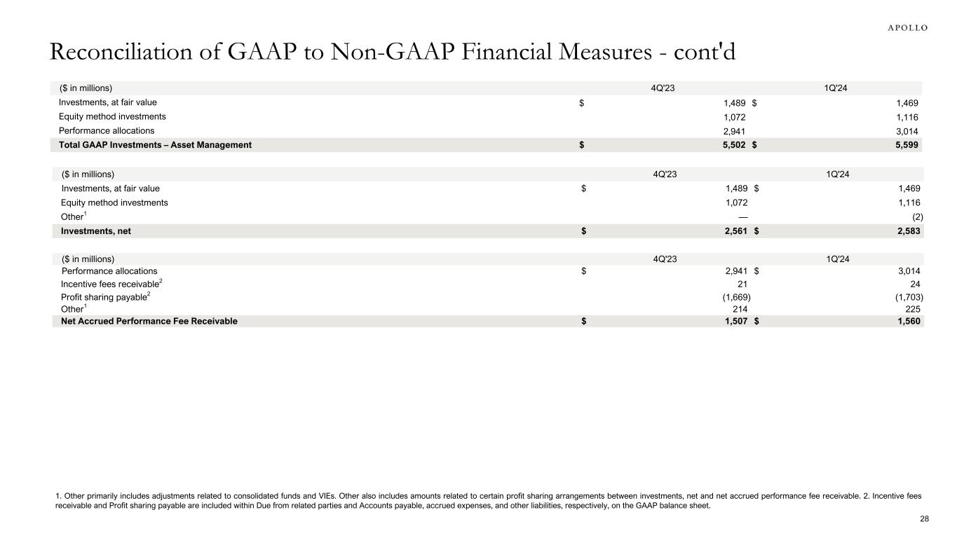 Year ended December 31, ($ in millions) 2014 2015 2016 2017 2018 2019 2020 2021 2022 2023 GAAP Net income (loss) attributable to Apollo Global Management, Inc. Common Stockholders $168 $134 $403 $616 $(42) $807 $120 $1,802 $(1,961) $5,001 Preferred dividends — — — 14 32 37 37 37 — 46 Net income (loss) attributable to non-controlling interests 562 216 567 814 29 693 310 2,428 (1,546) 1,462 GAAP Net income (loss) $730 $350 $970 $1,444 $19 $1,537 $467 $4,267 $(3,507) $6,509 Income tax provision (benefit) 147 27 91 326 86 (129) 86 594 (739) (923) GAAP Income (loss) before Income tax provision (benefit) $877 $377 $1,061 $1,770 $105 $1,408 $553 $4,861 $(4,246) $5,586 Asset Management Adjustments: Equity-based profit sharing expense and other1 — 1 3 7 91 96 129 146 276 239 Equity-based compensation 105 62 63 65 68 71 68 80 185 236 Special equity-based compensation and other charges2 — — — — — — — — — 438 Preferred dividends — — — (14) (32) (37) (37) (37) — — Transaction-related charges3 34 39 55 17 (6) 49 39 35 (42) 32 Merger-related transaction and integration costs4 — — — — — — — 67 70 27 Charges associated with corporate conversion — — — — — 22 4 — — — (Gains) losses from changes in tax receivable agreement liability (32) — (3) (200) (35) 50 (12) (10) 26 13 Net (income) loss attributable to non-controlling interests in consolidated entities (157) (21) (6) (9) (32) (31) (118) (418) 1,499 (1,556) Unrealized performance fees 1,348 358 (511) (689) 783 (435) (35) (1,465) (2) (127) Unrealized profit sharing expense (517) (137) 180 226 (275) 208 33 649 20 179 One-time equity-based compensation charges5 — — — — — — — 949 — — HoldCo interest and other financing costs 19 27 39 59 69 98 154 170 122 88 Unrealized principal investment (income) loss 22 13 (65) (95) 62 (88) (62) (222) 176 (88) Unrealized net (gains) losses from investment activities and other (260) (79) (139) (95) 193 (135) 421 (2,431) (144) 26 Retirement Services Adjustments: Investment (gains) losses, net of offsets — — — — — — — — 7,467 (170) Non-operating change in insurance liabilities and related derivatives6 — — — — — — — — (1,433) (182) Integration, restructuring and other non-operating expenses — — — — — — — — 133 130 Equity-based compensation expense — — — — — — — — 56 88 Segment Income $1,439 $640 $677 $1,042 $991 $1,276 $1,137 $2,374 $4,163 $4,959 HoldCo interest and other financing costs (19) (27) (39) (59) (69) (98) (154) (170) (122) (88) Taxes and related payables (74) (10) (10) (26) (44) (62) (90) (172) (795) (789) Adjusted Net Income $1,346 $603 $628 $957 $878 $1,116 $893 $2,032 $3,246 $4,082 Notable items — — — — — — — — 3 (115) Tax impact of notable items — — — — — — — — (1) 24 Adjusted Net Income, Excluding Notable Items $— $— $— $— $— $— $— $— $3,248 $3,991 Reconciliation of GAAP to Non-GAAP Financial Measures - cont'd 27 1. Equity-based profit sharing expense and other includes certain profit sharing arrangements in which a portion of performance fees distributed to the general partner are required to be used by employees of Apollo to purchase restricted shares of common stock or is delivered in the form of RSUs, which are granted under the Equity Plan. Equity-based profit sharing expense and other also includes performance grants which are tied to the Company’s receipt of performance fees, within prescribed periods, sufficient to cover the associated equity-based compensation expense. 2. Special equity-based compensation and other charges includes equity-based compensation expense and associated taxes related to the previously announced special fully vested equity grants to certain senior leaders. 3. Transaction-related charges include contingent consideration, equity-based compensation charges and the amortization of intangible assets and certain other charges associated with acquisitions, and restructuring charges. 4. Merger-related transaction and integration costs includes advisory services, technology integration, equity-based compensation charges and other costs associated with the Company’s merger with Athene. 5. Includes one-time equity-based compensation expense and associated taxes related to the Company’s compensation structure reset. 6. Includes change in fair values of derivatives and embedded derivatives, non-operating change in funding agreements, change in fair value of market risk benefits, and non-operating change in liability for future policy benefits.