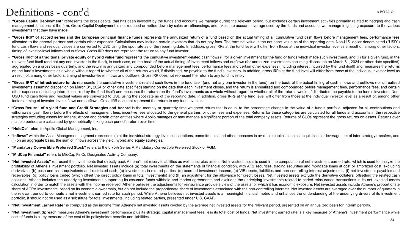• “Gross Capital Deployment” represents the gross capital that has been invested by the funds and accounts we manage during the relevant period, but excludes certain investment activities primarily related to hedging and cash management functions at the firm. Gross Capital Deployment is not reduced or netted down by sales or refinancings, and takes into account leverage used by the funds and accounts we manage in gaining exposure to the various investments that they have made. • "Gross IRR" of accord series and the European principal finance funds represents the annualized return of a fund based on the actual timing of all cumulative fund cash flows before management fees, performance fees allocated to the general partner and certain other expenses. Calculations may include certain investors that do not pay fees. The terminal value is the net asset value as of the reporting date. Non-U.S. dollar denominated (“USD”) fund cash flows and residual values are converted to USD using the spot rate as of the reporting date. In addition, gross IRRs at the fund level will differ from those at the individual investor level as a result of, among other factors, timing of investor-level inflows and outflows. Gross IRR does not represent the return to any fund investor. • "Gross IRR" of a traditional private equity or hybrid value fund represents the cumulative investment-related cash flows (i) for a given investment for the fund or funds which made such investment, and (ii) for a given fund, in the relevant fund itself (and not any one investor in the fund), in each case, on the basis of the actual timing of investment inflows and outflows (for unrealized investments assuming disposition on March 31, 2024 or other date specified) aggregated on a gross basis quarterly, and the return is annualized and compounded before management fees, performance fees and certain other expenses (including interest incurred by the fund itself) and measures the returns on the fund’s investments as a whole without regard to whether all of the returns would, if distributed, be payable to the fund’s investors. In addition, gross IRRs at the fund level will differ from those at the individual investor level as a result of, among other factors, timing of investor-level inflows and outflows. Gross IRR does not represent the return to any fund investor. • "Gross IRR" of infrastructure funds represents the cumulative investment-related cash flows in the fund itself (and not any one investor in the fund), on the basis of the actual timing of cash inflows and outflows (for unrealized investments assuming disposition on March 31, 2024 or other date specified) starting on the date that each investment closes, and the return is annualized and compounded before management fees, performance fees, and certain other expenses (including interest incurred by the fund itself) and measures the returns on the fund’s investments as a whole without regard to whether all of the returns would, if distributed, be payable to the fund’s investors. Non- USD fund cash flows and residual values are converted to USD using the spot rate as of the reporting date. In addition, gross IRRs at the fund level will differ from those at the individual investor level as a result of, among other factors, timing of investor-level inflows and outflows. Gross IRR does not represent the return to any fund investor. • “Gross Return” of a yield fund and Credit Strategies and Accord is the monthly or quarterly time-weighted return that is equal to the percentage change in the value of a fund’s portfolio, adjusted for all contributions and withdrawals (cash flows) before the effects of management fees, incentive fees allocated to the general partner, or other fees and expenses. Returns for these categories are calculated for all funds and accounts in the respective strategies excluding assets for Athene, Athora and certain other entities where Apollo manages or may manage a significant portion of the total company assets. Returns of CLOs represent the gross returns on assets. Returns over multiple periods are calculated by geometrically linking each period’s return over time. • “HoldCo” refers to Apollo Global Management, Inc. • “Inflows” within the Asset Management segment represents (i) at the individual strategy level, subscriptions, commitments, and other increases in available capital, such as acquisitions or leverage, net of inter-strategy transfers, and (ii) on an aggregate basis, the sum of inflows across the yield, hybrid and equity strategies. • “Mandatory Convertible Preferred Stock” refers to the 6.75% Series A Mandatory Convertible Preferred Stock of AGM. • "MidCap Financial" refers to MidCap FinCo Designated Activity Company. • “Net Invested Assets” represent the investments that directly back Athene's net reserve liabilities as well as surplus assets. Net invested assets is used in the computation of net investment earned rate, which is used to analyze the profitability of Athene’s investment portfolio. Net invested assets include (a) total investments on the statements of financial condition, with AFS securities, trading securities and mortgage loans at cost or amortized cost, excluding derivatives, (b) cash and cash equivalents and restricted cash, (c) investments in related parties, (d) accrued investment income, (e) VIE assets, liabilities and non-controlling interest adjustments, (f) net investment payables and receivables, (g) policy loans ceded (which offset the direct policy loans in total investments) and (h) an adjustment for the allowance for credit losses. Net invested assets exclude the derivative collateral offsetting the related cash positions. Athene includes the underlying investments supporting its assumed funds withheld and modco agreements and excludes the underlying investments related to ceded reinsurance transactions in its net invested assets calculation in order to match