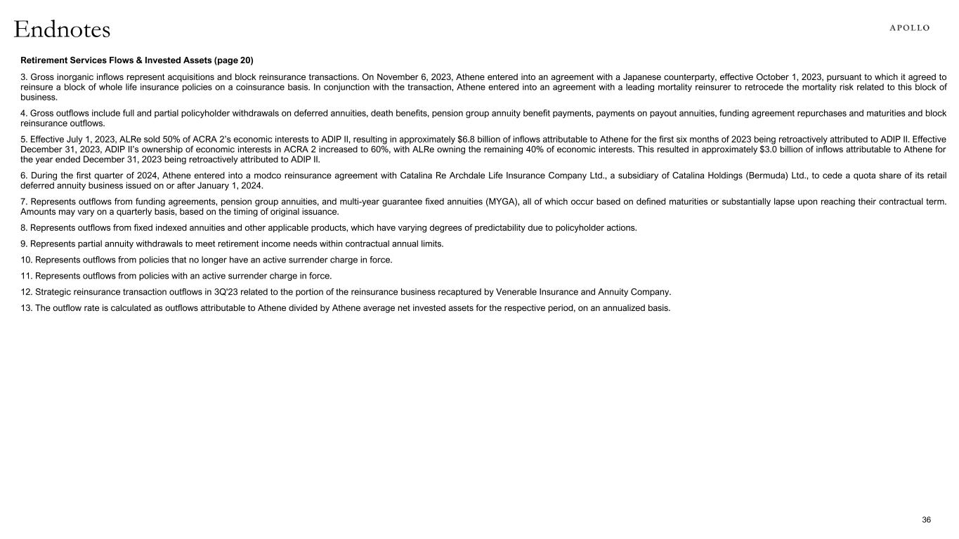 Retirement Services Flows & Invested Assets (page 20) 3. Gross inorganic inflows represent acquisitions and block reinsurance transactions. On November 6, 2023, Athene entered into an agreement with a Japanese counterparty, effective October 1, 2023, pursuant to which it agreed to reinsure a block of whole life insurance policies on a coinsurance basis. In conjunction with the transaction, Athene entered into an agreement with a leading mortality reinsurer to retrocede the mortality risk related to this block of business. 4. Gross outflows include full and partial policyholder withdrawals on deferred annuities, death benefits, pension group annuity benefit payments, payments on payout annuities, funding agreement repurchases and maturities and block reinsurance outflows. 5. Effective July 1, 2023, ALRe sold 50% of ACRA 2’s economic interests to ADIP II, resulting in approximately $6.8 billion of inflows attributable to Athene for the first six months of 2023 being retroactively attributed to ADIP II. Effective December 31, 2023, ADIP II’s ownership of economic interests in ACRA 2 increased to 60%, with ALRe owning the remaining 40% of economic interests. This resulted in approximately $3.0 billion of inflows attributable to Athene for the year ended December 31, 2023 being retroactively attributed to ADIP II. 6. During the first quarter of 2024, Athene entered into a modco reinsurance agreement with Catalina Re Archdale Life Insurance Company Ltd., a subsidiary of Catalina Holdings (Bermuda) Ltd., to cede a quota share of its retail deferred annuity business issued on or after January 1, 2024. 7. Represents outflows from funding agreements, pension group annuities, and multi-year guarantee fixed annuities (MYGA), all of which occur based on defined maturities or substantially lapse upon reaching their contractual term. Amounts may vary on a quarterly basis, based on the timing of original issuance. 8. Represents outflows from fixed indexed annuities and other applicable products, which have varying degrees of predictability due to policyholder actions. 9. Represents partial annuity withdrawals to meet retirement income needs within contractual annual limits. 10. Represents outflows from policies that no longer have an active surrender charge in force. 11. Represents outflows from policies with an active surrender charge in force. 12. Strategic reinsurance transaction outflows in 3Q'23 related to the portion of the reinsurance business recaptured by Venerable Insurance and Annuity Company. 13. The outflow rate is calculated as outflows attributable to Athene divided by Athene average net invested assets for the respective period, on an annualized basis. Endnotes 36