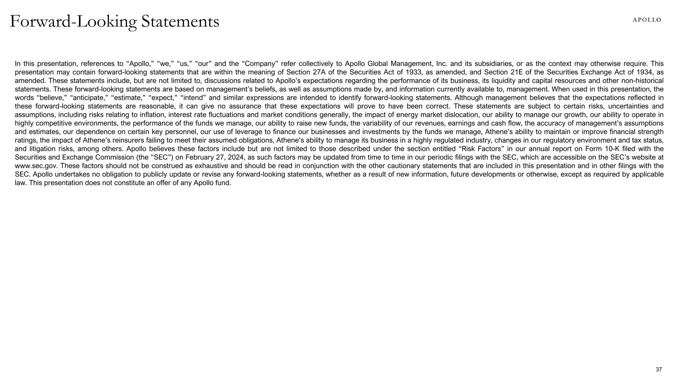 Forward-Looking Statements In this presentation, references to “Apollo,” “we,” “us,” “our” and the “Company” refer collectively to Apollo Global Management, Inc. and its subsidiaries, or as the context may otherwise require. This presentation may contain forward-looking statements that are within the meaning of Section 27A of the Securities Act of 1933, as amended, and Section 21E of the Securities Exchange Act of 1934, as amended. These statements include, but are not limited to, discussions related to Apollo’s expectations regarding the performance of its business, its liquidity and capital resources and other non-historical statements. These forward-looking statements are based on management’s beliefs, as well as assumptions made by, and information currently available to, management. When used in this presentation, the words “believe,” “anticipate,” “estimate,” “expect,” “intend” and similar expressions are intended to identify forward-looking statements. Although management believes that the expectations reflected in these forward-looking statements are reasonable, it can give no assurance that these expectations will prove to have been correct. These statements are subject to certain risks, uncertainties and assumptions, including risks relating to inflation, interest rate fluctuations and market conditions generally, the impact of energy market dislocation, our ability to manage our growth, our ability to operate in highly competitive environments, the performance of the funds we manage, our ability to raise new funds, the variability of our revenues, earnings and cash flow, the accuracy of management’s assumptions and estimates, our dependence on certain key personnel, our use of leverage to finance our businesses and investments by the funds we manage, Athene’s ability to maintain or improve financial strength ratings, the impact of Athene’s reinsurers failing to meet their assumed obligations, Athene’s ability to manage its business in a highly regulated industry, changes in our regulatory environment and tax status, and litigation risks, among others. Apollo believes these factors include but are not limited to those described under the section entitled “Risk Factors” in our annual report on Form 10-K filed with the Securities and Exchange Commission (the “SEC”) on February 27, 2024, as such factors may be updated from time to time in our periodic filings with the SEC, which are accessible on the SEC’s website at www.sec.gov. These factors should not be construed as exhaustive and should be read in conjunction with the other cautionary statements that are included in this presentation and in other filings with the SEC. Apollo undertakes no obligation to publicly update or revise any forward-looking statements, whether as a result of new information, future developments or otherwise, except as required by applicable law. This presentation does not constitute an offer of any Apollo fund. 37