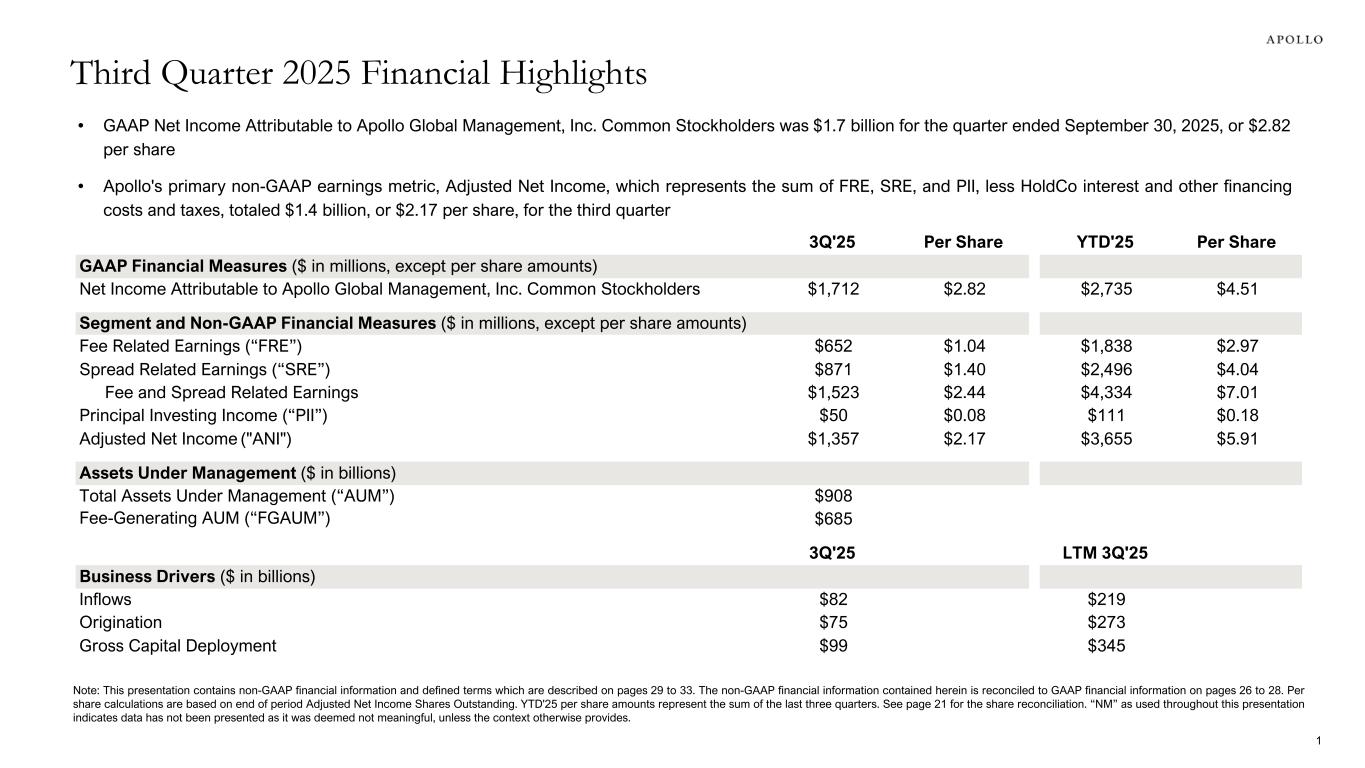 3Q'25 Per Share YTD'25 Per Share GAAP Financial Measures ($ in millions, except per share amounts) Net Income Attributable to Apollo Global Management, Inc. Common Stockholders $1,712 $2.82 $2,735 $4.51 Segment and Non-GAAP Financial Measures ($ in millions, except per share amounts) Fee Related Earnings (“FRE”) $652 $1.04 $1,838 $2.97 Spread Related Earnings (“SRE”) $871 $1.40 $2,496 $4.04 Fee and Spread Related Earnings $1,523 $2.44 $4,334 $7.01 Principal Investing Income (“PII”) $50 $0.08 $111 $0.18 Adjusted Net Income ("ANI") $1,357 $2.17 $3,655 $5.91 Assets Under Management ($ in billions) Total Assets Under Management (“AUM”) $908 Fee-Generating AUM (“FGAUM”) $685 3Q'25 LTM 3Q'25 Business Drivers ($ in billions) Inflows $82 $219 Origination $75 $273 Gross Capital Deployment $99 $345 Third Quarter 2025 Financial Highlights • GAAP Net Income Attributable to Apollo Global Management, Inc. Common Stockholders was $1.7 billion for the quarter ended September 30, 2025, or $2.82 per share • Apollo's primary non-GAAP earnings metric, Adjusted Net Income, which represents the sum of FRE, SRE, and PII, less HoldCo interest and other financing costs and taxes, totaled $1.4 billion, or $2.17 per share, for the third quarter Note: This presentation contains non-GAAP financial information and defined terms which are described on pages 29 to 33. The non-GAAP financial information contained herein is reconciled to GAAP financial information on pages 26 to 28. Per share calculations are based on end of period Adjusted Net Income Shares Outstanding. YTD'25 per share amounts represent the sum of the last three quarters. See page 21 for the share reconciliation. “NM” as used throughout this presentation indicates data has not been presented as it was deemed not meaningful, unless the context otherwise provides. 1