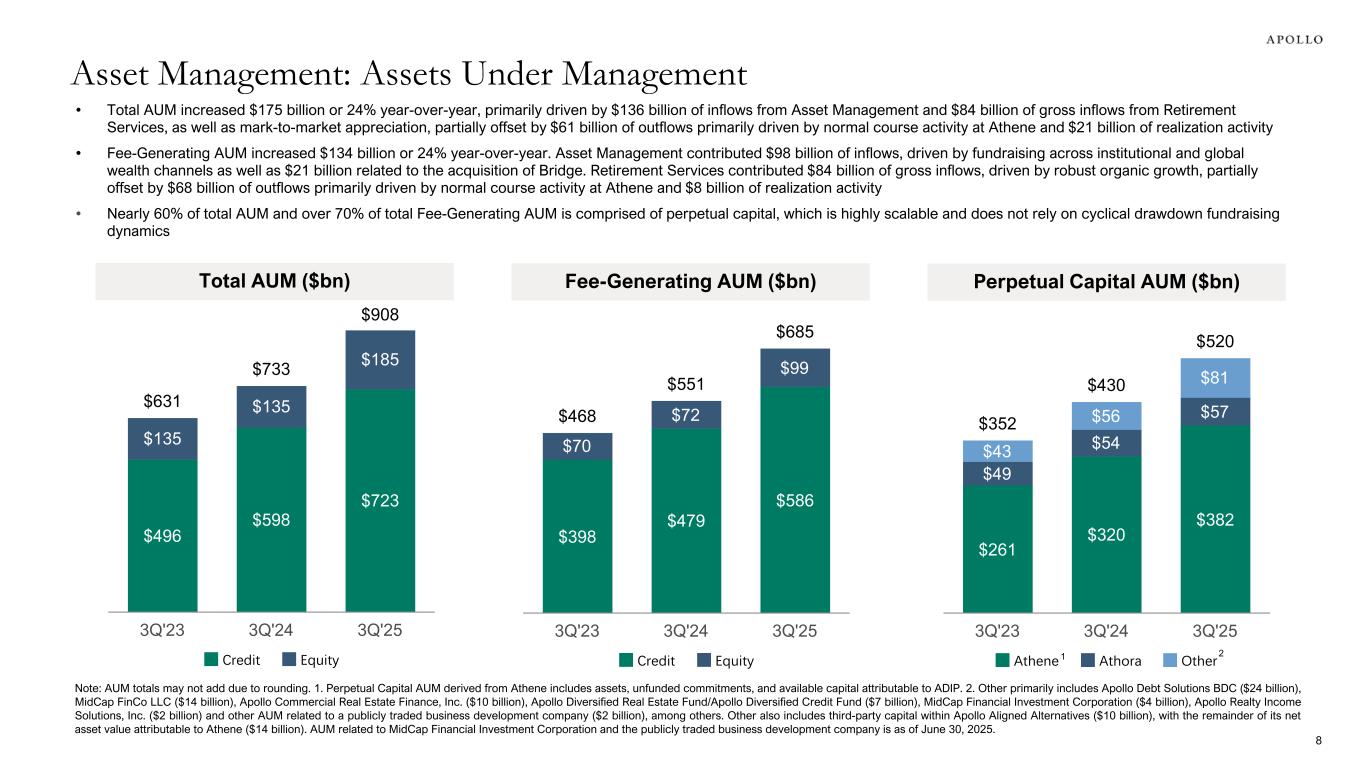 • Management fees increased 22% year-over-year driven by increasing contributions of third-party asset management inflows, record gross capital deployment, as well as strong growth from Retirement Services clients • Capital solutions fees grew 33% year-over-year primarily driven by continued strength across Apollo's broad debt origination ecosystem including through direct lending, asset-backed finance, and opportunistic credit transactions • Strong fee-related performance fees increased 28% year-over-year primarily driven by the sustained growth across a variety of perpetual capital vehicles • FRE grew 23% on a year-over-year basis, net of continued investment in hiring and infrastructure to support the firm's global strategic growth initiatives ($ in millions, except per share amounts) 3Q'24 2Q'25 3Q'25 % Change vs. 3Q'24 YTD'24 YTD'25 % Change vs. YTD'24 Management Fees Credit $518 $605 $632 22.0% $1,465 $1,806 23.3% Equity 192 211 231 20.3% 569 643 13.0% Total management fees 710 816 863 21.5% 2,034 2,449 20.4% Capital solutions fees and other, net 159 216 212 33.3% 508 582 14.6% Fee-related performance fees 57 63 73 28.1% 155 190 22.6% Fee Related Revenues $926 $1,095 $1,148 24.0% $2,697 $3,221 19.4% Fee-related compensation (238) (279) (304) 27.7% (698) (842) 20.6% Non-compensation expenses1 (157) (189) (192) 22.3% (490) (541) 10.4% Fee Related Earnings $531 $627 $652 22.8% $1,509 $1,838 21.8% FRE per share $0.87 $1.02 $1.04 19.5% $2.46 $2.97 20.7% FRE Margin 57.4% 57.3% 56.8% 55.9% 57.1% FRE Compensation Ratio 25.7% 25.5% 26.5% 25.9% 26.1% Asset Management Segment 1. Non-compensation expenses include placement fees of $11 million and $36 million, respectively, for 3Q'25 and YTD'25. YTD'24 non-compensation expenses include $15 million of costs related to the merger of two closed-end funds with MidCap Financial Investment Corporation, a publicly traded business development company managed by Apollo. 7