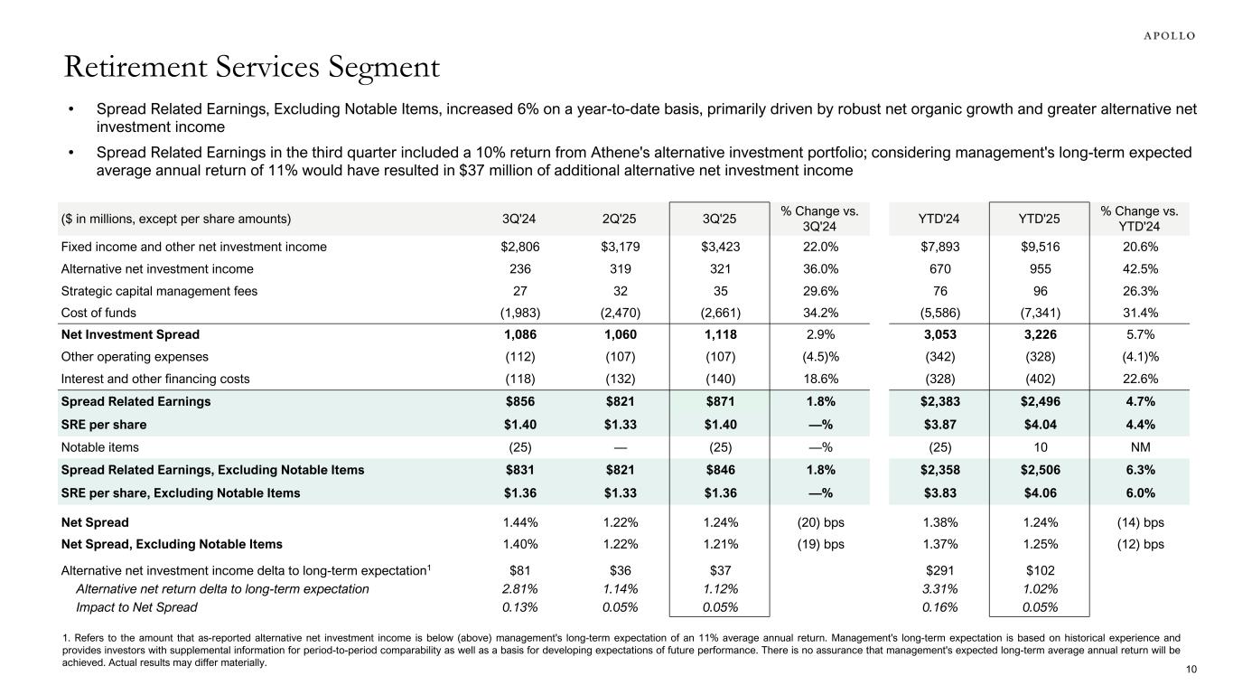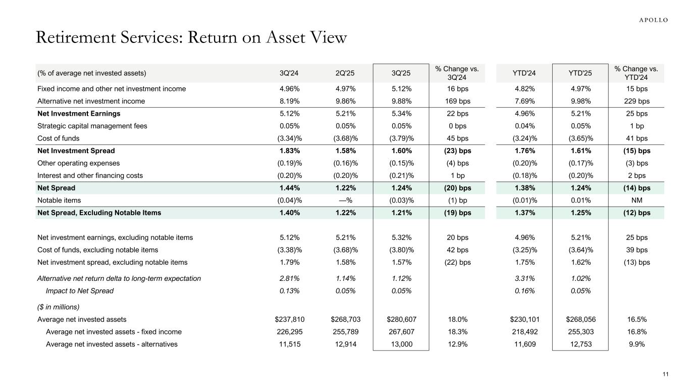 (% of average net invested assets) 3Q'24 2Q'25 3Q'25 % Change vs. 3Q'24 YTD'24 YTD'25 % Change vs. YTD'24 Fixed income and other net investment income 4.96% 4.97% 5.12% 16 bps 4.82% 4.97% 15 bps Alternative net investment income 8.19% 9.86% 9.88% 169 bps 7.69% 9.98% 229 bps Net Investment Earnings 5.12% 5.21% 5.34% 22 bps 4.96% 5.21% 25 bps Strategic capital management fees 0.05% 0.05% 0.05% 0 bps 0.04% 0.05% 1 bp Cost of funds (3.34)% (3.68)% (3.79)% 45 bps (3.24)% (3.65)% 41 bps Net Investment Spread 1.83% 1.58% 1.60% (23) bps 1.76% 1.61% (15) bps Other operating expenses (0.19)% (0.16)% (0.15)% (4) bps (0.20)% (0.17)% (3) bps Interest and other financing costs (0.20)% (0.20)% (0.21)% 1 bp (0.18)% (0.20)% 2 bps Net Spread 1.44% 1.22% 1.24% (20) bps 1.38% 1.24% (14) bps Notable items (0.04)% —% (0.03)% (1) bp (0.01)% 0.01% NM Net Spread, Excluding Notable Items 1.40% 1.22% 1.21% (19) bps 1.37% 1.25% (12) bps Net investment earnings, excluding notable items 5.12% 5.21% 5.32% 20 bps 4.96% 5.21% 25 bps Cost of funds, excluding notable items (3.38)% (3.68)% (3.80)% 42 bps (3.25)% (3.64)% 39 bps Net investment spread, excluding notable items 1.79% 1.58% 1.57% (22) bps 1.75% 1.62% (13) bps Alternative net return delta to long-term expectation 2.81% 1.14% 1.12% 3.31% 1.02% Impact to Net Spread 0.13% 0.05% 0.05% 0.16% 0.05% ($ in millions) Average net invested assets $237,810 $268,703 $280,607 18.0% $230,101 $268,056 16.5% Average net invested assets - fixed income 226,295 255,789 267,607 18.3% 218,492 255,303 16.8% Average net invested assets - alternatives 11,515 12,914 13,000 12.9% 11,609 12,753 9.9% Retirement Services: Return on Asset View 11