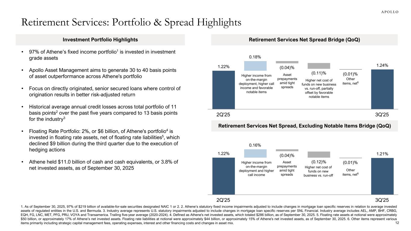 1.22% 0.18% (0.04)% (0.11)% (0.01)% 1.24% 2Q'25 3Q'25 Higher net cost of funds on new business vs. run-off, partially offset by favorable notable items Investment Portfolio Highlights Retirement Services: Portfolio & Spread Highlights 12 Retirement Services Net Spread Bridge (QoQ) 1. As of September 30, 2025, 97% of $219 billion of available-for-sale securities designated NAIC 1 or 2. 2. Athene’s statutory fixed income impairments adjusted to include changes in mortgage loan specific reserves in relation to average invested assets of regulated entities in the U.S. and Bermuda. 3. Industry average represents U.S. statutory impairments adjusted to include changes in mortgage loan specific reserves per SNL Financial. Industry average includes AEL, AMP, BHF, CRBG, EQH, FG, LNC, MET, PFG, PRU, VOYA and Transamerica. Trailing five-year average (2020-2024). 4. Defined as Athene's net invested assets, which totaled $286 billion, as of September 30, 2025. 5. Floating rate assets at notional were approximately $50 billion, or approximately 17% of Athene’s net invested assets. Floating rate liabilities at notional were approximately $44 billion, or approximately 15% of Athene's net invested assets, as of September 30, 2025. 6. Other items represent various items primarily including strategic capital management fees, operating expenses, interest and other financing costs and changes in asset mix. • 97% of Athene’s fixed income portfolio1 is invested in investment grade assets • Apollo Asset Management aims to generate 30 to 40 basis points of asset outperformance across Athene's portfolio • Focus on directly originated, senior secured loans where control of origination results in better risk-adjusted return • Historical average annual credit losses across total portfolio of 11 basis points2 over the past five years compared to 13 basis points for the industry3 • Floating Rate Portfolio: 2%, or $6 billion, of Athene's portfolio4 is invested in floating rate assets, net of floating rate liabilities5, which declined $9 billion during the third quarter due to the execution of hedging actions • Athene held $11.0 billion of cash and cash equivalents, or 3.8% of net invested assets, as of September 30, 2025 1.22% 0.16% (0.04)% (0.12)% (0.01)% 1.21% 2Q'25 3Q'25 Retirement Services Net Spread, Excluding Notable Items Bridge (QoQ) Asset prepayments amid tight spreads Higher income from on-the-margin deployment, higher call income and favorable notable items Other items, net6 Asset prepayments amid tight spreads Higher net cost of funds on new business vs. run-off Higher income from on-the-margin deployment and higher call income Other items, net6