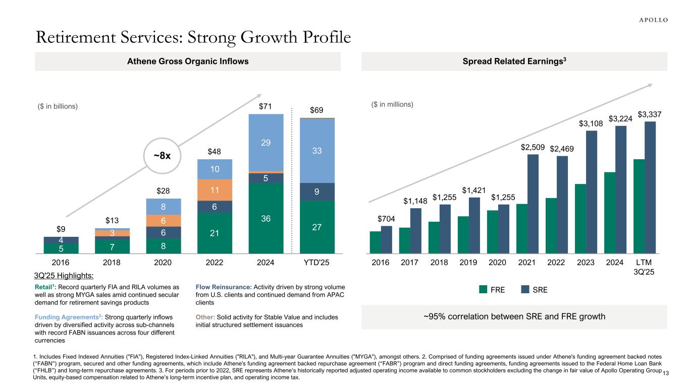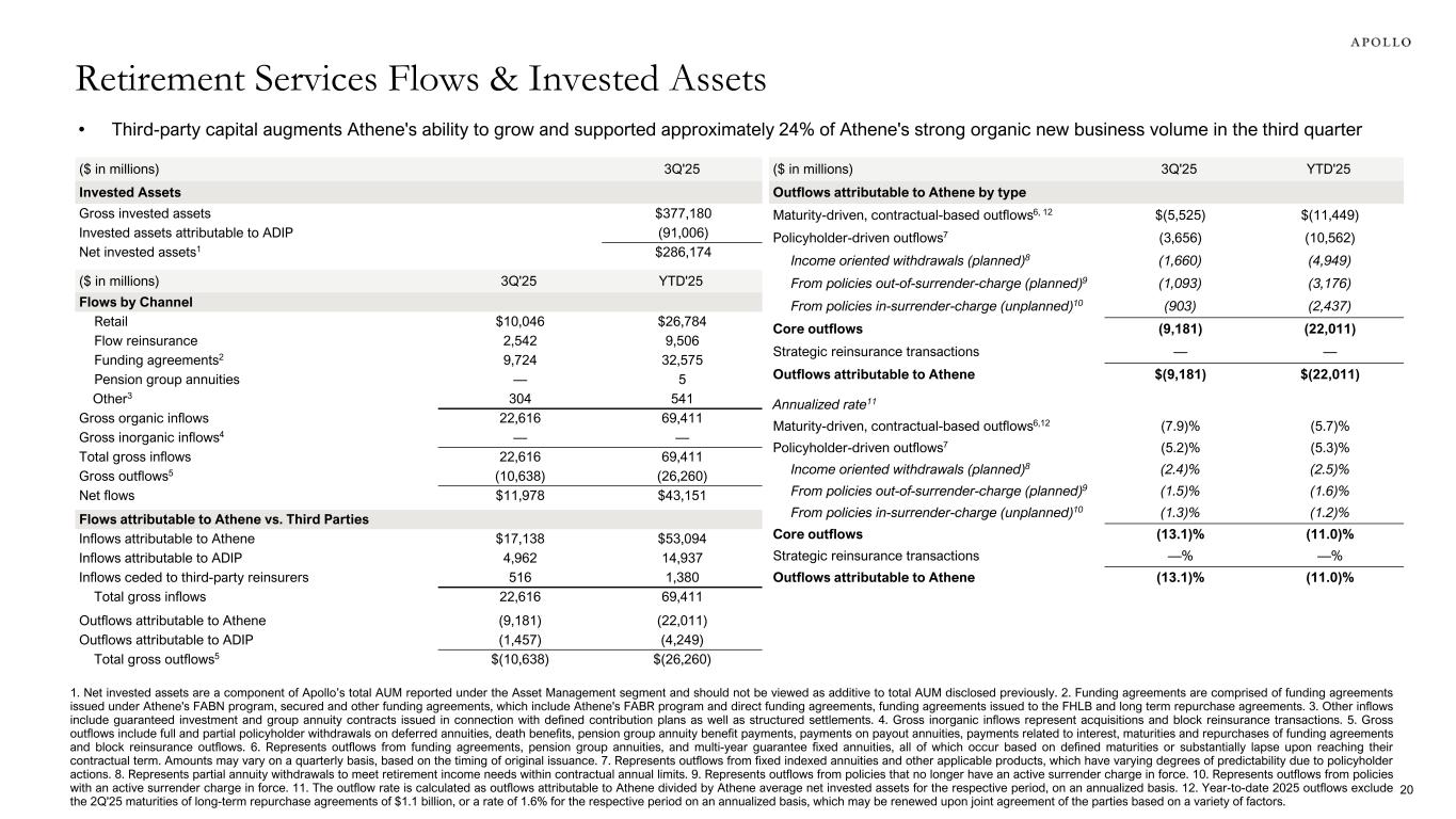 • Third-party capital augments Athene's ability to grow and supported approximately 24% of Athene's strong organic new business volume in the third quarter 20 1. Net invested assets are a component of Apollo’s total AUM reported under the Asset Management segment and should not be viewed as additive to total AUM disclosed previously. 2. Funding agreements are comprised of funding agreements issued under Athene's FABN program, secured and other funding agreements, which include Athene's FABR program and direct funding agreements, funding agreements issued to the FHLB and long term repurchase agreements. 3. Other inflows include guaranteed investment and group annuity contracts issued in connection with defined contribution plans as well as structured settlements. 4. Gross inorganic inflows represent acquisitions and block reinsurance transactions. 5. Gross outflows include full and partial policyholder withdrawals on deferred annuities, death benefits, pension group annuity benefit payments, payments on payout annuities, payments related to interest, maturities and repurchases of funding agreements and block reinsurance outflows. 6. Represents outflows from funding agreements, pension group annuities, and multi-year guarantee fixed annuities, all of which occur based on defined maturities or substantially lapse upon reaching their contractual term. Amounts may vary on a quarterly basis, based on the timing of original issuance. 7. Represents outflows from fixed indexed annuities and other applicable products, which have varying degrees of predictability due to policyholder actions. 8. Represents partial annuity withdrawals to meet retirement income needs within contractual annual limits. 9. Represents outflows from policies that no longer have an active surrender charge in force. 10. Represents outflows from policies with an active surrender charge in force. 11. The outflow rate is calculated as outflows attributable to Athene divided by Athene average net invested assets for the respective period, on an annualized basis. 12. Year-to-date 2025 outflows exclude the 2Q'25 maturities of long-term repurchase agreements of $1.1 billion, or a rate of 1.6% for the respective period on an annualized basis, which may be renewed upon joint agreement of the parties based on a variety of factors. Retirement Services Flows & Invested Assets ($ in millions) 3Q'25 YTD'25 Flows by Channel Retail $10,046 $26,784 Flow reinsurance 2,542 9,506 Funding agreements2 9,724 32,575 Pension group annuities — 5 Other3 304 541 Gross organic inflows 22,616 69,411 Gross inorganic inflows4 — — Total gross inflows 22,616 69,411 Gross outflows5 (10,638) (26,260) Net flows $11,978 $43,151 Flows attributable to Athene vs. Third Parties Inflows attributable to Athene $17,138 $53,094 Inflows attributable to ADIP 4,962 14,937 Inflows ceded to third-party reinsurers 516 1,380 Total gross inflows 22,616 69,411 Outflows attributable to Athene (9,181) (22,011) Outflows attributable to ADIP (1,457) (4,249) Total gross outflows5 $(10,638) $(26,260) ($ in millions) 3Q'25 Invested Assets Gross invested assets $377,180 Invested assets attributable to ADIP (91,006) Net invested assets1 $286,174 ($ in millions) 3Q'25 YTD'25 Outflows attributable to Athene by type Maturity-driven, contractual-based outflows6, 12 $(5,525) $(11,449) Policyholder-driven outflows7 (3,656) (10,562) Income oriented withdrawals (planned)8 (1,660) (4,949) From policies out-of-surrender-charge (planned)9 (1,093) (3,176) From policies in-surrender-charge (unplanned)10 (903) (2,437) Core outflows (9,181) (22,011) Strategic reinsurance transactions — — Outflows attributable to Athene $(9,181) $(22,011) Annualized rate11 Maturity-driven, contractual-based outflows6,12 (7.9)% (5.7)% Policyholder-driven outflows7 (5.2)% (5.3)% Income oriented withdrawals (planned)8 (2.4)% (2.5)% From policies out-of-surrender-charge (planned)9 (1.5)% (1.6)% From policies in-surrender-charge (unplanned)10 (1.3)% (1.2)% Core outflows (13.1)% (11.0)% Strategic reinsurance transactions —% —% Outflows attributable to Athene (13.1)% (11.0)%