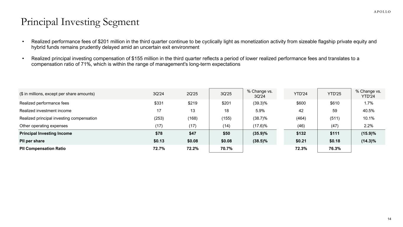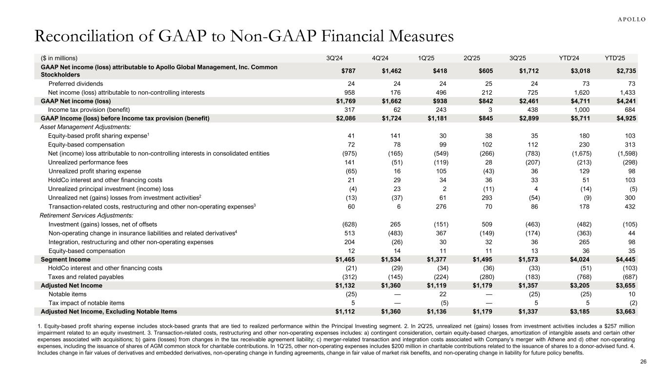 (In millions, except per share amounts) 3Q'24 2Q'25 3Q'25 YTD'24 YTD'25 Revenues Asset Management Management fees $476 $583 $606 $1,376 $1,697 Advisory and transaction fees, net 181 277 378 617 850 Investment income (loss) 230 189 444 910 936 Incentive fees 35 58 51 108 149 Property management, development and other fees — — 8 — 8 Retirement Services Premiums 389 107 117 1,163 351 Product charges 267 274 292 756 831 Net investment income 4,101 4,776 5,013 11,481 14,130 Investment related gains (losses) 1,539 (5) 2,254 3,082 1,421 Revenues of consolidated variable interest entities 552 550 654 1,329 1,796 Other revenues 3 5 6 9 16 Total Revenues 7,773 6,814 9,823 20,831 22,185 Expenses Asset Management Compensation and benefits (605) (602) (761) (1,876) (2,108) Interest expense (55) (60) (64) (159) (184) General, administrative and other (326) (370) (409) (885) (1,087) Retirement Services Interest sensitive contract benefits (2,599) (3,428) (4,164) (7,307) (9,086) Future policy and other policy benefits (793) (527) (613) (2,431) (1,681) Market risk benefits remeasurement gains (losses) (524) 111 (131) (354) (405) Amortization of deferred acquisition costs, deferred sales inducements and value of business acquired (244) (292) (355) (678) (914) Policy and other operating expenses (670) (550) (573) (1,601) (1,665) Total Expenses (5,816) (5,718) (7,070) (15,291) (17,130) Other Income (Loss) – Asset Management Net gains (losses) from investment activities 15 (268) 78 33 (208) Net gains (losses) from investment activities of consolidated variable interest entities 44 4 35 70 250 Other income (loss), net 70 13 33 68 (172) Total Other Income (Loss) 129 (251) 146 171 (130) Income (loss) before income tax (provision) benefit 2,086 845 2,899 5,711 4,925 Income tax (provision) benefit (317) (3) (438) (1,000) (684) Net income (loss) 1,769 842 2,461 4,711 4,241 Net (income) loss attributable to non-controlling interests (958) (212) (725) (1,620) (1,433) Net income (loss) attributable to Apollo Global Management, Inc. 811 630 1,736 3,091 2,808 Preferred stock dividends (24) (25) (24) (73) (73) Net income (loss) attributable to Apollo Global Management, Inc. Common Stockholders $787 $605 $1,712 $3,018 $2,735 Earnings (Loss) per share Net income (loss) attributable to Common Stockholders - Basic $1.30 $1.00 $2.82 $4.96 $4.51 Net income (loss) attributable to Common Stockholders - Diluted $1.29 $0.99 $2.78 $4.94 $4.47 Weighted average shares outstanding - Basic 585 587 589 587 588 Weighted average shares outstanding - Diluted 589 590 608 590 592 GAAP Income Statement (Unaudited) 2