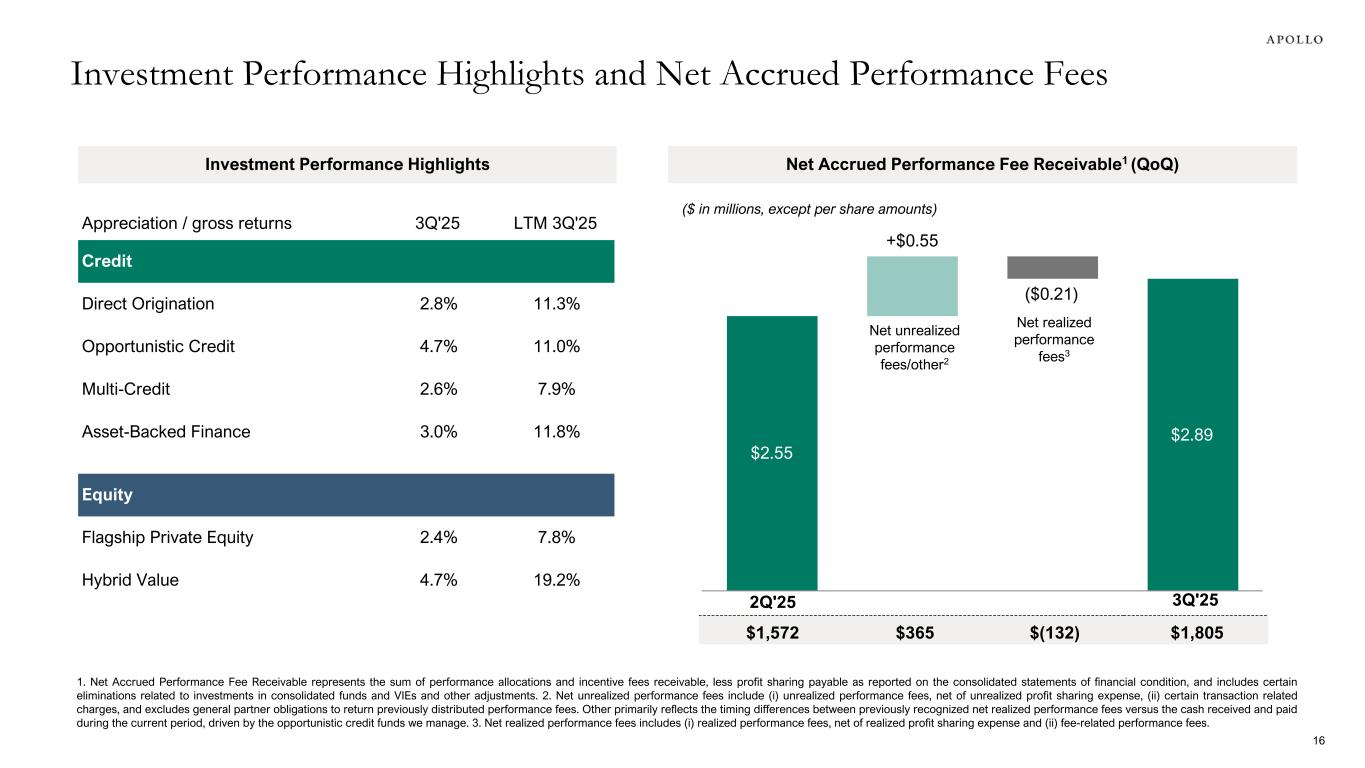 • “Net IRR” of a traditional private equity or hybrid value fund represents the gross IRR applicable to a fund, including returns for related parties which may not pay fees or performance fees, net of management fees, certain expenses (including interest incurred or earned by the fund itself) and realized performance fees all offset to the extent of interest income, and measures returns at the fund level on amounts that, if distributed, would be paid to investors of the fund. The timing of cash flows applicable to investments, management fees and certain expenses, may be adjusted for the usage of a fund’s subscription facility. To the extent that a fund exceeds all requirements detailed within the applicable fund agreement, the estimated unrealized value is adjusted such that a percentage of up to 20.0% of the unrealized gain is allocated to the general partner of such fund, thereby reducing the balance attributable to fund investors. In addition, net IRR at the fund level will differ from that at the individual investor level as a result of, among other factors, timing of investor-level inflows and outflows. Net IRR does not represent the return to any fund investor. • “Net IRR” of infrastructure funds represents the cumulative cash flows in a fund (and not any one investor in the fund), on the basis of the actual timing of cash inflows received from and outflows paid to investors of the fund (assuming the ending net asset value as of September 30, 2025 or other date specified is paid to investors), excluding certain non-fee and non-performance fee bearing parties, and the return is annualized and compounded after management fees, performance fees, and certain other expenses (including interest incurred by the fund itself) and measures the returns to investors of the fund as a whole. Non-USD fund cash flows and residual values are converted to USD using the spot rate as of the reporting date. In addition, net IRR at the fund level will differ from that at the individual investor level as a result of, among other factors, timing of investor-level inflows and outflows. Net IRR does not represent the return to any fund investor. • “Origination” represents (i) capital that has been invested in new equity, debt or debt-like investments by Apollo's equity and credit strategies (whether purchased by funds and accounts managed by Apollo, or syndicated to third parties) where Apollo or one of Apollo's origination platforms has sourced, negotiated, or significantly affected the commercial terms of the investment; (ii) new capital pools formed by debt issuances, including CLOs; and (iii) net purchases of certain assets by the funds and accounts we manage that we consider to be private, illiquid, and hard to access assets and which the funds and accounts otherwise may not be able to meaningfully access. Origination generally excludes any issuance of debt or debt-like investments by the portfolio companies of the funds we manage. • “Other operating expenses” within the Principal Investing segment represents expenses incurred in the normal course of business and includes allocations of non-compensation expenses related to managing the business. • “Other operating expenses” within the Retirement Services segment represents expenses incurred in the normal course of business inclusive of compensation and non-compensation expenses, but does not include the proportionate share of the ACRA operating expenses associated with the non-controlling interests. • “Perpetual capital” refers to assets under management of certain vehicles with an indefinite duration, which assets may only be withdrawn under certain conditions or subject to certain limitations, including satisfying required hold periods or percentage limits on the amounts that may be redeemed over a particular period. The investment management, advisory or other service agreements with our perpetual capital vehicles may be terminated under certain circumstances. • “PII Compensation Ratio” is calculated as Principal investing compensation divided by the sum of realized performance fees and realized investment income. • “Principal investing compensation” within the Principal Investing segment represents realized performance compensation, distributions related to investment income and dividends, and includes allocations of certain compensation expenses related to managing the business. • “Realized Value” refers to all cash investment proceeds received by the relevant Apollo fund, including interest and dividends, but does not give effect to management fees, expenses, incentive compensation or performance fees to be paid by such Apollo fund. • “Redding Ridge” refers to Redding Ridge Asset Management, LLC and its subsidiaries, which is a standalone, self-managed asset management business established in connection with risk retention rules that manages CLOs and retains the required risk retention interests. • “Remaining Cost” represents Total Invested Capital, reduced for any return of capital proceeds received to date. • “Total Invested Capital” refers to the aggregate cash invested by the relevant Apollo fund and includes capitalized costs relating to investment activities, if any, but does not give effect to cash pending investment or available for reserves and excludes amounts, if any, invested on a financed basis with leverage facilities. • “Total Value” represents the sum of the total Realized Value and Unrealized Value of investments. • “Unrealized Value” refers to the fair value consistent with valuations determined in accordance with GAAP, for investments not yet realized and may include payments in kind, accrued interest and dividends receivable, if any, and before the effect of certain taxes. In addition, amounts include committed and funded amounts for certain investments. • “Vintage Year” refers to the year in which a fund’s final capital raise occurr