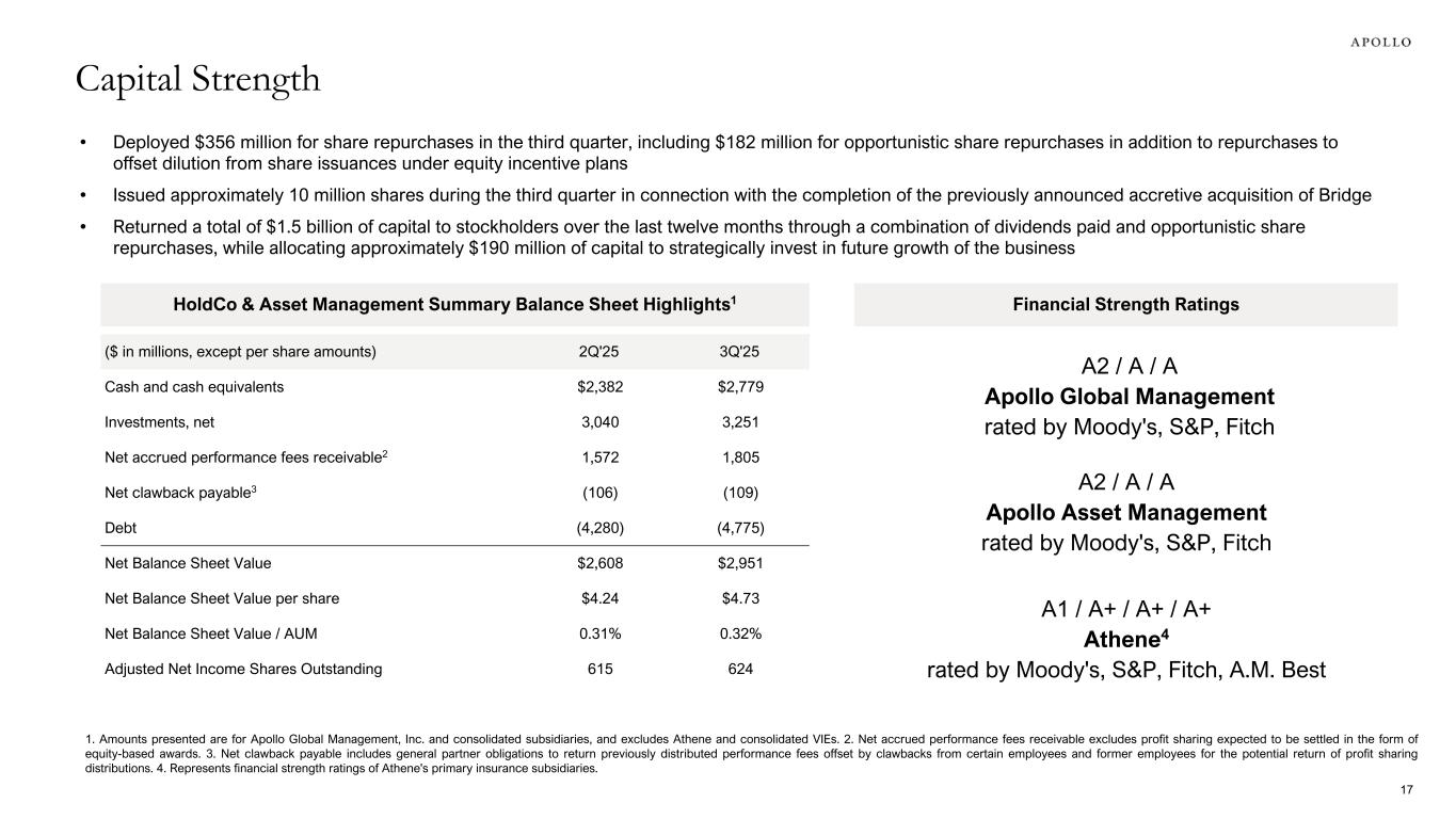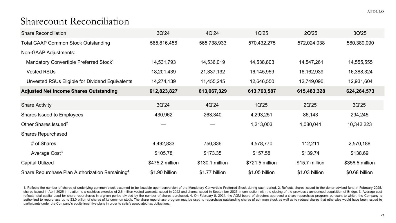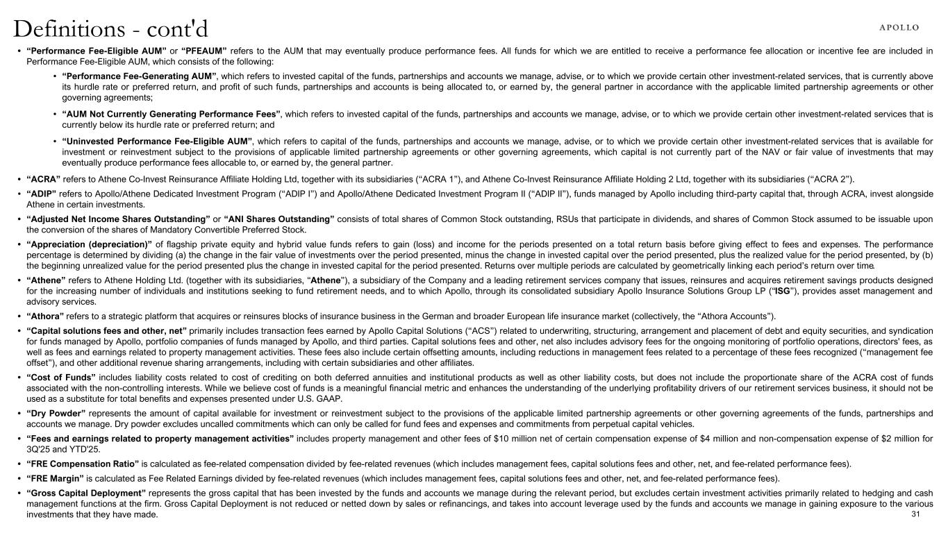 • “Performance Fee-Eligible AUM” or “PFEAUM” refers to the AUM that may eventually produce performance fees. All funds for which we are entitled to receive a performance fee allocation or incentive fee are included in Performance Fee-Eligible AUM, which consists of the following: • “Performance Fee-Generating AUM”, which refers to invested capital of the funds, partnerships and accounts we manage, advise, or to which we provide certain other investment-related services, that is currently above its hurdle rate or preferred return, and profit of such funds, partnerships and accounts is being allocated to, or earned by, the general partner in accordance with the applicable limited partnership agreements or other governing agreements; • “AUM Not Currently Generating Performance Fees”, which refers to invested capital of the funds, partnerships and accounts we manage, advise, or to which we provide certain other investment-related services that is currently below its hurdle rate or preferred return; and • “Uninvested Performance Fee-Eligible AUM”, which refers to capital of the funds, partnerships and accounts we manage, advise, or to which we provide certain other investment-related services that is available for investment or reinvestment subject to the provisions of applicable limited partnership agreements or other governing agreements, which capital is not currently part of the NAV or fair value of investments that may eventually produce performance fees allocable to, or earned by, the general partner. • “ACRA” refers to Athene Co-Invest Reinsurance Affiliate Holding Ltd, together with its subsidiaries (“ACRA 1”), and Athene Co-Invest Reinsurance Affiliate Holding 2 Ltd, together with its subsidiaries (“ACRA 2”). • “ADIP” refers to Apollo/Athene Dedicated Investment Program (“ADIP I”) and Apollo/Athene Dedicated Investment Program II (“ADIP II”), funds managed by Apollo including third-party capital that, through ACRA, invest alongside Athene in certain investments. • “Adjusted Net Income Shares Outstanding” or “ANI Shares Outstanding” consists of total shares of Common Stock outstanding, RSUs that participate in dividends, and shares of Common Stock assumed to be issuable upon the conversion of the shares of Mandatory Convertible Preferred Stock. • “Appreciation (depreciation)” of flagship private equity and hybrid value funds refers to gain (loss) and income for the periods presented on a total return basis before giving effect to fees and expenses. The performance percentage is determined by dividing (a) the change in the fair value of investments over the period presented, minus the change in invested capital over the period presented, plus the realized value for the period presented, by (b) the beginning unrealized value for the period presented plus the change in invested capital for the period presented. Returns over multiple periods are calculated by geometrically linking each period’s return over time. • “Athene” refers to Athene Holding Ltd. (together with its subsidiaries, “Athene”), a subsidiary of the Company and a leading retirement services company that issues, reinsures and acquires retirement savings products designed for the increasing number of individuals and institutions seeking to fund retirement needs, and to which Apollo, through its consolidated subsidiary Apollo Insurance Solutions Group LP (“ISG”), provides asset management and advisory services. • “Athora” refers to a strategic platform that acquires or reinsures blocks of insurance business in the German and broader European life insurance market (collectively, the “Athora Accounts”). • “Capital solutions fees and other, net” primarily includes transaction fees earned by Apollo Capital Solutions (“ACS”) related to underwriting, structuring, arrangement and placement of debt and equity securities, and syndication for funds managed by Apollo, portfolio companies of funds managed by Apollo, and third parties. Capital solutions fees and other, net also includes advisory fees for the ongoing monitoring of portfolio operations, directors' fees, as well as fees and earnings related to property management activities. These fees also include certain offsetting amounts, including reductions in management fees related to a percentage of these fees recognized (“management fee offset”), and other additional revenue sharing arrangements, including with certain subsidiaries and other affiliates. • “Cost of Funds” includes liability costs related to cost of crediting on both deferred annuities and institutional products as well as other liability costs, but does not include the proportionate share of the ACRA cost of funds associated with the non-controlling interests. While we believe cost of funds is a meaningful financial metric and enhances the understanding of the underlying profitability drivers of our retirement services business, it should not be used as a substitute for total benefits and expenses presented under U.S. GAAP. • “Dry Powder” represents the amount of capital available for investment or reinvestment subject to the provisions of the applicable limited partnership agreements or other governing agreements of the funds, partnerships and accounts we manage. Dry powder excludes uncalled commitments which can only be called for fund fees and expenses and commitments from perpetual capital vehicles. • “Fees and earnings related to property management activities” includes property management and other fees of $10 million net of certain compensation expense of $4 million and non-compensation expense of $2 million for 3Q'25 and YTD'25. • “FRE Compensation Ratio” is calculated as fee-related compensation divided by fee-related revenues (which includes management fees, capital solutions fees and other, net, and fee-related performance fees). • “FRE Margin” is calculated as Fee 