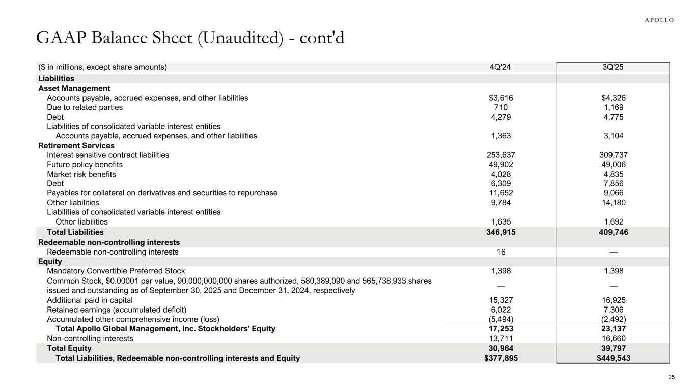 ($ in millions, except share amounts) 4Q'24 3Q'25 Liabilities Asset Management Accounts payable, accrued expenses, and other liabilities $3,616 $4,326 Due to related parties 710 1,169 Debt 4,279 4,775 Liabilities of consolidated variable interest entities Accounts payable, accrued expenses, and other liabilities 1,363 3,104 Retirement Services Interest sensitive contract liabilities 253,637 309,737 Future policy benefits 49,902 49,006 Market risk benefits 4,028 4,835 Debt 6,309 7,856 Payables for collateral on derivatives and securities to repurchase 11,652 9,066 Other liabilities 9,784 14,180 Liabilities of consolidated variable interest entities Other liabilities 1,635 1,692 Total Liabilities 346,915 409,746 Redeemable non-controlling interests Redeemable non-controlling interests 16 — Equity Mandatory Convertible Preferred Stock 1,398 1,398 Common Stock, $0.00001 par value, 90,000,000,000 shares authorized, 580,389,090 and 565,738,933 shares issued and outstanding as of September 30, 2025 and December 31, 2024, respectively — — Additional paid in capital 15,327 16,925 Retained earnings (accumulated deficit) 6,022 7,306 Accumulated other comprehensive income (loss) (5,494) (2,492) Total Apollo Global Management, Inc. Stockholders' Equity 17,253 23,137 Non-controlling interests 13,711 16,660 Total Equity 30,964 39,797 Total Liabilities, Redeemable non-controlling interests and Equity $377,895 $449,543 GAAP Balance Sheet (Unaudited) - cont'd 25