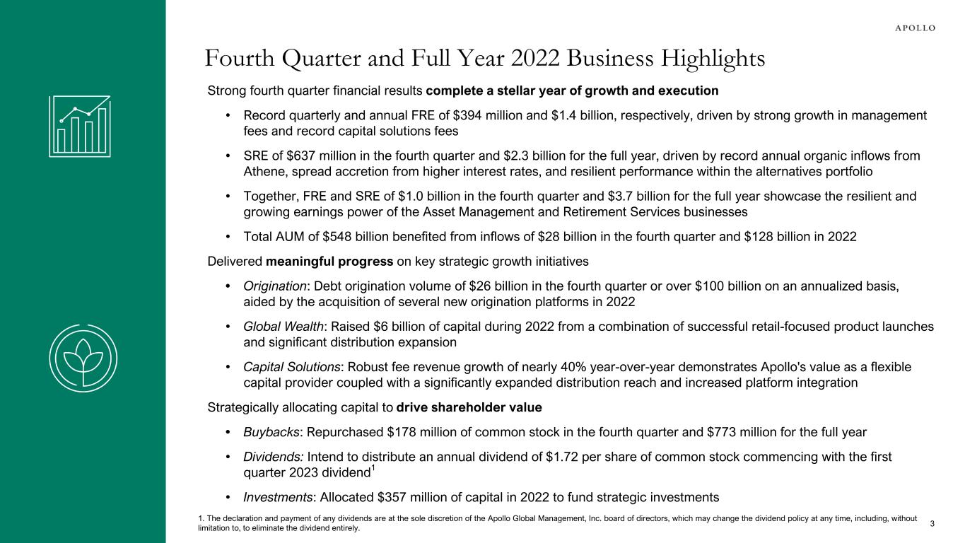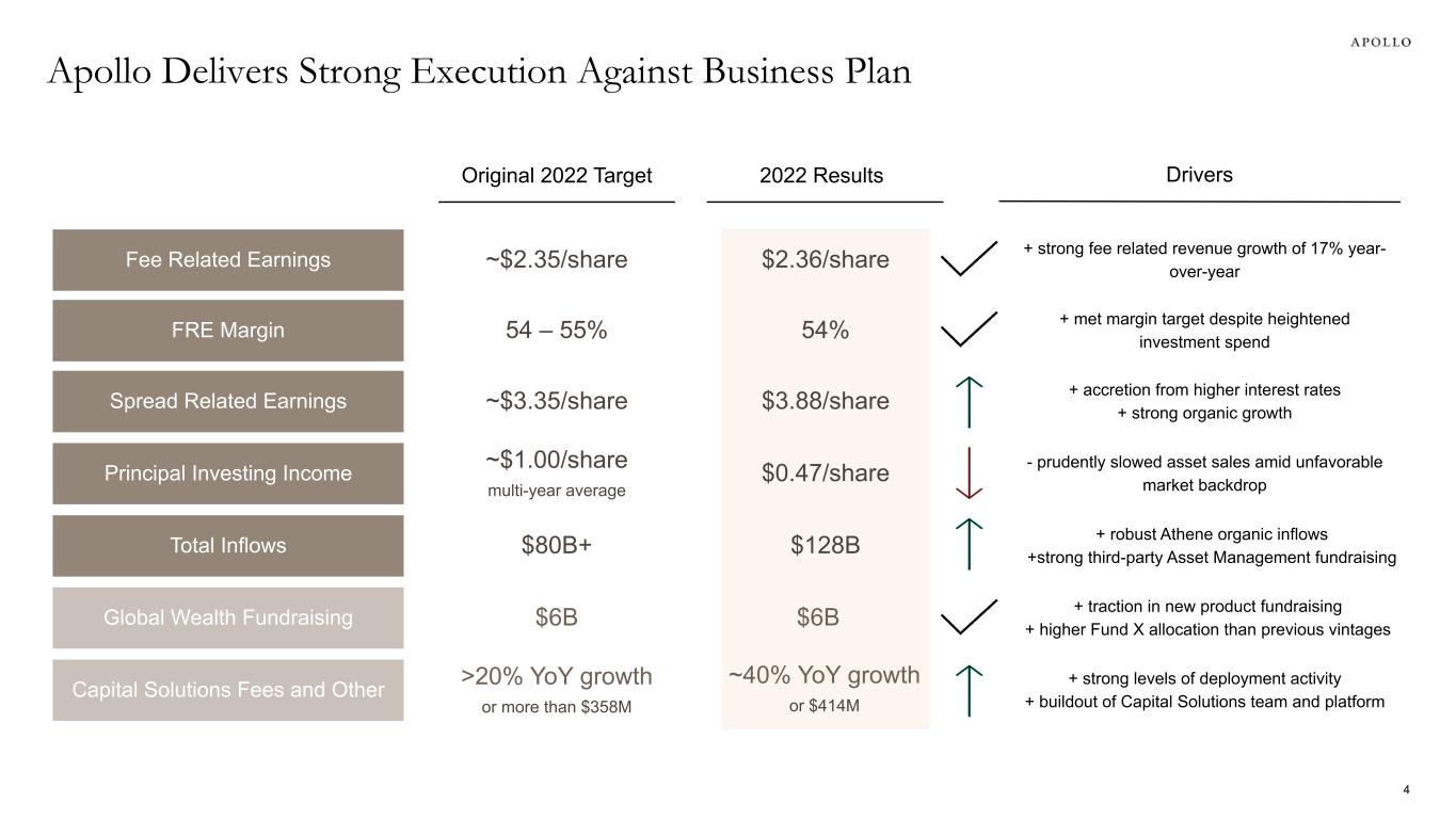 Fourth Quarter and Full Year 2022 Business Highlights Strong fourth quarter financial results complete a stellar year of growth and execution • Record quarterly and annual FRE of $394 million and $1.4 billion, respectively, driven by strong growth in management fees and record capital solutions fees • SRE of $637 million in the fourth quarter and $2.3 billion for the full year, driven by record annual organic inflows from Athene, spread accretion from higher interest rates, and resilient performance within the alternatives portfolio • Together, FRE and SRE of $1.0 billion in the fourth quarter and $3.7 billion for the full year showcase the resilient and growing earnings power of the Asset Management and Retirement Services businesses • Total AUM of $548 billion benefited from inflows of $28 billion in the fourth quarter and $128 billion in 2022 Delivered meaningful progress on key strategic growth initiatives • Origination: Debt origination volume of $26 billion in the fourth quarter or over $100 billion on an annualized basis, aided by the acquisition of several new origination platforms in 2022 • Global Wealth: Raised $6 billion of capital during 2022 from a combination of successful retail-focused product launches and significant distribution expansion • Capital Solutions: Robust fee revenue growth of nearly 40% year-over-year demonstrates Apollo's value as a flexible capital provider coupled with a significantly expanded distribution reach and increased platform integration Strategically allocating capital to drive shareholder value • Buybacks: Repurchased $178 million of common stock in the fourth quarter and $773 million for the full year • Dividends: Intend to distribute an annual dividend of $1.72 per share of common stock commencing with the first quarter 2023 dividend1 • Investments: Allocated $357 million of capital in 2022 to fund strategic investments ✓ ✓ 3 1. The declaration and payment of any dividends are at the sole discretion of the Apollo Global Management, Inc. board of directors, which may change the dividend policy at any time, including, without limitation to, to eliminate the dividend entirely.