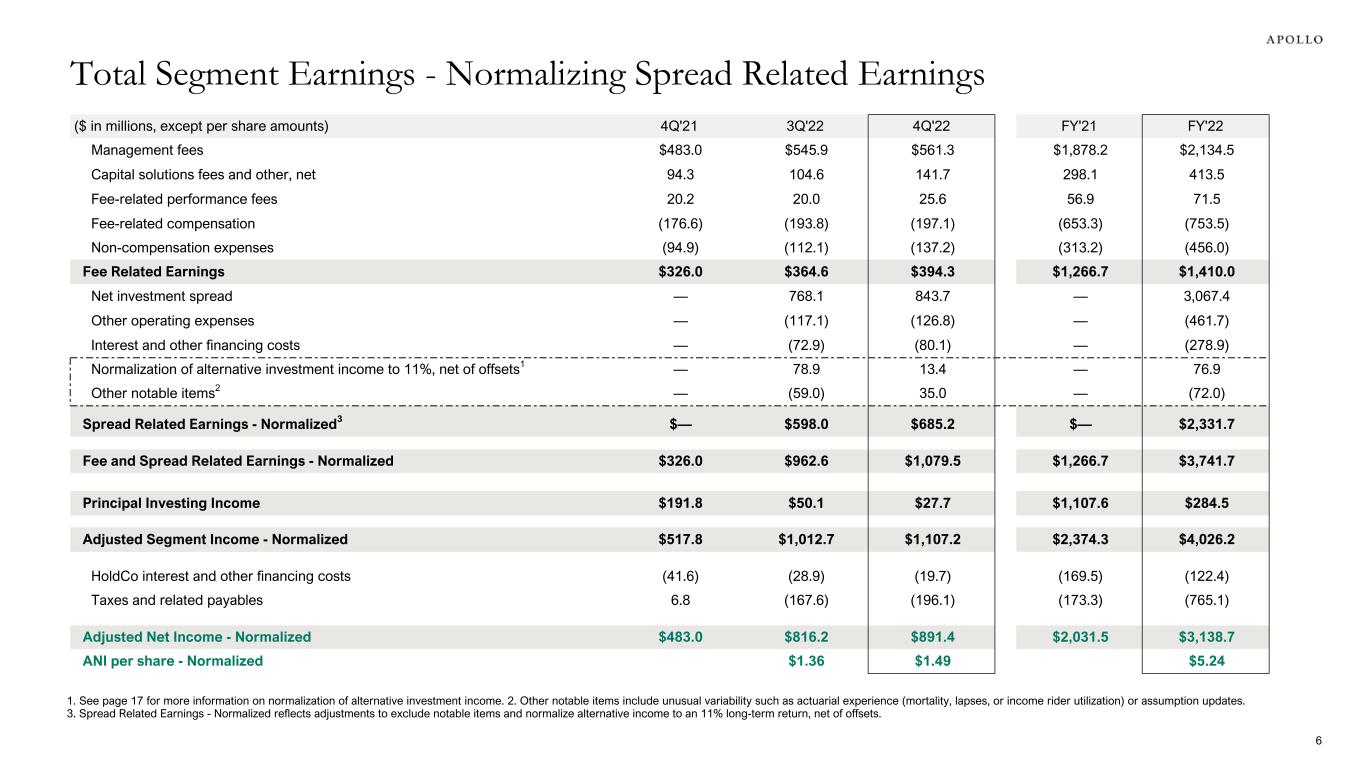 ($ in millions, except per share amounts) 4Q'21 3Q'22 4Q'22 FY'21 FY'22 Management fees $483.0 $545.9 $561.3 $1,878.2 $2,134.5 Capital solutions fees and other, net 94.3 104.6 141.7 298.1 413.5 Fee-related performance fees 20.2 20.0 25.6 56.9 71.5 Fee-related compensation (176.6) (193.8) (197.1) (653.3) (753.5) Non-compensation expenses1 (94.9) (112.1) (137.2) (313.2) (456.0) Fee Related Earnings $326.0 $364.6 $394.3 $1,266.7 $1,410.0 Net investment spread — 768.1 843.7 — 3,067.4 Other operating expenses — (117.1) (126.8) — (461.7) Interest and other financing costs — (72.9) (80.1) — (278.9) Spread Related Earnings $— $578.1 $636.8 $— $2,326.8 Fee and Spread Related Earnings $326.0 $942.7 $1,031.1 $1,266.7 $3,736.8 Principal Investing Income $191.8 $50.1 $27.7 $1,107.6 $284.5 Adjusted Segment Income $517.8 $992.8 $1,058.8 $2,374.3 $4,021.3 HoldCo interest and other financing costs2 (41.6) (28.9) (19.7) (169.5) (122.4) Taxes and related payables3 6.8 (163.4) (185.9) (173.3) (764.1) Adjusted Net Income $483.0 $800.5 $853.2 $2,031.5 $3,134.8 ANI per share $1.05 $1.33 $1.42 $4.56 $5.21 Note: Amounts for spread related earnings on this page and subsequent pages are not presented for periods prior to the closing of the merger with Athene on January 1, 2022. 1. Non-compensation expenses include placement fees of $1.4 million and $3.3 million, respectively, for 4Q'22 and FY'22. 2. Represents interest and other financing costs related to Apollo Global Management, Inc. not attributable to any specific segment. 3. Taxes and related payables for FY'22 reflects the common stockholders’ reduced ownership of the underlying Apollo Operating Group prior to the merger with Athene. Total Segment Earnings 5
