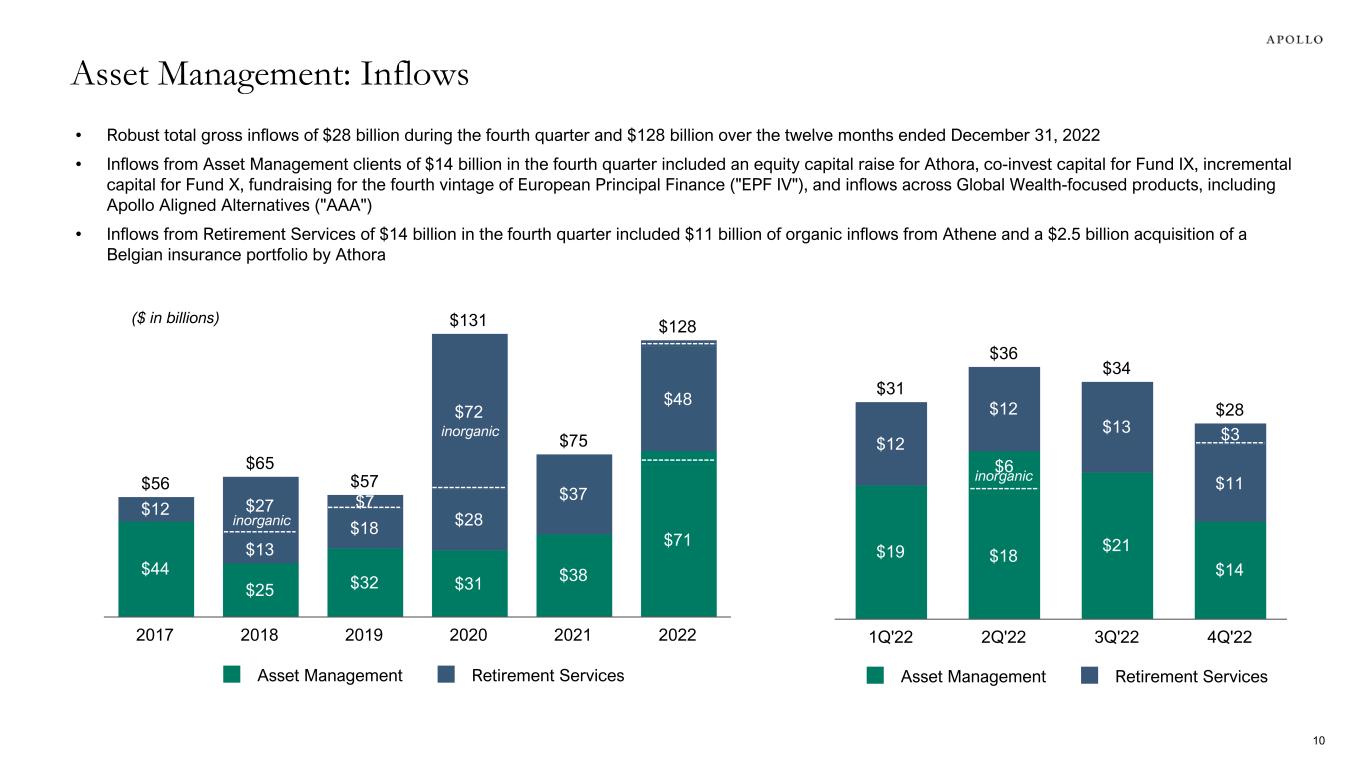 Total AUM ($bn) Fee-Generating AUM ($bn) • Total AUM increased $50 billion, or 10%, year-over-year driven by $78 billion of inflows from Asset Management and $50 billion of inflows from Retirement Services, partially offset by $27 billion of realizations, $24 billion of normal course outflows at Athene, and $14 billion of mark-to-market depreciation from interest rates and foreign exchange at Athora • Fee-Generating AUM increased $43 billion, or 12%, year-over-year primarily driven by strong organic growth at Athene, fundraising across a variety of Asset Management strategies, and inorganic growth at Athora and the Griffin acquisition • Approximately 60% of Apollo’s total AUM is comprised of $321 billion of perpetual capital, which is highly scalable and does not rely on cyclical fundraising $455 $498 $548 $333 $360 $392 $42 $53 $56$80 $84 $99 Yield Hybrid Equity 4Q'20 4Q'21 4Q'22 $349 $369 $412 $286 $307 $339 $18 $22 $26 $45 $40 $47 Yield Hybrid Equity 4Q'20 4Q'21 4Q'22 Perpetual Capital AUM ($bn) $273 $296 $321 $184 $213 $236 $69 $59 $53$20 $24 $33 Athene Athora Other 4Q'20 4Q'21 4Q'22 9 Asset Management: Assets Under Management