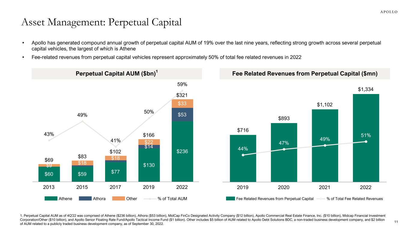 $56 $75 $65 $57 $131 $128 $44 $25 $32 $31 $38 $71 $12 $13 $18 $28 $37 $48 $27 $7 $72 Asset Management Retirement Services 2017 2018 2019 2020 2021 2022 • Robust total gross inflows of $28 billion during the fourth quarter and $128 billion over the twelve months ended December 31, 2022 • Inflows from Asset Management clients of $14 billion in the fourth quarter included an equity capital raise for Athora, co-invest capital for Fund IX, incremental capital for Fund X, fundraising for the fourth vintage of European Principal Finance ("EPF IV"), and inflows across Global Wealth-focused products, including Apollo Aligned Alternatives ("AAA") • Inflows from Retirement Services of $14 billion in the fourth quarter included $11 billion of organic inflows from Athene and a $2.5 billion acquisition of a Belgian insurance portfolio by Athora ($ in billions) Asset Management: Inflows inorganic inorganic 10 $31 $36 $34 $28 $19 $18 $21 $14 $6 $12 $12 $13 $11 $3 Asset Management Retirement Services 1Q'22 2Q'22 3Q'22 4Q'22 inorganic