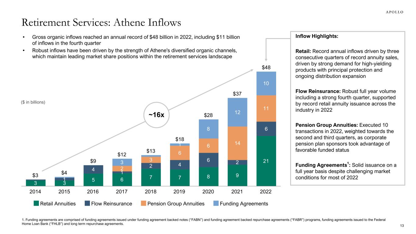 $3 $9 $4 $12 $13 $18 $28 $37 $48 3 3 5 6 7 7 8 9 21 1 4 1 2 4 6 2 6 2 3 6 6 14 11 3 1 8 12 10 Retail Annuities Flow Reinsurance Pension Group Annuities Funding Agreements 2014 2015 2016 2017 2018 2019 2020 2021 2022 ~16x • Gross organic inflows reached an annual record of $48 billion in 2022, including $11 billion of inflows in the fourth quarter • Robust inflows have been driven by the strength of Athene's diversified organic channels, which maintain leading market share positions within the retirement services landscape Inflow Highlights: Retail: Record annual inflows driven by three consecutive quarters of record annuity sales, driven by strong demand for high-yielding products with principal protection and ongoing distribution expansion Flow Reinsurance: Robust full year volume including a strong fourth quarter, supported by record retail annuity issuance across the industry in 2022 Pension Group Annuities: Executed 10 transactions in 2022, weighted towards the second and third quarters, as corporate pension plan sponsors took advantage of favorable funded status Funding Agreements1: Solid issuance on a full year basis despite challenging market conditions for most of 2022 ($ in billions) 1. Funding agreements are comprised of funding agreements issued under funding agreement backed notes (“FABN”) and funding agreement backed repurchase agreements (“FABR”) programs, funding agreements issued to the Federal Home Loan Bank (“FHLB”) and long term repurchase agreements. 13 Retirement Services: Athene Inflows