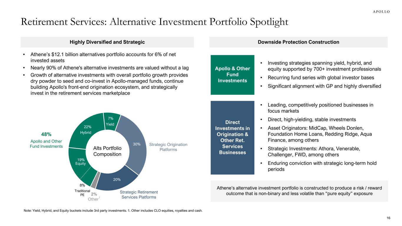 1.24% 0.47% (0.30)% (0.01)% 1.40% 3Q'22 4Q'22 1.20% 0.49% 0.12% (0.50)% (0.01)% 1.30% 3Q'22 4Q'22 Investment Portfolio Highlights Retirement Services Net Spread Bridge (QoQ) Normalized Retirement Services Net Spread Bridge (QoQ) • 96% of Athene’s fixed income portfolio1 is invested in investment grade assets • 20% or $39 billion of Athene’s portfolio2 is invested in floating rate assets, 13% or $25 billion net of floating rate liabilities3 • Apollo Asset Management aims to generate 30 to 40 basis points of asset outperformance across Athene's portfolio • Target asset classes which generate illiquidity or structuring premium such as CLOs and ABS, not incremental credit risk • Focus on directly originated, senior secured loans where control of origination results in better risk-adjusted return • Historical annual credit losses across total portfolio of only 7 basis points over the past five years compared to 12 basis points for the industry4 Higher floating rate income and new money yields Higher cost of funds on floating rate liabilities and new business/ financing costs Higher floating rate income and new money yields Higher cost of funds on floating rate liabilities and new business/ financing costs Operating Expenses Retirement Services: Portfolio & Spread Highlights 1. As of December 31, 2022, 96% of $112 billion of available for sale securities designated NAIC 1 or 2. 2. Defined as Athene's net invested assets, which totaled $196 billion, as of December 31, 2022. 3. Floating rate liabilities at notional were ~$14 billion, or ~7% of Athene's net invested assets, as of December 31, 2022. 4. Represents U.S. statutory impairments per SNL Financial as of December 31, 2021 (2017 - 2021). Industry average includes AEL, AIG, AMP, BHF, EQH, FG, LNC, MET, PFG, PRU, VOYA and Transamerica. For Athene, U.S. statutory data adjusted to include impairments and assets in Bermuda. 15 Operating expenses Alts return