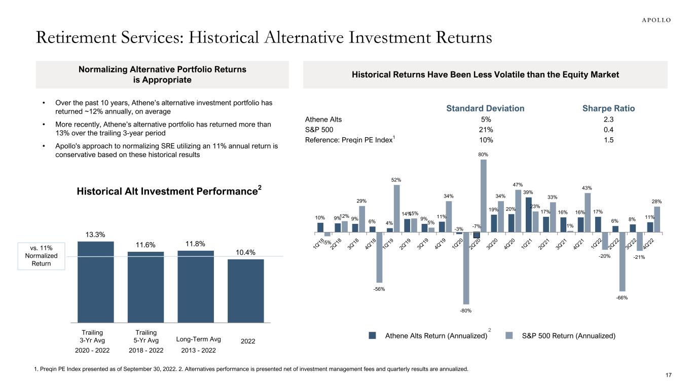 10% 9% 9% 6% 4% 14% 9% 11% -3% 19% 20% 39% 17% 16% 16% 17% 6% 8% 11% -5% 12% 29% -56% 52% 15% 5% 34% -80% 80% 34% 47% 23% 33% 1% 43% -20% -66% -21% 28% Athene Alts Return (Annualized) S&P 500 Return (Annualized) 1Q '18 2Q '18 3Q '18 4Q '18 1Q '19 2Q '19 3Q '19 4Q '19 1Q '20 2Q '20 3Q '20 4Q '20 1Q '21 2Q '21 3Q '21 4Q '21 1Q '22 2Q '22 3Q '22 4Q '22 Normalizing Alternative Portfolio Returns is Appropriate Historical Returns Have Been Less Volatile than the Equity Market • Over the past 10 years, Athene’s alternative investment portfolio has returned ~12% annually, on average • More recently, Athene’s alternative portfolio has returned more than 13% over the trailing 3-year period • Apollo's approach to normalizing SRE utilizing an 11% annual return is conservative based on these historical results 13.3% 11.6% 11.8% 10.4% Historical Alt Investment Performance2 Trailing 3-Yr Avg Trailing 5-Yr Avg Long-Term Avg 2022 2020 - 2022 2018 - 2022 2013 - 2022 vs. 11% Normalized Return Standard Deviation Sharpe Ratio Athene Alts 5% 2.3 S&P 500 21% 0.4 Reference: Preqin PE Index1 10% 1.5 2 1. Preqin PE Index presented as of September 30, 2022. 2. Alternatives performance is presented net of investment management fees and quarterly results are annualized. 17 Retirement Services: Historical Alternative Investment Returns -7%
