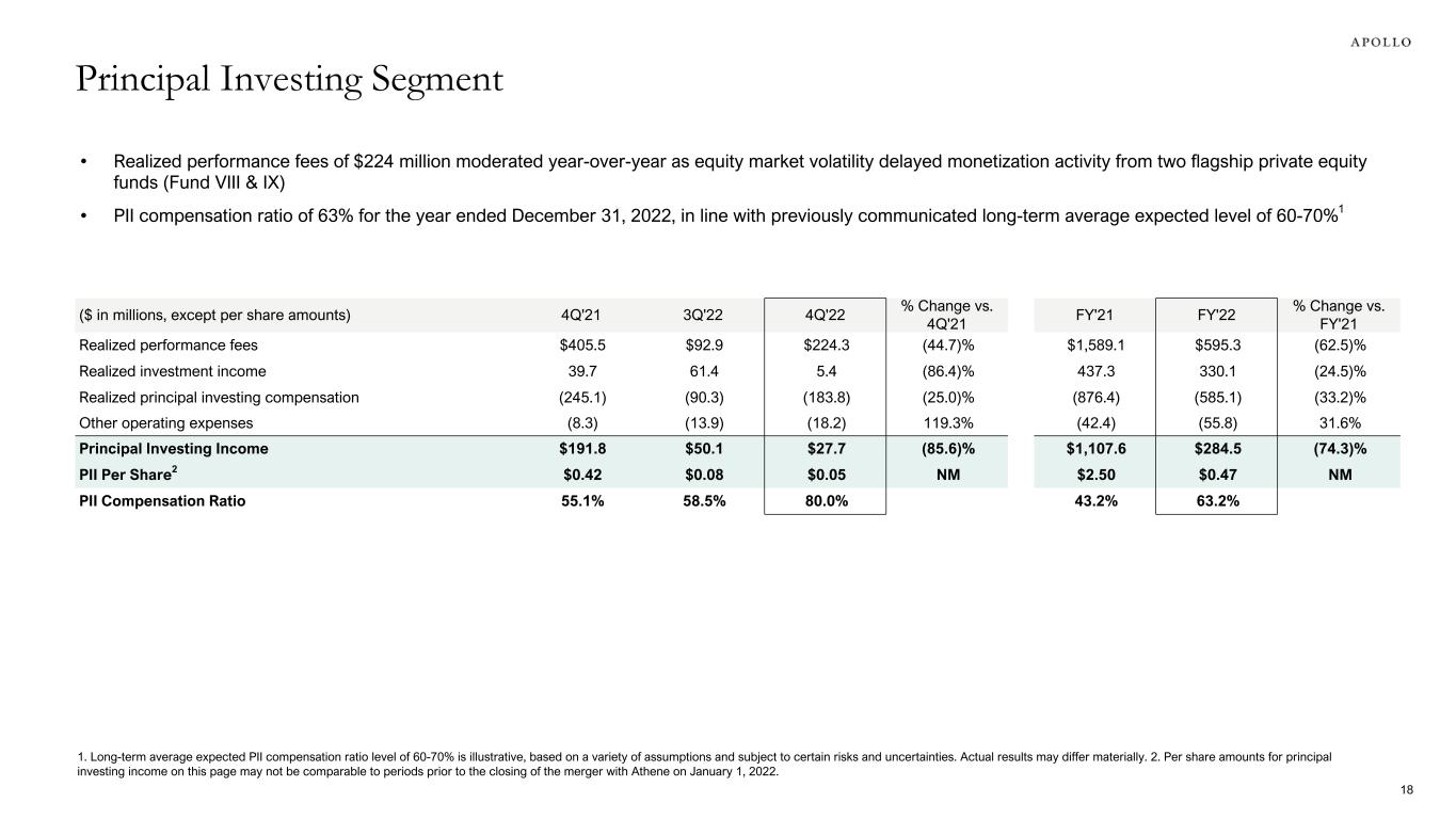 ($ in millions, except per share amounts) 4Q'21 3Q'22 4Q'22 FY'21 FY'22 Revenues Asset Management Management fees $519 $389 $403 $1,921 $1,503 Advisory and transaction fees, net 97 110 157 302 443 Investment income (loss) 574 (31) 321 3,699 796 Incentive fees 5 9 10 29 27 Retirement Services Premiums — 3,045 869 — 11,638 Product charges — 184 193 — 718 Net investment income — 2,033 2,481 — 8,148 Investment related gains (losses) — (2,847) 106 — (12,717) Revenues of consolidated variable interest entities — 114 292 — 440 Other revenues — (27) 10 — (28) Total Revenues 1,195 2,979 4,842 5,951 10,968 Expenses Asset Management Compensation and benefits (1,509) (386) (514) (3,493) (1,943) Interest expense (33) (31) (30) (138) (124) General, administrative and other (154) (167) (210) (482) (682) Retirement Services Interest sensitive contract benefits — (89) (1,114) — (541) Future policy and other policy benefits — (3,294) (1,322) — (12,310) Amortization of deferred acquisition costs, deferred sales inducements and value of business acquired — (125) (134) — (509) Policy and other operating expenses — (343) (389) — (1,371) Total Expenses (1,696) (4,435) (3,713) (4,113) (17,480) Other Income (Loss) – Asset Management Net gains (losses) from investment activities 1,172 (16) 1 2,611 165 Net gains from investment activities of consolidated variable interest entities 157 85 29 557 494 Other income (loss), net (120) 28 12 (145) 38 Total Other Income (Loss) 1,209 97 42 3,023 697 Income (loss) before income tax (provision) benefit 708 (1,359) 1,171 4,861 (5,815) Income tax (provision) benefit (96) 185 (211) (594) 1,069 Net income (loss) 612 (1,174) 960 4,267 (4,746) Net (income) loss attributable to non-controlling interests (368) 298 (376) (2,428) 1,533 Net income (loss) attributable to Apollo Global Management, Inc. 244 (876) 584 1,839 (3,213) Preferred stock dividends (10) — — (37) — Net income (loss) attributable to Apollo Global Management, Inc. Common Stockholders $234 $(876) $584 $1,802 $(3,213) Earnings (Loss) per share Net income (loss) attributable to Common Stockholders - Basic $0.91 $(1.52) $0.97 $7.32 $(5.57) Net income (loss) attributable to Common Stockholders - Diluted $0.91 $(1.52) $0.97 $7.32 $(5.57) Weighted average shares outstanding – Basic 246 584 583 237 585 Weighted average shares outstanding – Diluted 246 584 583 237 585 GAAP Income Statement (Unaudited) 2