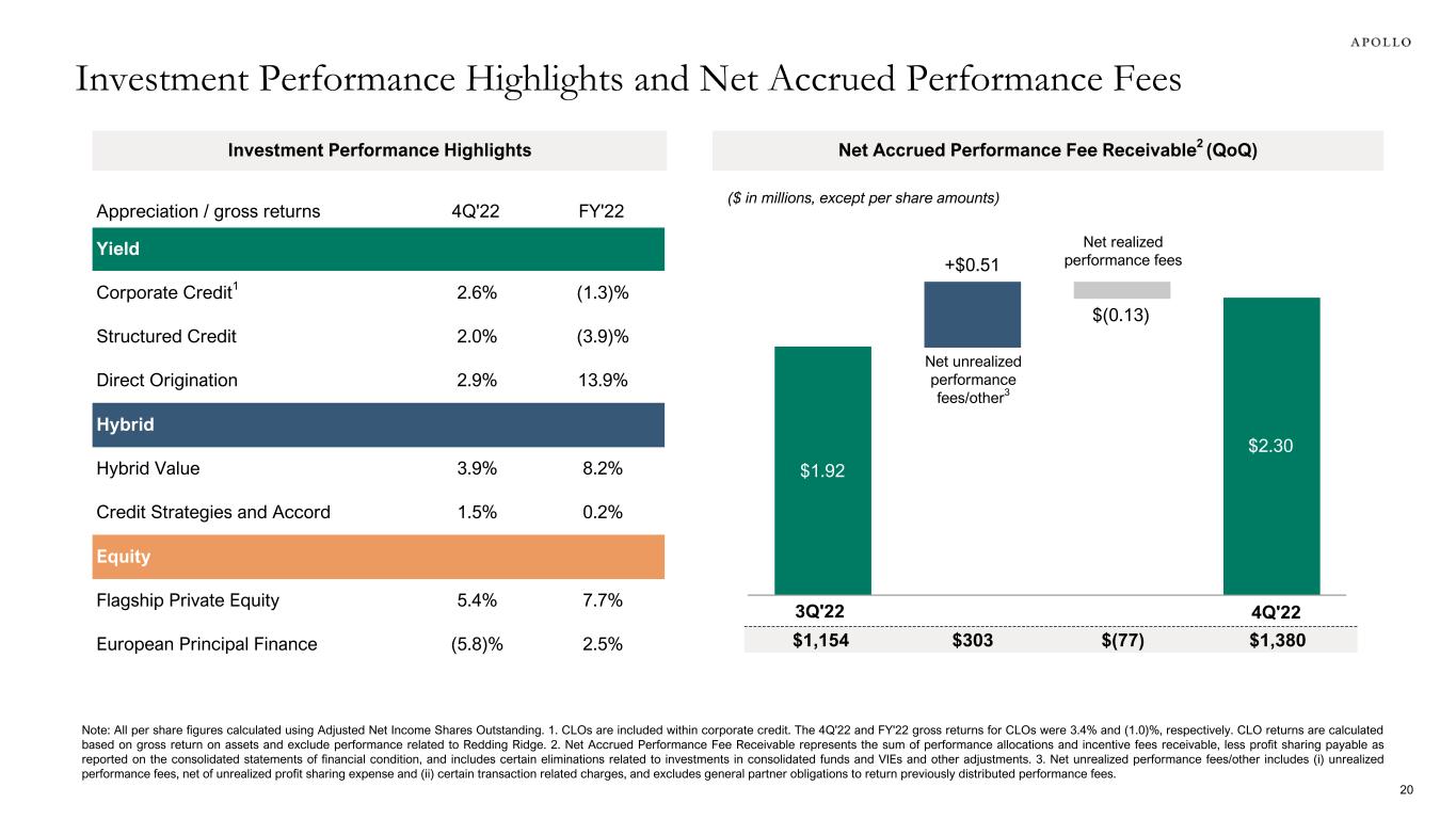 • "Gross IRR" of infrastructure funds represents the cumulative investment-related cash flows in the fund itself (and not any one investor in the fund), on the basis of the actual timing of cash inflows and outflows (for unrealized investments assuming disposition on December 31, 2022 or other date specified) starting on the date that each investment closes, and the return is annualized and compounded before management fees, performance fees, and certain other expenses (including interest incurred by the fund itself) and measures the returns on the fund’s investments as a whole without regard to whether all of the returns would, if distributed, be payable to the fund’s investors. Non-USD fund cash flows and residual values are converted to USD using the spot rate as of the reporting date. In addition, gross IRRs at the fund level will differ from those at the individual investor level as a result of, among other factors, timing of investor-level inflows and outflows. Gross IRR does not represent the return to any fund investor. • “Gross Return” of a yield fund, European Principal Finance, Credit Strategies and Accord is the monthly or quarterly time-weighted return that is equal to the percentage change in the value of a fund’s portfolio, adjusted for all contributions and withdrawals (cash flows) before the effects of management fees, incentive fees allocated to the general partner, or other fees and expenses. Returns for these categories are calculated for all funds and accounts in the respective strategies excluding assets for Athene, Athora and certain other entities where Apollo manages or may manage a significant portion of the total company assets. Returns of CLOs represent the gross returns on assets. Returns over multiple periods are calculated by geometrically linking each period’s return over time. • “HoldCo” refers to Apollo Global Management, Inc. (f/k/a Tango Holdings, Inc.) • “Inflows” within the Asset Management segment represents (i) at the individual strategy level, subscriptions, commitments, and other increases in available capital, such as acquisitions or leverage, net of inter-strategy transfers, and (ii) on an aggregate basis, the sum of inflows across the yield, hybrid and equity strategies. • “Net Invested Assets” represents the investments that directly back Athene's net reserve liabilities as well as surplus assets. Net invested assets is used in the computation of net investment earned rate, which is used to analyze the profitability of Athene’s investment portfolio. Net invested assets includes (a) total investments on the consolidated balance sheets with AFS securities at cost or amortized cost, excluding derivatives, (b) cash and cash equivalents and restricted cash, (c) investments in related parties, (d) accrued investment income, (e) VIE and VOE assets, liabilities and noncontrolling interest adjustments, (f) net investment payables and receivables, (g) policy loans ceded (which offset the direct policy loans in total investments) and (h) an adjustment for the allowance for credit losses. Net invested assets also excludes assets associated with funds withheld liabilities related to business exited through reinsurance agreements and derivative collateral (offsetting the related cash positions). Athene includes the underlying investments supporting its assumed funds withheld and modco agreements in its net invested assets calculation in order to match the assets with the income received. Athene believes the adjustments for reinsurance provide a view of the assets for which it has economic exposure. Net invested assets includes Athene’s proportionate share of ACRA investments, based on Athene’s economic ownership, but does not include the proportionate share of investments associated with the noncontrolling interest. Net invested assets are averaged over the number of quarters in the relevant period to compute a net investment earned rate for such period. While Athene believes net invested assets is a meaningful financial metric and enhances the understanding of the underlying drivers of its investment portfolio, it should not be used as a substitute for total investments, including related parties, presented under GAAP. • “Net Investment Earned Rate” is computed as the income from Athene's net invested assets divided by the average net invested assets, for the relevant period. • “Net Investment Spread” measures Athene's investment performance plus its strategic capital management fees, less its total cost of funds. Net investment earned rate is a key measure of Athene's investment performance while cost of funds is a key measure of the cost of its policyholder benefits and liabilities. • "Net IRR" of accord series and the European principal finance funds represents the annualized return of a fund after management fees, performance fees allocated to the general partner and certain other expenses, calculated on investors that pay such fees. The terminal value is the net asset value as of the reporting date. Non-USD fund cash flows and residual values are converted to USD using the spot rate as of the reporting date. In addition, net IRR at the fund level will differ from that at the individual investor level as a result of, among other factors, timing of investor-level inflows and outflows. Net IRR does not represent the return to any fund investor. • "Net IRR" of a traditional private equity or the hybrid value funds represents the gross IRR applicable to the funds, including returns for related parties which may not pay fees or performance fees, net of management fees, certain expenses (including interest incurred or earned by the fund itself) and realized performance fees all offset to the extent of interest income, and measures returns at the fund level on amounts that, if distributed, would be paid to investors of the fund. The timing of cash flows applicable to investments, management fees and cer