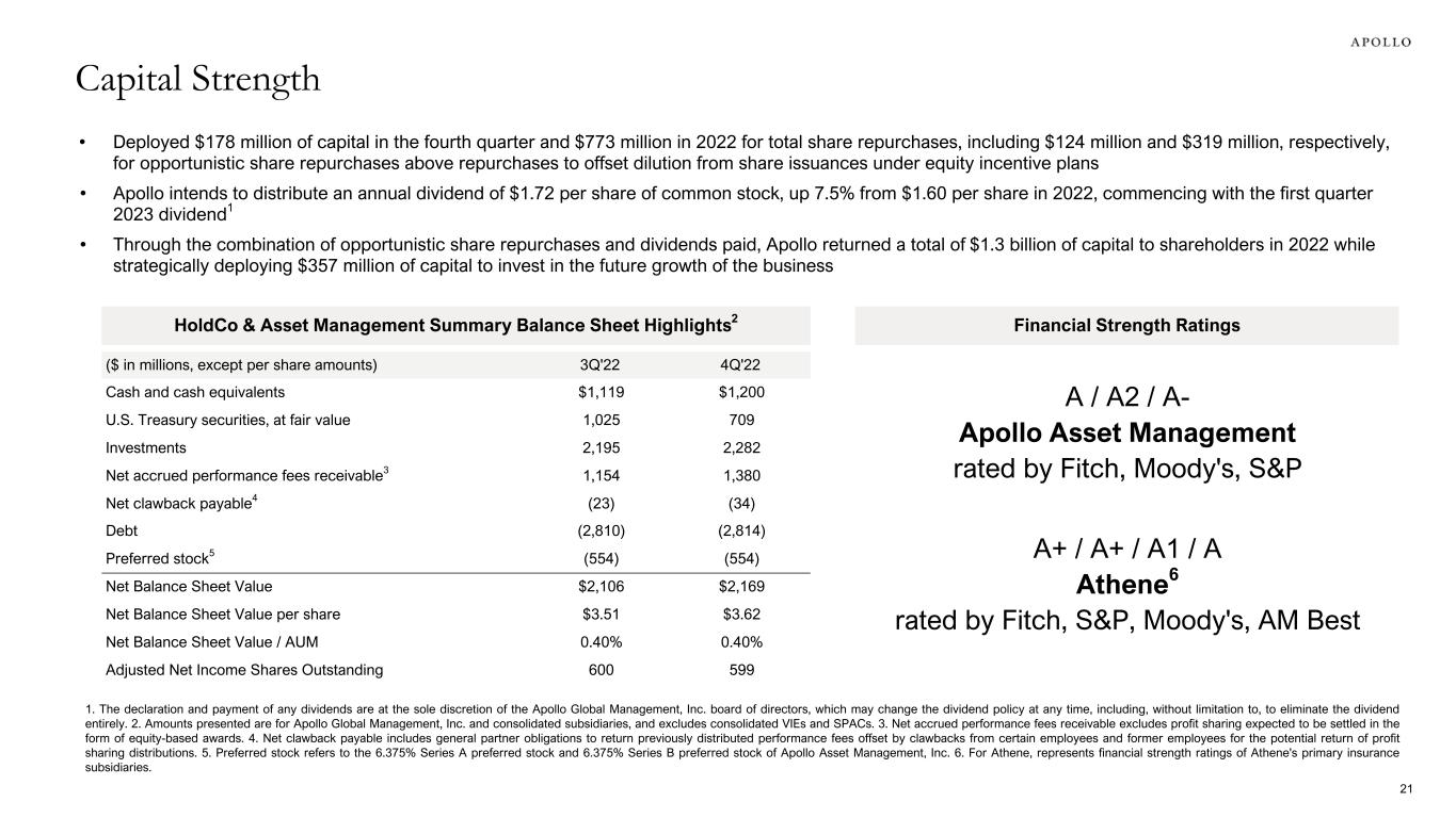 • Deployed $178 million of capital in the fourth quarter and $773 million in 2022 for total share repurchases, including $124 million and $319 million, respectively, for opportunistic share repurchases above repurchases to offset dilution from share issuances under equity incentive plans • Apollo intends to distribute an annual dividend of $1.72 per share of common stock, up 7.5% from $1.60 per share in 2022, commencing with the first quarter 2023 dividend1 • Through the combination of opportunistic share repurchases and dividends paid, Apollo returned a total of $1.3 billion of capital to shareholders in 2022 while strategically deploying $357 million of capital to invest in the future growth of the business HoldCo & Asset Management Summary Balance Sheet Highlights2 Financial Strength Ratings ($ in millions, except per share amounts) 3Q'22 4Q'22 Cash and cash equivalents $1,119 $1,200 U.S. Treasury securities, at fair value 1,025 709 Investments 2,195 2,282 Net accrued performance fees receivable3 1,154 1,380 Net clawback payable4 (23) (34) Debt (2,810) (2,814) Preferred stock5 (554) (554) Net Balance Sheet Value $2,106 $2,169 Net Balance Sheet Value per share $3.51 $3.62 Net Balance Sheet Value / AUM 0.40% 0.40% Adjusted Net Income Shares Outstanding 600 599 A / A2 / A- Apollo Asset Management rated by Fitch, Moody's, S&P A+ / A+ / A1 / A Athene6 rated by Fitch, S&P, Moody's, AM Best 1. The declaration and payment of any dividends are at the sole discretion of the Apollo Global Management, Inc. board of directors, which may change the dividend policy at any time, including, without limitation to, to eliminate the dividend entirely. 2. Amounts presented are for Apollo Global Management, Inc. and consolidated subsidiaries, and excludes consolidated VIEs and SPACs. 3. Net accrued performance fees receivable excludes profit sharing expected to be settled in the form of equity-based awards. 4. Net clawback payable includes general partner obligations to return previously distributed performance fees offset by clawbacks from certain employees and former employees for the potential return of profit sharing distributions. 5. Preferred stock refers to the 6.375% Series A preferred stock and 6.375% Series B preferred stock of Apollo Asset Management, Inc. 6. For Athene, represents financial strength ratings of Athene's primary insurance subsidiaries. Capital Strength 21