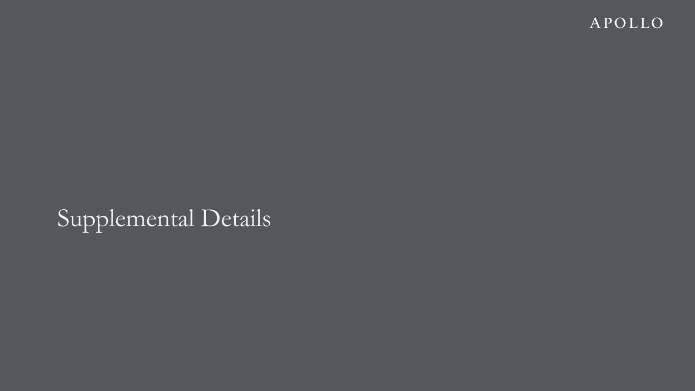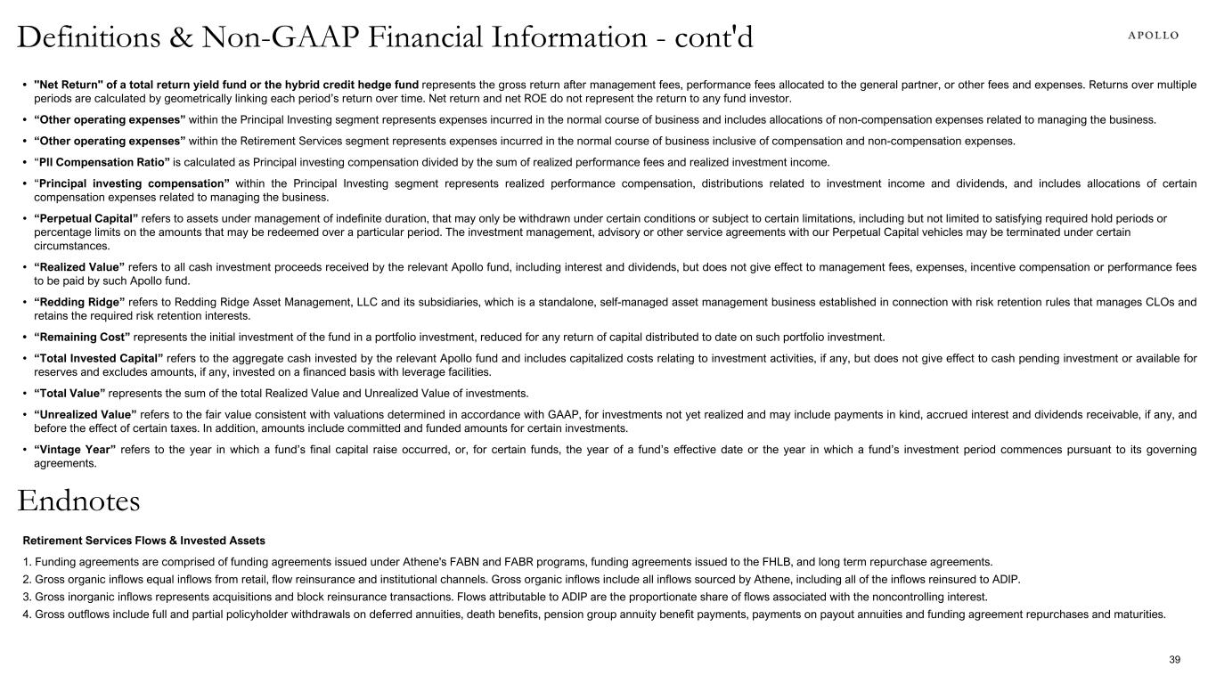 • "Net Return" of a total return yield fund or the hybrid credit hedge fund represents the gross return after management fees, performance fees allocated to the general partner, or other fees and expenses. Returns over multiple periods are calculated by geometrically linking each period’s return over time. Net return and net ROE do not represent the return to any fund investor. • “Other operating expenses” within the Principal Investing segment represents expenses incurred in the normal course of business and includes allocations of non-compensation expenses related to managing the business. • “Other operating expenses” within the Retirement Services segment represents expenses incurred in the normal course of business inclusive of compensation and non-compensation expenses. • “PII Compensation Ratio” is calculated as Principal investing compensation divided by the sum of realized performance fees and realized investment income. • “Principal investing compensation” within the Principal Investing segment represents realized performance compensation, distributions related to investment income and dividends, and includes allocations of certain compensation expenses related to managing the business. • “Perpetual Capital” refers to assets under management of indefinite duration, that may only be withdrawn under certain conditions or subject to certain limitations, including but not limited to satisfying required hold periods or percentage limits on the amounts that may be redeemed over a particular period. The investment management, advisory or other service agreements with our Perpetual Capital vehicles may be terminated under certain circumstances. • “Realized Value” refers to all cash investment proceeds received by the relevant Apollo fund, including interest and dividends, but does not give effect to management fees, expenses, incentive compensation or performance fees to be paid by such Apollo fund. • “Redding Ridge” refers to Redding Ridge Asset Management, LLC and its subsidiaries, which is a standalone, self-managed asset management business established in connection with risk retention rules that manages CLOs and retains the required risk retention interests. • “Remaining Cost” represents the initial investment of the fund in a portfolio investment, reduced for any return of capital distributed to date on such portfolio investment. • “Total Invested Capital” refers to the aggregate cash invested by the relevant Apollo fund and includes capitalized costs relating to investment activities, if any, but does not give effect to cash pending investment or available for reserves and excludes amounts, if any, invested on a financed basis with leverage facilities. • “Total Value” represents the sum of the total Realized Value and Unrealized Value of investments. • “Unrealized Value” refers to the fair value consistent with valuations determined in accordance with GAAP, for investments not yet realized and may include payments in kind, accrued interest and dividends receivable, if any, and before the effect of certain taxes. In addition, amounts include committed and funded amounts for certain investments. • “Vintage Year” refers to the year in which a fund’s final capital raise occurred, or, for certain funds, the year of a fund’s effective date or the year in which a fund’s investment period commences pursuant to its governing agreements. 39 Endnotes Retirement Services Flows & Invested Assets 1. Funding agreements are comprised of funding agreements issued under Athene's FABN and FABR programs, funding agreements issued to the FHLB, and long term repurchase agreements. 2. Gross organic inflows equal inflows from retail, flow reinsurance and institutional channels. Gross organic inflows include all inflows sourced by Athene, including all of the inflows reinsured to ADIP. 3. Gross inorganic inflows represents acquisitions and block reinsurance transactions. Flows attributable to ADIP are the proportionate share of flows associated with the noncontrolling interest. 4. Gross outflows include full and partial policyholder withdrawals on deferred annuities, death benefits, pension group annuity benefit payments, payments on payout annuities and funding agreement repurchases and maturities. Definitions & Non-GAAP Financial Information - cont'd