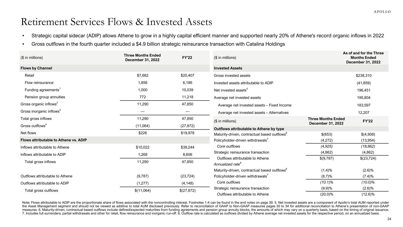($ in millions) Yield3 Hybrid Equity Total Beginning Balance $372,632 $56,738 $93,922 $523,292 Inflows 21,322 1,693 4,879 27,894 Outflows2 (8,074) (477) (758) (9,309) Net Flows 13,248 1,216 4,121 18,585 Realizations (444) (2,306) (2,421) (5,171) Market Activity 7,030 762 3,149 10,941 Ending Balance $392,466 $56,410 $98,771 $547,647 Three Months Ended December 31, 2022 ($ in millions) Yield3 Hybrid Equity Total Beginning Balance $360,289 $52,772 $84,491 $497,552 Inflows 93,676 10,982 23,617 128,275 Outflows2 (38,132) (1,487) (859) (40,478) Net Flows 55,544 9,495 22,758 87,797 Realizations (8,625) (6,554) (11,447) (26,626) Market Activity (14,742) 697 2,969 (11,076) Ending Balance $392,466 $56,410 $98,771 $547,647 Twelve Months Ended December 31, 2022 ($ in millions) Yield3 Hybrid Equity Total Beginning Balance $323,939 $26,158 $44,123 $394,220 Inflows 16,998 1,248 13,495 31,741 Outflows2 (8,373) (1,376) (9,579) (19,328) Net Flows 8,625 (128) 3,916 12,413 Realizations (307) (541) (1,110) (1,958) Market Activity 6,564 624 224 7,412 Ending Balance $338,821 $26,113 $47,153 $412,087 Three Months Ended December 31, 2022 ($ in millions) Yield3 Hybrid Equity Total Beginning Balance $307,306 $21,845 $39,950 $369,101 Inflows 81,797 9,497 19,757 111,051 Outflows2 (36,564) (3,563) (10,215) (50,342) Net Flows 45,233 5,934 9,542 60,709 Realizations (1,300) (1,869) (2,211) (5,380) Market Activity (12,418) 203 (128) (12,343) Ending Balance $338,821 $26,113 $47,153 $412,087 Twelve Months Ended December 31, 2022 Fee-Generating AUM Rollforward1 Total AUM Rollforward1 1. Inflows at the individual strategy level represent subscriptions, commitments, and other increases in available capital, such as acquisitions or leverage, net of inter-strategy transfers. Outflows represent redemptions and other decreases in available capital. Realizations represent fund distributions of realized proceeds. Market activity represents gains (losses), the impact of foreign exchange rate fluctuations and other income. 2. Included in the 4Q'22 outflows for Total AUM and FGAUM are $2.0 billion and $1.8 billion of redemptions, respectively. Included in the FY'22 outflows for Total AUM and FGAUM are $4.4 billion and $3.5 billion of redemptions, respectively. 3. As of 4Q'22, Yield AUM includes $27.0 billion of CLOs, $7.6 billion of which Apollo earns fees based on gross assets and $19.4 billion of which relates to Redding Ridge, from which Apollo earns fees based on net asset value. AUM Rollforward 23