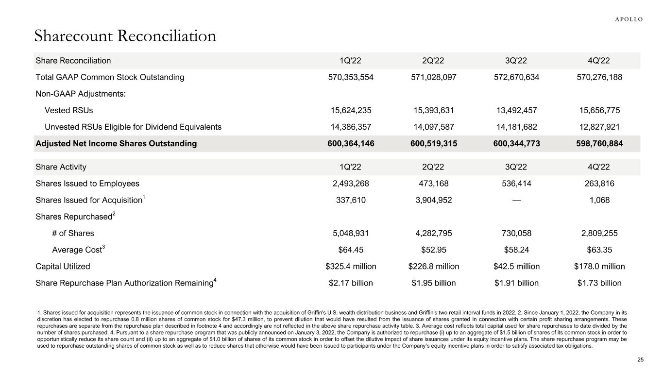 Share Reconciliation 1Q'22 2Q'22 3Q'22 4Q'22 Total GAAP Common Stock Outstanding 570,353,554 571,028,097 572,670,634 570,276,188 Non-GAAP Adjustments: Vested RSUs 15,624,235 15,393,631 13,492,457 15,656,775 Unvested RSUs Eligible for Dividend Equivalents 14,386,357 14,097,587 14,181,682 12,827,921 Adjusted Net Income Shares Outstanding 600,364,146 600,519,315 600,344,773 598,760,884 1. Shares issued for acquisition represents the issuance of common stock in connection with the acquisition of Griffin's U.S. wealth distribution business and Griffin's two retail interval funds in 2022. 2. Since January 1, 2022, the Company in its discretion has elected to repurchase 0.8 million shares of common stock for $47.3 million, to prevent dilution that would have resulted from the issuance of shares granted in connection with certain profit sharing arrangements. These repurchases are separate from the repurchase plan described in footnote 4 and accordingly are not reflected in the above share repurchase activity table. 3. Average cost reflects total capital used for share repurchases to date divided by the number of shares purchased. 4. Pursuant to a share repurchase program that was publicly announced on January 3, 2022, the Company is authorized to repurchase (i) up to an aggregate of $1.5 billion of shares of its common stock in order to opportunistically reduce its share count and (ii) up to an aggregate of $1.0 billion of shares of its common stock in order to offset the dilutive impact of share issuances under its equity incentive plans. The share repurchase program may be used to repurchase outstanding shares of common stock as well as to reduce shares that otherwise would have been issued to participants under the Company’s equity incentive plans in order to satisfy associated tax obligations. Share Activity 1Q'22 2Q'22 3Q'22 4Q'22 Shares Issued to Employees 2,493,268 473,168 536,414 263,816 Shares Issued for Acquisition1 337,610 3,904,952 — 1,068 Shares Repurchased2 # of Shares 5,048,931 4,282,795 730,058 2,809,255 Average Cost3 $64.45 $52.95 $58.24 $63.35 Capital Utilized $325.4 million $226.8 million $42.5 million $178.0 million Share Repurchase Plan Authorization Remaining4 $2.17 billion $1.95 billion $1.91 billion $1.73 billion Sharecount Reconciliation 25