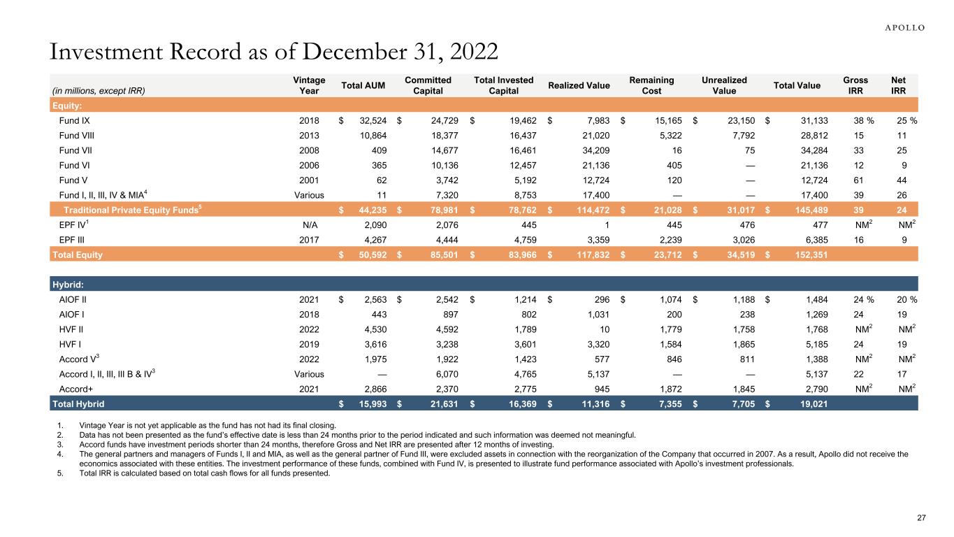 (in millions, except IRR) Vintage Year Total AUM Committed Capital Total Invested Capital Realized Value Remaining Cost Unrealized Value Total Value Gross IRR Net IRR Equity: Fund IX 2018 $ 32,524 $ 24,729 $ 19,462 $ 7,983 $ 15,165 $ 23,150 $ 31,133 38 % 25 % Fund VIII 2013 10,864 18,377 16,437 21,020 5,322 7,792 28,812 15 11 Fund VII 2008 409 14,677 16,461 34,209 16 75 34,284 33 25 Fund VI 2006 365 10,136 12,457 21,136 405 — 21,136 12 9 Fund V 2001 62 3,742 5,192 12,724 120 — 12,724 61 44 Fund I, II, III, IV & MIA4 Various 11 7,320 8,753 17,400 — — 17,400 39 26 Traditional Private Equity Funds5 $ 44,235 $ 78,981 $ 78,762 $ 114,472 $ 21,028 $ 31,017 $ 145,489 39 24 EPF IV1 N/A 2,090 2,076 445 1 445 476 477 NM2 NM2 EPF III 2017 4,267 4,444 4,759 3,359 2,239 3,026 6,385 16 9 Total Equity $ 50,592 $ 85,501 $ 83,966 $ 117,832 $ 23,712 $ 34,519 $ 152,351 Hybrid: AIOF II 2021 $ 2,563 $ 2,542 $ 1,214 $ 296 $ 1,074 $ 1,188 $ 1,484 24 % 20 % AIOF I 2018 443 897 802 1,031 200 238 1,269 24 19 HVF II 2022 4,530 4,592 1,789 10 1,779 1,758 1,768 NM2 NM2 HVF I 2019 3,616 3,238 3,601 3,320 1,584 1,865 5,185 24 19 Accord V3 2022 1,975 1,922 1,423 577 846 811 1,388 NM2 NM2 Accord I, II, III, III B & IV3 Various — 6,070 4,765 5,137 — — 5,137 22 17 Accord+ 2021 2,866 2,370 2,775 945 1,872 1,845 2,790 NM2 NM2 Total Hybrid $ 15,993 $ 21,631 $ 16,369 $ 11,316 $ 7,355 $ 7,705 $ 19,021 Investment Record as of December 31, 2022 27 1. Vintage Year is not yet applicable as the fund has not had its final closing. 2. Data has not been presented as the fund’s effective date is less than 24 months prior to the period indicated and such information was deemed not meaningful. 3. Accord funds have investment periods shorter than 24 months, therefore Gross and Net IRR are presented after 12 months of investing. 4. The general partners and managers of Funds I, II and MIA, as well as the general partner of Fund III, were excluded assets in connection with the reorganization of the Company that occurred in 2007. As a result, Apollo did not receive the economics associated with these entities. The investment performance of these funds, combined with Fund IV, is presented to illustrate fund performance associated with Apollo’s investment professionals. 5. Total IRR is calculated based on total cash flows for all funds presented.