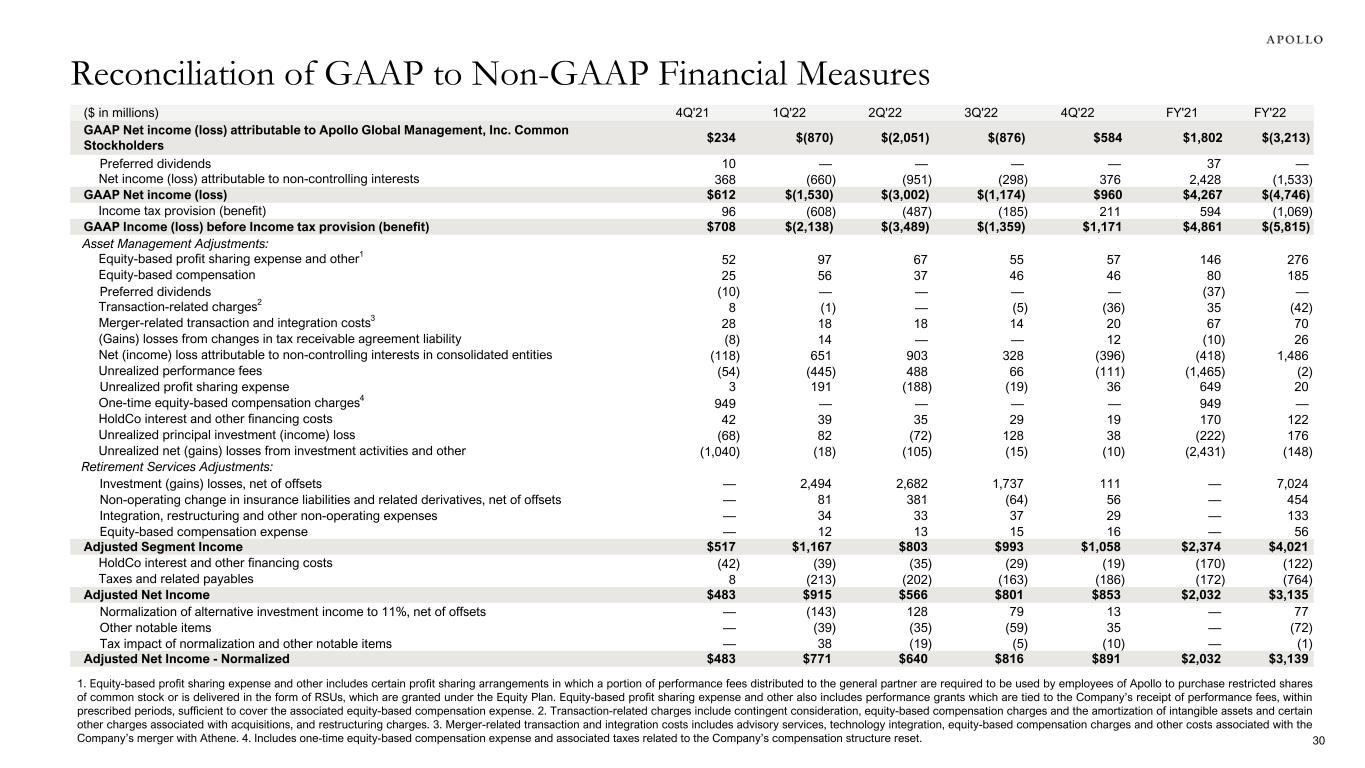 ($ in millions) 4Q'21 1Q'22 2Q'22 3Q'22 4Q'22 FY'21 FY'22 GAAP Net income (loss) attributable to Apollo Global Management, Inc. Common Stockholders $234 $(870) $(2,051) $(876) $584 $1,802 $(3,213) Preferred dividends 10 — — — — 37 — Net income (loss) attributable to non-controlling interests 368 (660) (951) (298) 376 2,428 (1,533) GAAP Net income (loss) $612 $(1,530) $(3,002) $(1,174) $960 $4,267 $(4,746) Income tax provision (benefit) 96 (608) (487) (185) 211 594 (1,069) GAAP Income (loss) before Income tax provision (benefit) $708 $(2,138) $(3,489) $(1,359) $1,171 $4,861 $(5,815) Asset Management Adjustments: Equity-based profit sharing expense and other1 52 97 67 55 57 146 276 Equity-based compensation 25 56 37 46 46 80 185 Preferred dividends (10) — — — — (37) — Transaction-related charges2 8 (1) — (5) (36) 35 (42) Merger-related transaction and integration costs3 28 18 18 14 20 67 70 (Gains) losses from changes in tax receivable agreement liability (8) 14 — — 12 (10) 26 Net (income) loss attributable to non-controlling interests in consolidated entities (118) 651 903 328 (396) (418) 1,486 Unrealized performance fees (54) (445) 488 66 (111) (1,465) (2) Unrealized profit sharing expense 3 191 (188) (19) 36 649 20 One-time equity-based compensation charges4 949 — — — — 949 — HoldCo interest and other financing costs 42 39 35 29 19 170 122 Unrealized principal investment (income) loss (68) 82 (72) 128 38 (222) 176 Unrealized net (gains) losses from investment activities and other (1,040) (18) (105) (15) (10) (2,431) (148) Retirement Services Adjustments: Investment (gains) losses, net of offsets — 2,494 2,682 1,737 111 — 7,024 Non-operating change in insurance liabilities and related derivatives, net of offsets — 81 381 (64) 56 — 454 Integration, restructuring and other non-operating expenses — 34 33 37 29 — 133 Equity-based compensation expense — 12 13 15 16 — 56 Adjusted Segment Income $517 $1,167 $803 $993 $1,058 $2,374 $4,021 HoldCo interest and other financing costs (42) (39) (35) (29) (19) (170) (122) Taxes and related payables 8 (213) (202) (163) (186) (172) (764) Adjusted Net Income $483 $915 $566 $801 $853 $2,032 $3,135 Normalization of alternative investment income to 11%, net of offsets — (143) 128 79 13 — 77 Other notable items — (39) (35) (59) 35 — (72) Tax impact of normalization and other notable items — 38 (19) (5) (10) — (1) Adjusted Net Income - Normalized $483 $771 $640 $816 $891 $2,032 $3,139 1. Equity-based profit sharing expense and other includes certain profit sharing arrangements in which a portion of performance fees distributed to the general partner are required to be used by employees of Apollo to purchase restricted shares of common stock or is delivered in the form of RSUs, which are granted under the Equity Plan. Equity-based profit sharing expense and other also includes performance grants which are tied to the Company’s receipt of performance fees, within prescribed periods, sufficient to cover the associated equity-based compensation expense. 2. Transaction-related charges include contingent consideration, equity-based compensation charges and the amortization of intangible assets and certain other charges associated with acquisitions, and restructuring charges. 3. Merger-related transaction and integration costs includes advisory services, technology integration, equity-based compensation charges and other costs associated with the Company’s merger with Athene. 4. Includes one-time equity-based compensation expense and associated taxes related to the Company’s compensation structure reset. Reconciliation of GAAP to Non-GAAP Financial Measures 30