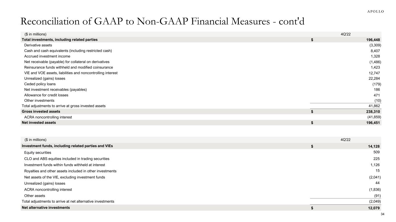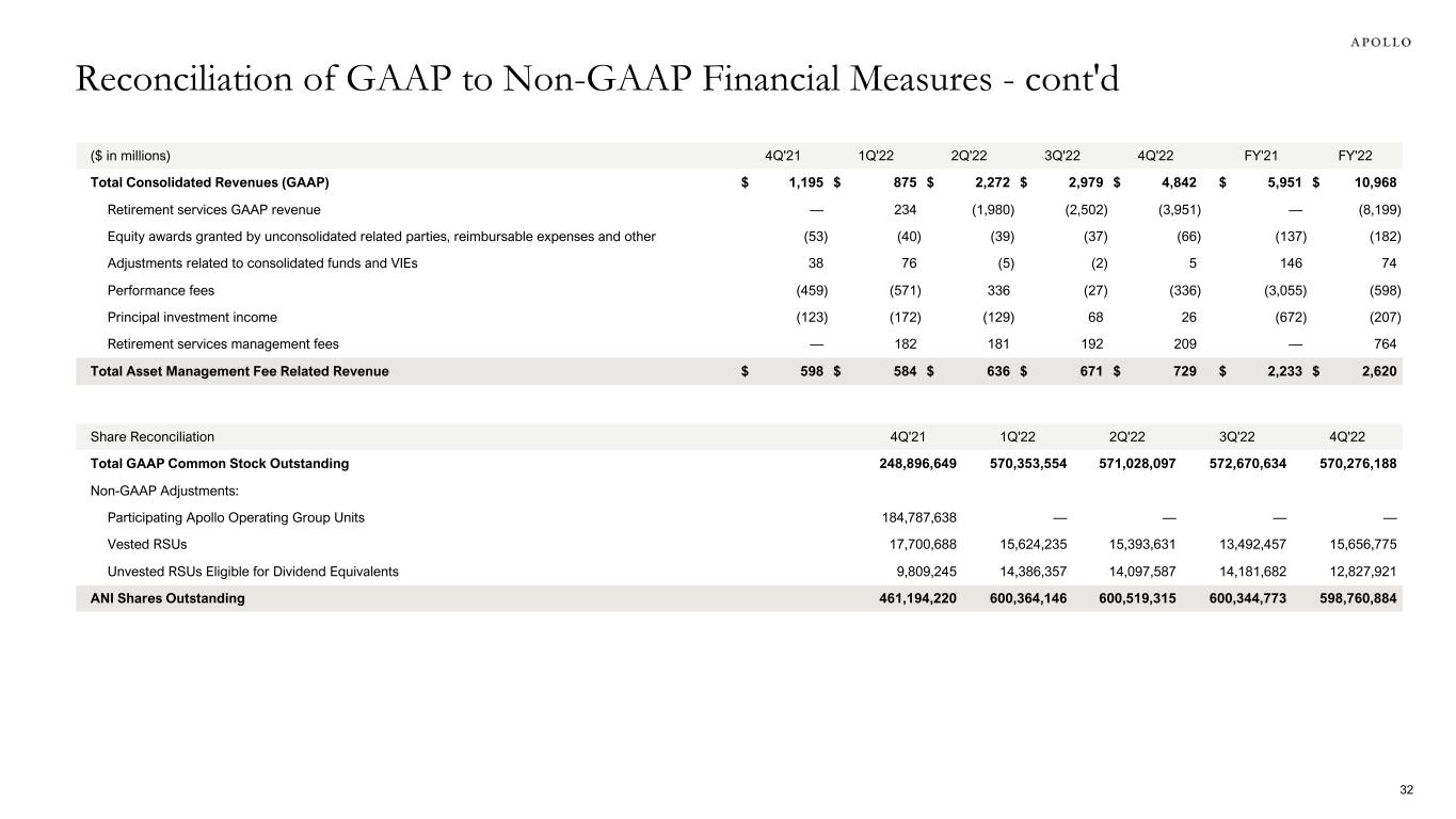 ($ in millions) 4Q'21 1Q'22 2Q'22 3Q'22 4Q'22 FY'21 FY'22 Total Consolidated Revenues (GAAP) $ 1,195 $ 875 $ 2,272 $ 2,979 $ 4,842 $ 5,951 $ 10,968 Retirement services GAAP revenue — 234 (1,980) (2,502) (3,951) — (8,199) Equity awards granted by unconsolidated related parties, reimbursable expenses and other (53) (40) (39) (37) (66) (137) (182) Adjustments related to consolidated funds and VIEs 38 76 (5) (2) 5 146 74 Performance fees (459) (571) 336 (27) (336) (3,055) (598) Principal investment income (123) (172) (129) 68 26 (672) (207) Retirement services management fees — 182 181 192 209 — 764 Total Asset Management Fee Related Revenue $ 598 $ 584 $ 636 $ 671 $ 729 $ 2,233 $ 2,620 Share Reconciliation 4Q'21 1Q'22 2Q'22 3Q'22 4Q'22 Total GAAP Common Stock Outstanding 248,896,649 570,353,554 571,028,097 572,670,634 570,276,188 Non-GAAP Adjustments: Participating Apollo Operating Group Units 184,787,638 — — — — Vested RSUs 17,700,688 15,624,235 15,393,631 13,492,457 15,656,775 Unvested RSUs Eligible for Dividend Equivalents 9,809,245 14,386,357 14,097,587 14,181,682 12,827,921 ANI Shares Outstanding 461,194,220 600,364,146 600,519,315 600,344,773 598,760,884 Reconciliation of GAAP to Non-GAAP Financial Measures - cont'd 32