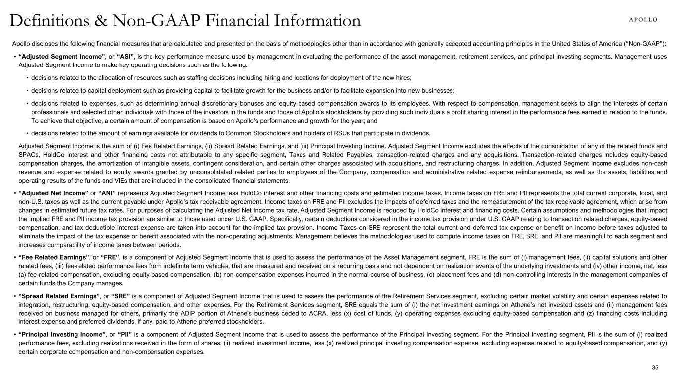 Apollo discloses the following financial measures that are calculated and presented on the basis of methodologies other than in accordance with generally accepted accounting principles in the United States of America (“Non-GAAP”): • “Adjusted Segment Income”, or “ASI”, is the key performance measure used by management in evaluating the performance of the asset management, retirement services, and principal investing segments. Management uses Adjusted Segment Income to make key operating decisions such as the following: ▪ decisions related to the allocation of resources such as staffing decisions including hiring and locations for deployment of the new hires; ▪ decisions related to capital deployment such as providing capital to facilitate growth for the business and/or to facilitate expansion into new businesses; ▪ decisions related to expenses, such as determining annual discretionary bonuses and equity-based compensation awards to its employees. With respect to compensation, management seeks to align the interests of certain professionals and selected other individuals with those of the investors in the funds and those of Apollo’s stockholders by providing such individuals a profit sharing interest in the performance fees earned in relation to the funds. To achieve that objective, a certain amount of compensation is based on Apollo’s performance and growth for the year; and ▪ decisions related to the amount of earnings available for dividends to Common Stockholders and holders of RSUs that participate in dividends. Adjusted Segment Income is the sum of (i) Fee Related Earnings, (ii) Spread Related Earnings, and (iii) Principal Investing Income. Adjusted Segment Income excludes the effects of the consolidation of any of the related funds and SPACs, HoldCo interest and other financing costs not attributable to any specific segment, Taxes and Related Payables, transaction-related charges and any acquisitions. Transaction-related charges includes equity-based compensation charges, the amortization of intangible assets, contingent consideration, and certain other charges associated with acquisitions, and restructuring charges. In addition, Adjusted Segment Income excludes non-cash revenue and expense related to equity awards granted by unconsolidated related parties to employees of the Company, compensation and administrative related expense reimbursements, as well as the assets, liabilities and operating results of the funds and VIEs that are included in the consolidated financial statements. • “Adjusted Net Income” or “ANI” represents Adjusted Segment Income less HoldCo interest and other financing costs and estimated income taxes. Income taxes on FRE and PII represents the total current corporate, local, and non-U.S. taxes as well as the current payable under Apollo’s tax receivable agreement. Income taxes on FRE and PII excludes the impacts of deferred taxes and the remeasurement of the tax receivable agreement, which arise from changes in estimated future tax rates. For purposes of calculating the Adjusted Net Income tax rate, Adjusted Segment Income is reduced by HoldCo interest and financing costs. Certain assumptions and methodologies that impact the implied FRE and PII income tax provision are similar to those used under U.S. GAAP. Specifically, certain deductions considered in the income tax provision under U.S. GAAP relating to transaction related charges, equity-based compensation, and tax deductible interest expense are taken into account for the implied tax provision. Income Taxes on SRE represent the total current and deferred tax expense or benefit on income before taxes adjusted to eliminate the impact of the tax expense or benefit associated with the non-operating adjustments. Management believes the methodologies used to compute income taxes on FRE, SRE, and PII are meaningful to each segment and increases comparability of income taxes between periods. • “Fee Related Earnings”, or “FRE”, is a component of Adjusted Segment Income that is used to assess the performance of the Asset Management segment. FRE is the sum of (i) management fees, (ii) capital solutions and other related fees, (iii) fee-related performance fees from indefinite term vehicles, that are measured and received on a recurring basis and not dependent on realization events of the underlying investments and (iv) other income, net, less (a) fee-related compensation, excluding equity-based compensation, (b) non-compensation expenses incurred in the normal course of business, (c) placement fees and (d) non-controlling interests in the management companies of certain funds the Company manages. • “Spread Related Earnings”, or “SRE” is a component of Adjusted Segment Income that is used to assess the performance of the Retirement Services segment, excluding certain market volatility and certain expenses related to integration, restructuring, equity-based compensation, and other expenses. For the Retirement Services segment, SRE equals the sum of (i) the net investment earnings on Athene’s net invested assets and (ii) management fees received on business managed for others, primarily the ADIP portion of Athene's business ceded to ACRA, less (x) cost of funds, (y) operating expenses excluding equity-based compensation and (z) financing costs including interest expense and preferred dividends, if any, paid to Athene preferred stockholders. • “Principal Investing Income”, or “PII” is a component of Adjusted Segment Income that is used to assess the performance of the Principal Investing segment. For the Principal Investing segment, PII is the sum of (i) realized performance fees, excluding realizations received in the form of shares, (ii) realized investment income, less (x) realized principal investing compensation expense, excluding expense related to equity-based compensation, and (y) certain corporate compensation and non-compensation expenses.