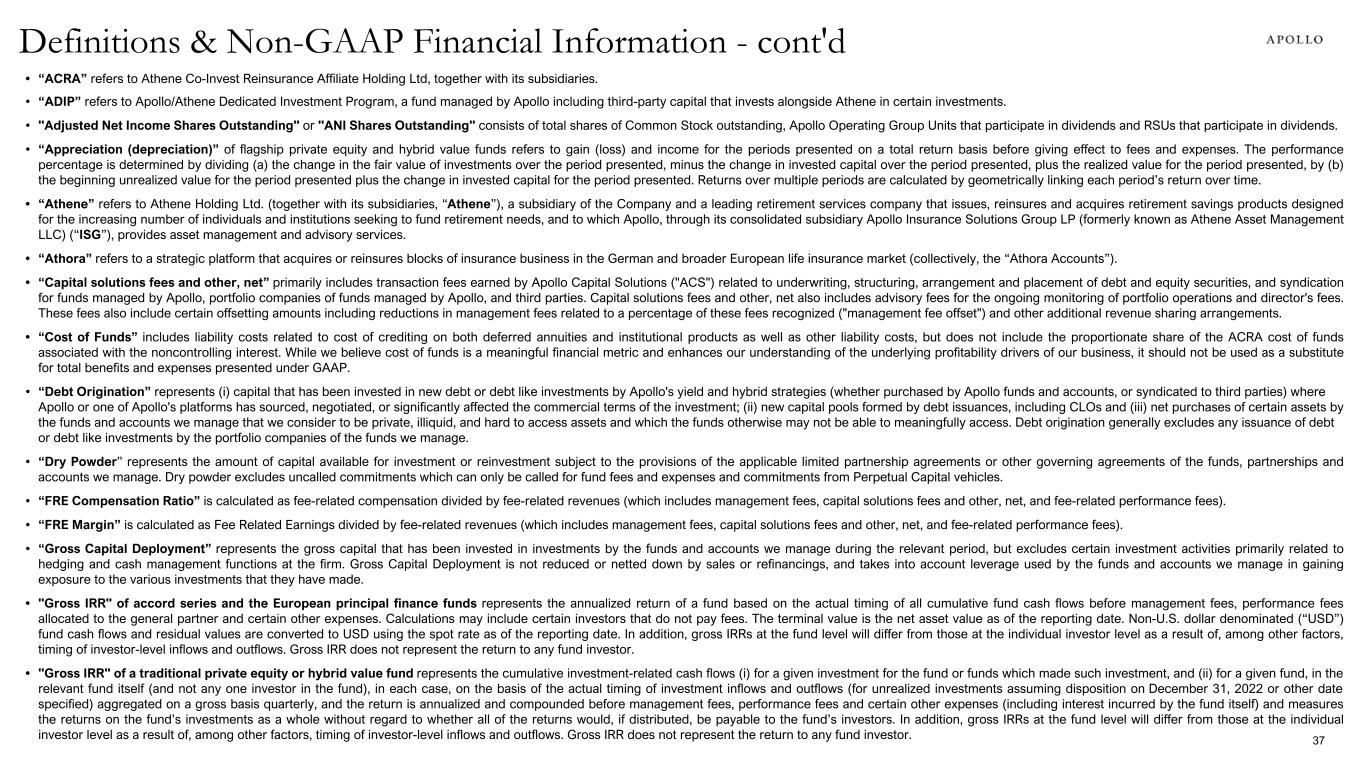 • “ACRA” refers to Athene Co-Invest Reinsurance Affiliate Holding Ltd, together with its subsidiaries. • “ADIP” refers to Apollo/Athene Dedicated Investment Program, a fund managed by Apollo including third-party capital that invests alongside Athene in certain investments. • "Adjusted Net Income Shares Outstanding" or "ANI Shares Outstanding" consists of total shares of Common Stock outstanding, Apollo Operating Group Units that participate in dividends and RSUs that participate in dividends. • “Appreciation (depreciation)” of flagship private equity and hybrid value funds refers to gain (loss) and income for the periods presented on a total return basis before giving effect to fees and expenses. The performance percentage is determined by dividing (a) the change in the fair value of investments over the period presented, minus the change in invested capital over the period presented, plus the realized value for the period presented, by (b) the beginning unrealized value for the period presented plus the change in invested capital for the period presented. Returns over multiple periods are calculated by geometrically linking each period’s return over time. • “Athene” refers to Athene Holding Ltd. (together with its subsidiaries, “Athene”), a subsidiary of the Company and a leading retirement services company that issues, reinsures and acquires retirement savings products designed for the increasing number of individuals and institutions seeking to fund retirement needs, and to which Apollo, through its consolidated subsidiary Apollo Insurance Solutions Group LP (formerly known as Athene Asset Management LLC) (“ISG”), provides asset management and advisory services. • “Athora” refers to a strategic platform that acquires or reinsures blocks of insurance business in the German and broader European life insurance market (collectively, the “Athora Accounts”). • “Capital solutions fees and other, net” primarily includes transaction fees earned by Apollo Capital Solutions ("ACS") related to underwriting, structuring, arrangement and placement of debt and equity securities, and syndication for funds managed by Apollo, portfolio companies of funds managed by Apollo, and third parties. Capital solutions fees and other, net also includes advisory fees for the ongoing monitoring of portfolio operations and director's fees. These fees also include certain offsetting amounts including reductions in management fees related to a percentage of these fees recognized ("management fee offset") and other additional revenue sharing arrangements. • “Cost of Funds” includes liability costs related to cost of crediting on both deferred annuities and institutional products as well as other liability costs, but does not include the proportionate share of the ACRA cost of funds associated with the noncontrolling interest. While we believe cost of funds is a meaningful financial metric and enhances our understanding of the underlying profitability drivers of our business, it should not be used as a substitute for total benefits and expenses presented under GAAP. • “Debt Origination” represents (i) capital that has been invested in new debt or debt like investments by Apollo's yield and hybrid strategies (whether purchased by Apollo funds and accounts, or syndicated to third parties) where Apollo or one of Apollo's platforms has sourced, negotiated, or significantly affected the commercial terms of the investment; (ii) new capital pools formed by debt issuances, including CLOs and (iii) net purchases of certain assets by the funds and accounts we manage that we consider to be private, illiquid, and hard to access assets and which the funds otherwise may not be able to meaningfully access. Debt origination generally excludes any issuance of debt or debt like investments by the portfolio companies of the funds we manage. • “Dry Powder” represents the amount of capital available for investment or reinvestment subject to the provisions of the applicable limited partnership agreements or other governing agreements of the funds, partnerships and accounts we manage. Dry powder excludes uncalled commitments which can only be called for fund fees and expenses and commitments from Perpetual Capital vehicles. • “FRE Compensation Ratio” is calculated as fee-related compensation divided by fee-related revenues (which includes management fees, capital solutions fees and other, net, and fee-related performance fees). • “FRE Margin” is calculated as Fee Related Earnings divided by fee-related revenues (which includes management fees, capital solutions fees and other, net, and fee-related performance fees). • “Gross Capital Deployment” represents the gross capital that has been invested in investments by the funds and accounts we manage during the relevant period, but excludes certain investment activities primarily related to hedging and cash management functions at the firm. Gross Capital Deployment is not reduced or netted down by sales or refinancings, and takes into account leverage used by the funds and accounts we manage in gaining exposure to the various investments that they have made. • "Gross IRR" of accord series and the European principal finance funds represents the annualized return of a fund based on the actual timing of all cumulative fund cash flows before management fees, performance fees allocated to the general partner and certain other expenses. Calculations may include certain investors that do not pay fees. The terminal value is the net asset value as of the reporting date. Non-U.S. dollar denominated (“USD”) fund cash flows and residual values are converted to USD using the spot rate as of the reporting date. In addition, gross IRRs at the fund level will differ from those at the individual investor level as a result of, among other factors, timing of investor-level inflows and outflows. Gross IRR does not represen
