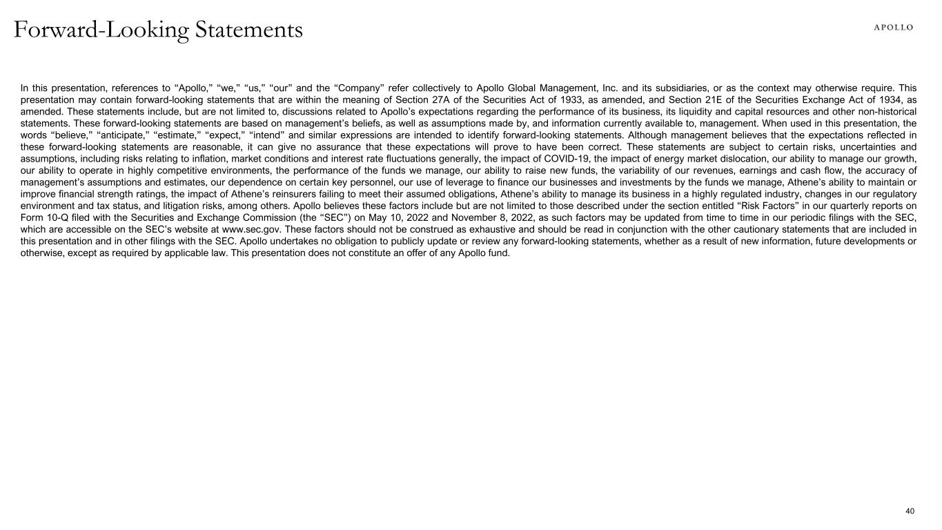 Forward-Looking Statements In this presentation, references to “Apollo,” “we,” “us,” “our” and the “Company” refer collectively to Apollo Global Management, Inc. and its subsidiaries, or as the context may otherwise require. This presentation may contain forward-looking statements that are within the meaning of Section 27A of the Securities Act of 1933, as amended, and Section 21E of the Securities Exchange Act of 1934, as amended. These statements include, but are not limited to, discussions related to Apollo’s expectations regarding the performance of its business, its liquidity and capital resources and other non-historical statements. These forward-looking statements are based on management’s beliefs, as well as assumptions made by, and information currently available to, management. When used in this presentation, the words “believe,” “anticipate,” “estimate,” “expect,” “intend” and similar expressions are intended to identify forward-looking statements. Although management believes that the expectations reflected in these forward-looking statements are reasonable, it can give no assurance that these expectations will prove to have been correct. These statements are subject to certain risks, uncertainties and assumptions, including risks relating to inflation, market conditions and interest rate fluctuations generally, the impact of COVID-19, the impact of energy market dislocation, our ability to manage our growth, our ability to operate in highly competitive environments, the performance of the funds we manage, our ability to raise new funds, the variability of our revenues, earnings and cash flow, the accuracy of management’s assumptions and estimates, our dependence on certain key personnel, our use of leverage to finance our businesses and investments by the funds we manage, Athene’s ability to maintain or improve financial strength ratings, the impact of Athene’s reinsurers failing to meet their assumed obligations, Athene’s ability to manage its business in a highly regulated industry, changes in our regulatory environment and tax status, and litigation risks, among others. Apollo believes these factors include but are not limited to those described under the section entitled “Risk Factors” in our quarterly reports on Form 10-Q filed with the Securities and Exchange Commission (the “SEC”) on May 10, 2022 and November 8, 2022, as such factors may be updated from time to time in our periodic filings with the SEC, which are accessible on the SEC’s website at www.sec.gov. These factors should not be construed as exhaustive and should be read in conjunction with the other cautionary statements that are included in this presentation and in other filings with the SEC. Apollo undertakes no obligation to publicly update or review any forward-looking statements, whether as a result of new information, future developments or otherwise, except as required by applicable law. This presentation does not constitute an offer of any Apollo fund. 40