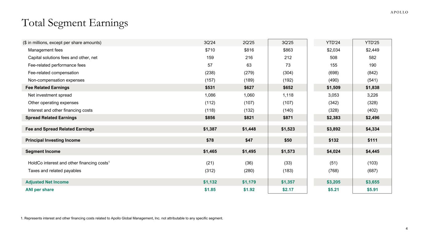 ($ in millions, except per share amounts) 3Q'24 2Q'25 3Q'25 YTD'24 YTD'25 Management fees $710 $816 $863 $2,034 $2,449 Capital solutions fees and other, net 159 216 212 508 582 Fee-related performance fees 57 63 73 155 190 Fee-related compensation (238) (279) (304) (698) (842) Non-compensation expenses (157) (189) (192) (490) (541) Fee Related Earnings $531 $627 $652 $1,509 $1,838 Net investment spread 1,086 1,060 1,118 3,053 3,226 Other operating expenses (112) (107) (107) (342) (328) Interest and other financing costs (118) (132) (140) (328) (402) Spread Related Earnings $856 $821 $871 $2,383 $2,496 Fee and Spread Related Earnings $1,387 $1,448 $1,523 $3,892 $4,334 Principal Investing Income $78 $47 $50 $132 $111 Segment Income $1,465 $1,495 $1,573 $4,024 $4,445 HoldCo interest and other financing costs1 (21) (36) (33) (51) (103) Taxes and related payables (312) (280) (183) (768) (687) Adjusted Net Income $1,132 $1,179 $1,357 $3,205 $3,655 ANI per share $1.85 $1.92 $2.17 $5.21 $5.91 1. Represents interest and other financing costs related to Apollo Global Management, Inc. not attributable to any specific segment. Total Segment Earnings 4