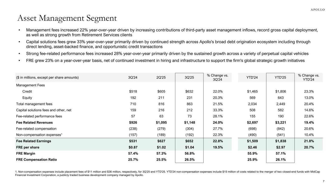 (In millions, except per share amounts) 3Q'24 2Q'25 3Q'25 YTD'24 YTD'25 Revenues Asset Management Management fees $476 $583 $606 $1,376 $1,697 Advisory and transaction fees, net 181 277 378 617 850 Investment income (loss) 230 189 444 910 936 Incentive fees 35 58 51 108 149 Property management, development and other fees — — 8 — 8 Retirement Services Premiums 389 107 117 1,163 351 Product charges 267 274 292 756 831 Net investment income 4,101 4,776 5,013 11,481 14,130 Investment related gains (losses) 1,539 (5) 2,254 3,082 1,421 Revenues of consolidated variable interest entities 552 550 654 1,329 1,796 Other revenues 3 5 6 9 16 Total Revenues 7,773 6,814 9,823 20,831 22,185 Expenses Asset Management Compensation and benefits (605) (602) (761) (1,876) (2,108) Interest expense (55) (60) (64) (159) (184) General, administrative and other (326) (370) (409) (885) (1,087) Retirement Services Interest sensitive contract benefits (2,599) (3,428) (4,164) (7,307) (9,086) Future policy and other policy benefits (793) (527) (613) (2,431) (1,681) Market risk benefits remeasurement gains (losses) (524) 111 (131) (354) (405) Amortization of deferred acquisition costs, deferred sales inducements and value of business acquired (244) (292) (355) (678) (914) Policy and other operating expenses (670) (550) (573) (1,601) (1,665) Total Expenses (5,816) (5,718) (7,070) (15,291) (17,130) Other Income (Loss) – Asset Management Net gains (losses) from investment activities 15 (268) 78 33 (208) Net gains (losses) from investment activities of consolidated variable interest entities 44 4 35 70 250 Other income (loss), net 70 13 33 68 (172) Total Other Income (Loss) 129 (251) 146 171 (130) Income (loss) before income tax (provision) benefit 2,086 845 2,899 5,711 4,925 Income tax (provision) benefit (317) (3) (438) (1,000) (684) Net income (loss) 1,769 842 2,461 4,711 4,241 Net (income) loss attributable to non-controlling interests (958) (212) (725) (1,620) (1,433) Net income (loss) attributable to Apollo Global Management, Inc. 811 630 1,736 3,091 2,808 Preferred stock dividends (24) (25) (24) (73) (73) Net income (loss) attributable to Apollo Global Management, Inc. Common Stockholders $787 $605 $1,712 $3,018 $2,735 Earnings (Loss) per share Net income (loss) attributable to Common Stockholders - Basic $1.30 $1.00 $2.82 $4.96 $4.51 Net income (loss) attributable to Common Stockholders - Diluted $1.29 $0.99 $2.78 $4.94 $4.47 Weighted average shares outstanding - Basic 585 587 589 587 588 Weighted average shares outstanding - Diluted 589 590 608 590 592 GAAP Income Statement (Unaudited) 2