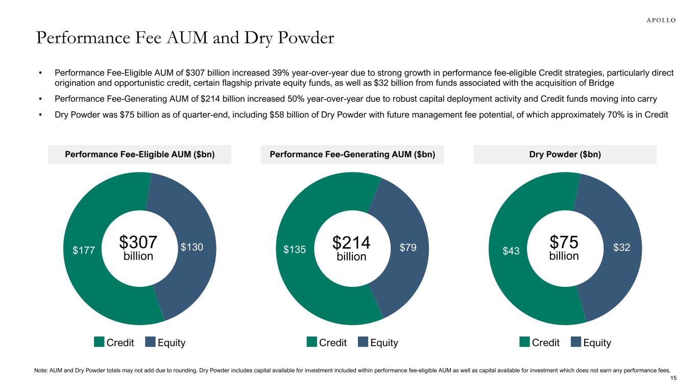• “Performance Fee-Eligible AUM” or “PFEAUM” refers to the AUM that may eventually produce performance fees. All funds for which we are entitled to receive a performance fee allocation or incentive fee are included in Performance Fee-Eligible AUM, which consists of the following: • “Performance Fee-Generating AUM”, which refers to invested capital of the funds, partnerships and accounts we manage, advise, or to which we provide certain other investment-related services, that is currently above its hurdle rate or preferred return, and profit of such funds, partnerships and accounts is being allocated to, or earned by, the general partner in accordance with the applicable limited partnership agreements or other governing agreements; • “AUM Not Currently Generating Performance Fees”, which refers to invested capital of the funds, partnerships and accounts we manage, advise, or to which we provide certain other investment-related services that is currently below its hurdle rate or preferred return; and • “Uninvested Performance Fee-Eligible AUM”, which refers to capital of the funds, partnerships and accounts we manage, advise, or to which we provide certain other investment-related services that is available for investment or reinvestment subject to the provisions of applicable limited partnership agreements or other governing agreements, which capital is not currently part of the NAV or fair value of investments that may eventually produce performance fees allocable to, or earned by, the general partner. • “ACRA” refers to Athene Co-Invest Reinsurance Affiliate Holding Ltd, together with its subsidiaries (“ACRA 1”), and Athene Co-Invest Reinsurance Affiliate Holding 2 Ltd, together with its subsidiaries (“ACRA 2”). • “ADIP” refers to Apollo/Athene Dedicated Investment Program (“ADIP I”) and Apollo/Athene Dedicated Investment Program II (“ADIP II”), funds managed by Apollo including third-party capital that, through ACRA, invest alongside Athene in certain investments. • “Adjusted Net Income Shares Outstanding” or “ANI Shares Outstanding” consists of total shares of Common Stock outstanding, RSUs that participate in dividends, and shares of Common Stock assumed to be issuable upon the conversion of the shares of Mandatory Convertible Preferred Stock. • “Appreciation (depreciation)” of flagship private equity and hybrid value funds refers to gain (loss) and income for the periods presented on a total return basis before giving effect to fees and expenses. The performance percentage is determined by dividing (a) the change in the fair value of investments over the period presented, minus the change in invested capital over the period presented, plus the realized value for the period presented, by (b) the beginning unrealized value for the period presented plus the change in invested capital for the period presented. Returns over multiple periods are calculated by geometrically linking each period’s return over time. • “Athene” refers to Athene Holding Ltd. (together with its subsidiaries, “Athene”), a subsidiary of the Company and a leading retirement services company that issues, reinsures and acquires retirement savings products designed for the increasing number of individuals and institutions seeking to fund retirement needs, and to which Apollo, through its consolidated subsidiary Apollo Insurance Solutions Group LP (“ISG”), provides asset management and advisory services. • “Athora” refers to a strategic platform that acquires or reinsures blocks of insurance business in the German and broader European life insurance market (collectively, the “Athora Accounts”). • “Capital solutions fees and other, net” primarily includes transaction fees earned by Apollo Capital Solutions (“ACS”) related to underwriting, structuring, arrangement and placement of debt and equity securities, and syndication for funds managed by Apollo, portfolio companies of funds managed by Apollo, and third parties. Capital solutions fees and other, net also includes advisory fees for the ongoing monitoring of portfolio operations, directors' fees, as well as fees and earnings related to property management activities. These fees also include certain offsetting amounts, including reductions in management fees related to a percentage of these fees recognized (“management fee offset”), and other additional revenue sharing arrangements, including with certain subsidiaries and other affiliates. • “Cost of Funds” includes liability costs related to cost of crediting on both deferred annuities and institutional products as well as other liability costs, but does not include the proportionate share of the ACRA cost of funds associated with the non-controlling interests. While we believe cost of funds is a meaningful financial metric and enhances the understanding of the underlying profitability drivers of our retirement services business, it should not be used as a substitute for total benefits and expenses presented under U.S. GAAP. • “Dry Powder” represents the amount of capital available for investment or reinvestment subject to the provisions of the applicable limited partnership agreements or other governing agreements of the funds, partnerships and accounts we manage. Dry powder excludes uncalled commitments which can only be called for fund fees and expenses and commitments from perpetual capital vehicles. • “Fees and earnings related to property management activities” includes property management and other fees of $10 million net of certain compensation expense of $4 million and non-compensation expense of $2 million for 3Q'25 and YTD'25. • “FRE Compensation Ratio” is calculated as fee-related compensation divided by fee-related revenues (which includes management fees, capital solutions fees and other, net, and fee-related performance fees). • “FRE Margin” is calculated as Fee 