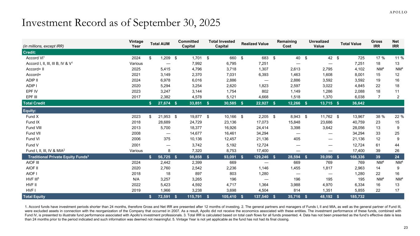 (in millions, except IRR) Vintage Year Total AUM Committed Capital Total Invested Capital Realized Value Remaining Cost Unrealized Value Total Value Gross IRR Net IRR Credit: Accord VI1 2024 $ 1,209 $ 1,701 $ 660 $ 683 $ 40 $ 42 $ 725 17 % 11 % Accord I, II, III, III B, IV & V1 Various — 7,992 6,795 7,251 — — 7,251 18 13 Accord+ II 2025 5,415 4,796 3,718 1,307 2,613 2,795 4,102 NM4 NM4 Accord+ 2021 3,149 2,370 7,031 6,393 1,463 1,608 8,001 15 12 ADIP II 2024 6,978 6,016 2,886 — 2,886 3,592 3,592 19 16 ADIP I 2020 5,294 3,254 2,620 1,823 2,597 3,022 4,845 22 18 EPF IV 2023 3,247 3,144 1,754 802 1,149 1,286 2,088 18 11 EPF III 2017 2,382 4,578 5,121 4,668 1,518 1,370 6,038 7 2 Total Credit $ 27,674 $ 33,851 $ 30,585 $ 22,927 $ 12,266 $ 13,715 $ 36,642 Equity: Fund X 2023 $ 21,953 $ 19,877 $ 10,166 $ 2,205 $ 8,943 $ 11,762 $ 13,967 38 % 22 % Fund IX 2018 28,689 24,729 23,136 17,073 15,848 23,686 40,759 23 15 Fund VIII 2013 5,700 18,377 16,926 24,414 3,398 3,642 28,056 13 9 Fund VII 2008 — 14,677 16,461 34,294 — — 34,294 33 25 Fund VI 2006 375 10,136 12,457 21,136 405 — 21,136 12 9 Fund V 2001 — 3,742 5,192 12,724 — — 12,724 61 44 Fund I, II, III, IV & MIA2 Various 8 7,320 8,753 17,400 — — 17,400 39 26 Traditional Private Equity Funds3 $ 56,725 $ 98,858 $ 93,091 $ 129,246 $ 28,594 $ 39,090 $ 168,336 39 24 AIOF III 2024 2,442 2,399 669 — 669 769 769 NM4 NM4 AIOF II 2020 2,760 2,542 2,236 1,146 1,455 1,817 2,963 14 9 AIOF I 2018 18 897 803 1,280 — — 1,280 22 16 HVF III5 N/A 3,257 3,265 196 — 196 195 195 NM4 NM4 HVF II 2022 5,423 4,592 4,717 1,364 3,988 4,970 6,334 16 13 HVF I 2019 1,966 3,238 3,698 4,504 814 1,351 5,855 22 17 Total Equity $ 72,591 $ 115,791 $ 105,410 $ 137,540 $ 35,716 $ 48,192 $ 185,732 Investment Record as of September 30, 2025 23 1. Accord funds have investment periods shorter than 24 months, therefore Gross and Net IRR are presented after 12 months of investing. 2. The general partners and managers of Funds I, II and MIA, as well as the general partner of Fund III, were excluded assets in connection with the reorganization of the Company that occurred in 2007. As a result, Apollo did not receive the economics associated with these entities. The investment performance of these funds, combined with Fund IV, is presented to illustrate fund performance associated with Apollo’s investment professionals. 3. Total IRR is calculated based on total cash flows for all funds presented. 4. Data has not been presented as the fund’s effective date is less than 24 months prior to the period indicated and such information was deemed not meaningful. 5. Vintage Year is not yet applicable as the fund has not had its final closing.