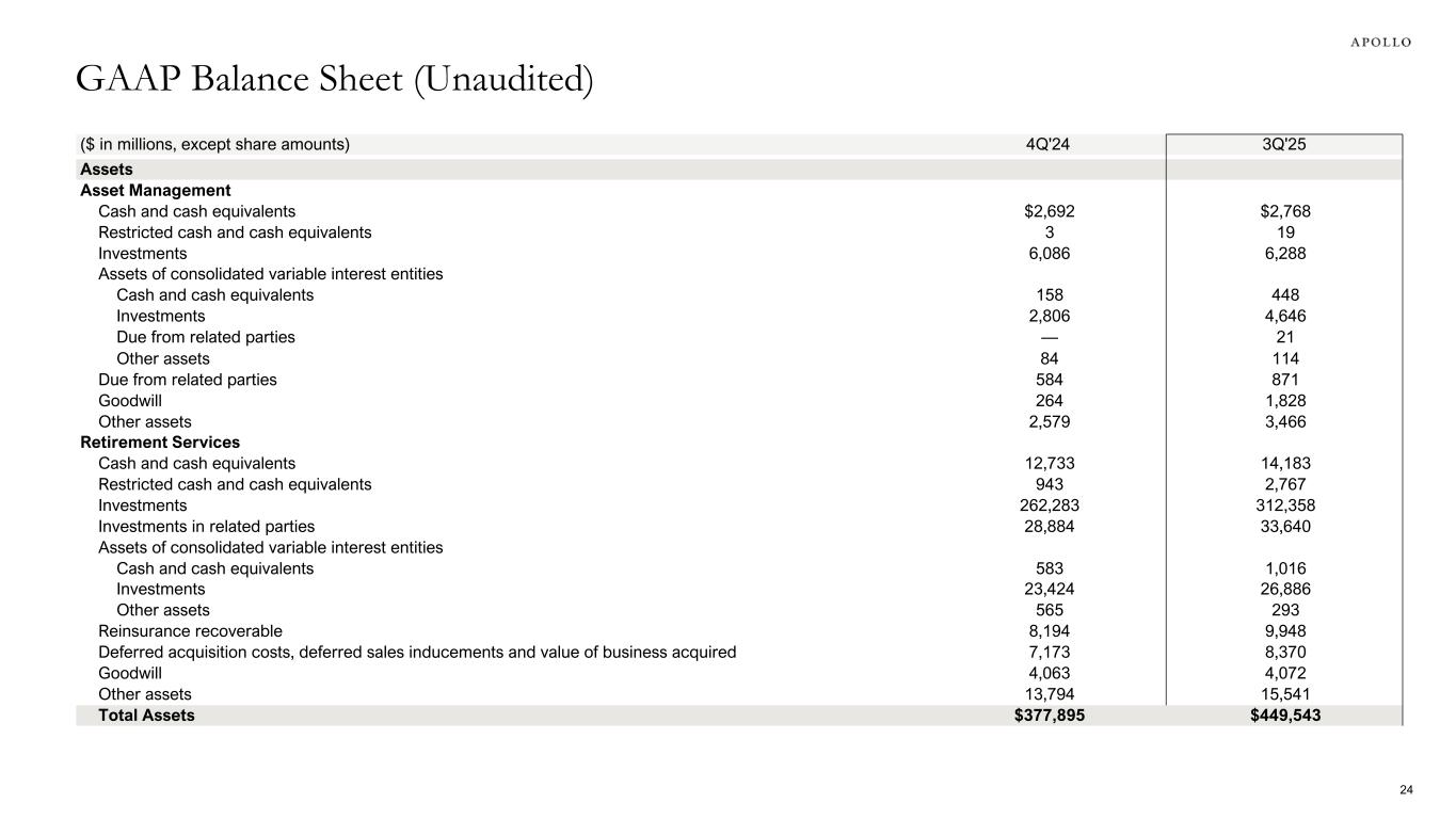 ($ in millions, except share amounts) 4Q'24 3Q'25 Assets Asset Management Cash and cash equivalents $2,692 $2,768 Restricted cash and cash equivalents 3 19 Investments 6,086 6,288 Assets of consolidated variable interest entities Cash and cash equivalents 158 448 Investments 2,806 4,646 Due from related parties — 21 Other assets 84 114 Due from related parties 584 871 Goodwill 264 1,828 Other assets 2,579 3,466 Retirement Services Cash and cash equivalents 12,733 14,183 Restricted cash and cash equivalents 943 2,767 Investments 262,283 312,358 Investments in related parties 28,884 33,640 Assets of consolidated variable interest entities Cash and cash equivalents 583 1,016 Investments 23,424 26,886 Other assets 565 293 Reinsurance recoverable 8,194 9,948 Deferred acquisition costs, deferred sales inducements and value of business acquired 7,173 8,370 Goodwill 4,063 4,072 Other assets 13,794 15,541 Total Assets $377,895 $449,543 GAAP Balance Sheet (Unaudited) 24