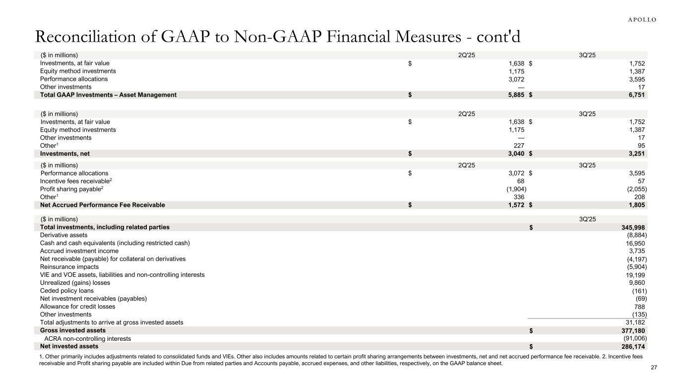 ($ in millions) 3Q'24 4Q'24 1Q'25 2Q'25 3Q'25 YTD'24 YTD'25 GAAP Net income (loss) attributable to Apollo Global Management, Inc. Common Stockholders $787 $1,462 $418 $605 $1,712 $3,018 $2,735 Preferred dividends 24 24 24 25 24 73 73 Net income (loss) attributable to non-controlling interests 958 176 496 212 725 1,620 1,433 GAAP Net income (loss) $1,769 $1,662 $938 $842 $2,461 $4,711 $4,241 Income tax provision (benefit) 317 62 243 3 438 1,000 684 GAAP Income (loss) before Income tax provision (benefit) $2,086 $1,724 $1,181 $845 $2,899 $5,711 $4,925 Asset Management Adjustments: Equity-based profit sharing expense1 41 141 30 38 35 180 103 Equity-based compensation 72 78 99 102 112 230 313 Net (income) loss attributable to non-controlling interests in consolidated entities (975) (165) (549) (266) (783) (1,675) (1,598) Unrealized performance fees 141 (51) (119) 28 (207) (213) (298) Unrealized profit sharing expense (65) 16 105 (43) 36 129 98 HoldCo interest and other financing costs 21 29 34 36 33 51 103 Unrealized principal investment (income) loss (4) 23 2 (11) 4 (14) (5) Unrealized net (gains) losses from investment activities2 (13) (37) 61 293 (54) (9) 300 Transaction-related costs, restructuring and other non-operating expenses3 60 6 276 70 86 178 432 Retirement Services Adjustments: Investment (gains) losses, net of offsets (628) 265 (151) 509 (463) (482) (105) Non-operating change in insurance liabilities and related derivatives4 513 (483) 367 (149) (174) (363) 44 Integration, restructuring and other non-operating expenses 204 (26) 30 32 36 265 98 Equity-based compensation 12 14 11 11 13 36 35 Segment Income $1,465 $1,534 $1,377 $1,495 $1,573 $4,024 $4,445 HoldCo interest and other financing costs (21) (29) (34) (36) (33) (51) (103) Taxes and related payables (312) (145) (224) (280) (183) (768) (687) Adjusted Net Income $1,132 $1,360 $1,119 $1,179 $1,357 $3,205 $3,655 Notable items (25) — 22 — (25) (25) 10 Tax impact of notable items 5 — (5) — 5 5 (2) Adjusted Net Income, Excluding Notable Items $1,112 $1,360 $1,136 $1,179 $1,337 $3,185 $3,663 1. Equity-based profit sharing expense includes stock-based grants that are tied to realized performance within the Principal Investing segment. 2. In 2Q'25, unrealized net (gains) losses from investment activities includes a $257 million impairment related to an equity investment. 3. Transaction-related costs, restructuring and other non-operating expenses includes: a) contingent consideration, certain equity-based charges, amortization of intangible assets and certain other expenses associated with acquisitions; b) gains (losses) from changes in the tax receivable agreement liability; c) merger-related transaction and integration costs associated with Company’s merger with Athene and d) other non-operating expenses, including the issuance of shares of AGM common stock for charitable contributions. In 1Q’25, other non-operating expenses includes $200 million in charitable contributions related to the issuance of shares to a donor-advised fund. 4. Includes change in fair values of derivatives and embedded derivatives, non-operating change in funding agreements, change in fair value of market risk benefits, and non-operating change in liability for future policy benefits. Reconciliation of GAAP to Non-GAAP Financial Measures 26