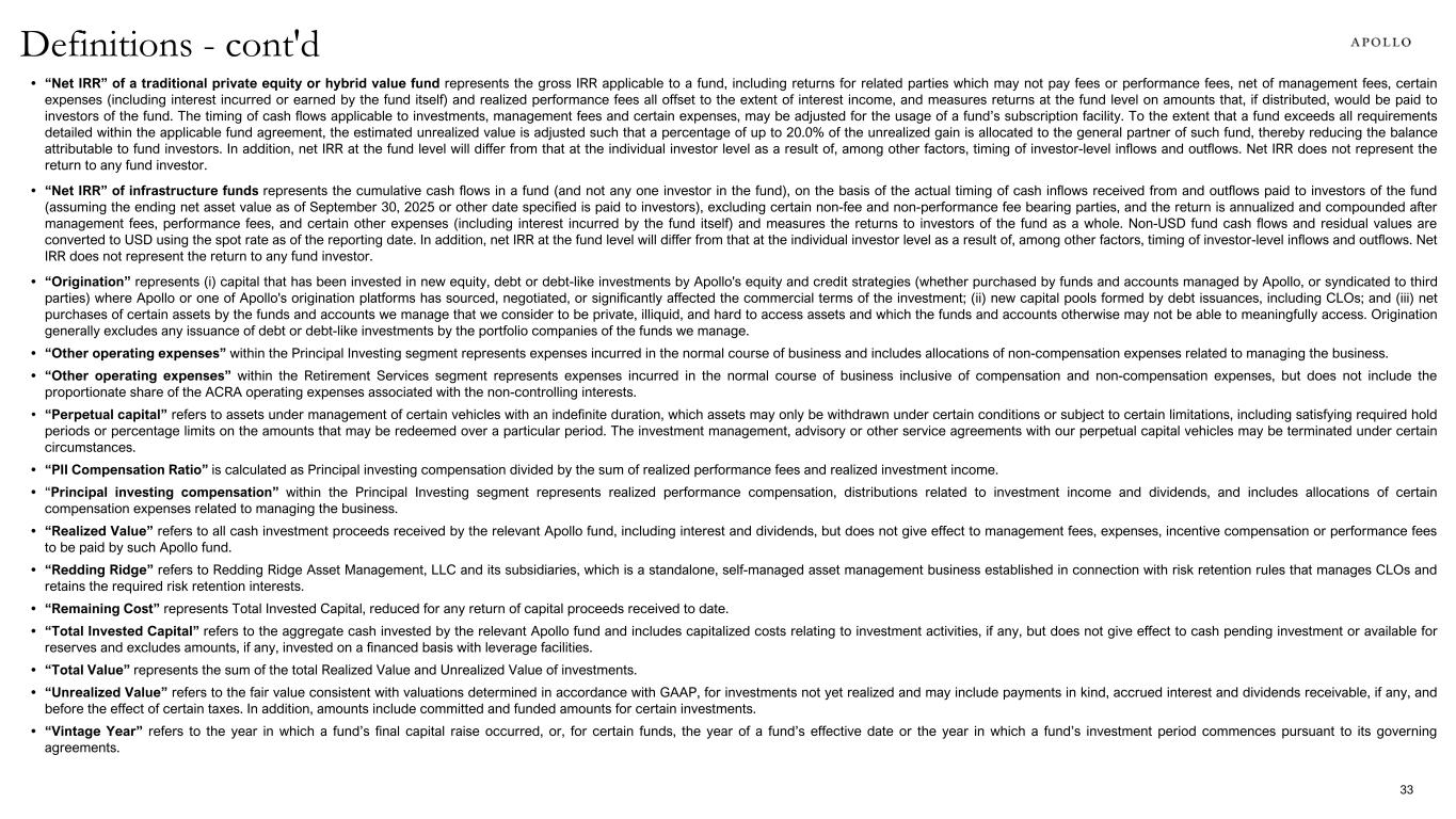 • “Net IRR” of a traditional private equity or hybrid value fund represents the gross IRR applicable to a fund, including returns for related parties which may not pay fees or performance fees, net of management fees, certain expenses (including interest incurred or earned by the fund itself) and realized performance fees all offset to the extent of interest income, and measures returns at the fund level on amounts that, if distributed, would be paid to investors of the fund. The timing of cash flows applicable to investments, management fees and certain expenses, may be adjusted for the usage of a fund’s subscription facility. To the extent that a fund exceeds all requirements detailed within the applicable fund agreement, the estimated unrealized value is adjusted such that a percentage of up to 20.0% of the unrealized gain is allocated to the general partner of such fund, thereby reducing the balance attributable to fund investors. In addition, net IRR at the fund level will differ from that at the individual investor level as a result of, among other factors, timing of investor-level inflows and outflows. Net IRR does not represent the return to any fund investor. • “Net IRR” of infrastructure funds represents the cumulative cash flows in a fund (and not any one investor in the fund), on the basis of the actual timing of cash inflows received from and outflows paid to investors of the fund (assuming the ending net asset value as of September 30, 2025 or other date specified is paid to investors), excluding certain non-fee and non-performance fee bearing parties, and the return is annualized and compounded after management fees, performance fees, and certain other expenses (including interest incurred by the fund itself) and measures the returns to investors of the fund as a whole. Non-USD fund cash flows and residual values are converted to USD using the spot rate as of the reporting date. In addition, net IRR at the fund level will differ from that at the individual investor level as a result of, among other factors, timing of investor-level inflows and outflows. Net IRR does not represent the return to any fund investor. • “Origination” represents (i) capital that has been invested in new equity, debt or debt-like investments by Apollo's equity and credit strategies (whether purchased by funds and accounts managed by Apollo, or syndicated to third parties) where Apollo or one of Apollo's origination platforms has sourced, negotiated, or significantly affected the commercial terms of the investment; (ii) new capital pools formed by debt issuances, including CLOs; and (iii) net purchases of certain assets by the funds and accounts we manage that we consider to be private, illiquid, and hard to access assets and which the funds and accounts otherwise may not be able to meaningfully access. Origination generally excludes any issuance of debt or debt-like investments by the portfolio companies of the funds we manage. • “Other operating expenses” within the Principal Investing segment represents expenses incurred in the normal course of business and includes allocations of non-compensation expenses related to managing the business. • “Other operating expenses” within the Retirement Services segment represents expenses incurred in the normal course of business inclusive of compensation and non-compensation expenses, but does not include the proportionate share of the ACRA operating expenses associated with the non-controlling interests. • “Perpetual capital” refers to assets under management of certain vehicles with an indefinite duration, which assets may only be withdrawn under certain conditions or subject to certain limitations, including satisfying required hold periods or percentage limits on the amounts that may be redeemed over a particular period. The investment management, advisory or other service agreements with our perpetual capital vehicles may be terminated under certain circumstances. • “PII Compensation Ratio” is calculated as Principal investing compensation divided by the sum of realized performance fees and realized investment income. • “Principal investing compensation” within the Principal Investing segment represents realized performance compensation, distributions related to investment income and dividends, and includes allocations of certain compensation expenses related to managing the business. • “Realized Value” refers to all cash investment proceeds received by the relevant Apollo fund, including interest and dividends, but does not give effect to management fees, expenses, incentive compensation or performance fees to be paid by such Apollo fund. • “Redding Ridge” refers to Redding Ridge Asset Management, LLC and its subsidiaries, which is a standalone, self-managed asset management business established in connection with risk retention rules that manages CLOs and retains the required risk retention interests. • “Remaining Cost” represents Total Invested Capital, reduced for any return of capital proceeds received to date. • “Total Invested Capital” refers to the aggregate cash invested by the relevant Apollo fund and includes capitalized costs relating to investment activities, if any, but does not give effect to cash pending investment or available for reserves and excludes amounts, if any, invested on a financed basis with leverage facilities. • “Total Value” represents the sum of the total Realized Value and Unrealized Value of investments. • “Unrealized Value” refers to the fair value consistent with valuations determined in accordance with GAAP, for investments not yet realized and may include payments in kind, accrued interest and dividends receivable, if any, and before the effect of certain taxes. In addition, amounts include committed and funded amounts for certain investments. • “Vintage Year” refers to the year in which a fund’s final capital raise occurr
