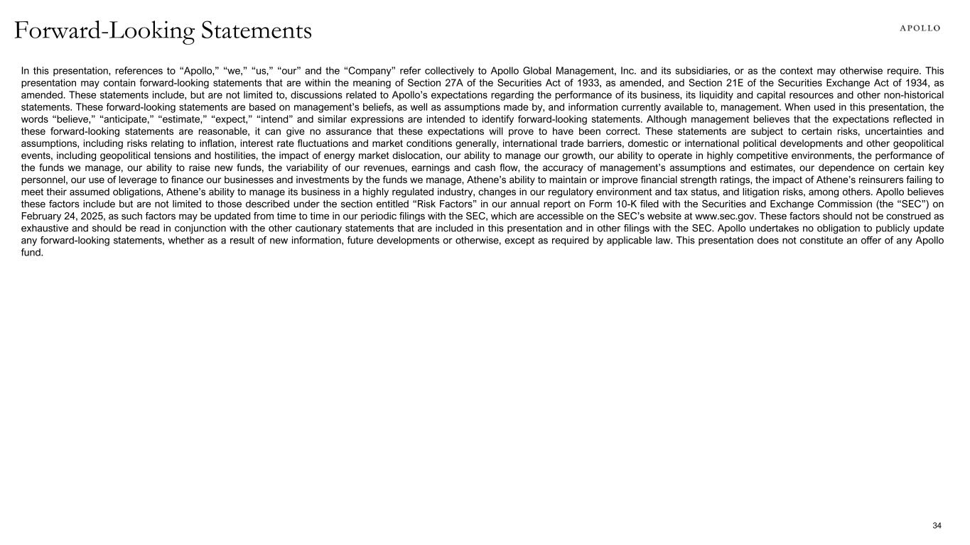In this presentation, references to “Apollo,” “we,” “us,” “our” and the “Company” refer collectively to Apollo Global Management, Inc. and its subsidiaries, or as the context may otherwise require. This presentation may contain forward-looking statements that are within the meaning of Section 27A of the Securities Act of 1933, as amended, and Section 21E of the Securities Exchange Act of 1934, as amended. These statements include, but are not limited to, discussions related to Apollo’s expectations regarding the performance of its business, its liquidity and capital resources and other non-historical statements. These forward-looking statements are based on management’s beliefs, as well as assumptions made by, and information currently available to, management. When used in this presentation, the words “believe,” “anticipate,” “estimate,” “expect,” “intend” and similar expressions are intended to identify forward-looking statements. Although management believes that the expectations reflected in these forward-looking statements are reasonable, it can give no assurance that these expectations will prove to have been correct. These statements are subject to certain risks, uncertainties and assumptions, including risks relating to inflation, interest rate fluctuations and market conditions generally, international trade barriers, domestic or international political developments and other geopolitical events, including geopolitical tensions and hostilities, the impact of energy market dislocation, our ability to manage our growth, our ability to operate in highly competitive environments, the performance of the funds we manage, our ability to raise new funds, the variability of our revenues, earnings and cash flow, the accuracy of management’s assumptions and estimates, our dependence on certain key personnel, our use of leverage to finance our businesses and investments by the funds we manage, Athene’s ability to maintain or improve financial strength ratings, the impact of Athene’s reinsurers failing to meet their assumed obligations, Athene’s ability to manage its business in a highly regulated industry, changes in our regulatory environment and tax status, and litigation risks, among others. Apollo believes these factors include but are not limited to those described under the section entitled “Risk Factors” in our annual report on Form 10-K filed with the Securities and Exchange Commission (the “SEC”) on February 24, 2025, as such factors may be updated from time to time in our periodic filings with the SEC, which are accessible on the SEC’s website at www.sec.gov. These factors should not be construed as exhaustive and should be read in conjunction with the other cautionary statements that are included in this presentation and in other filings with the SEC. Apollo undertakes no obligation to publicly update any forward-looking statements, whether as a result of new information, future developments or otherwise, except as required by applicable law. This presentation does not constitute an offer of any Apollo fund. 34 Forward-Looking Statements